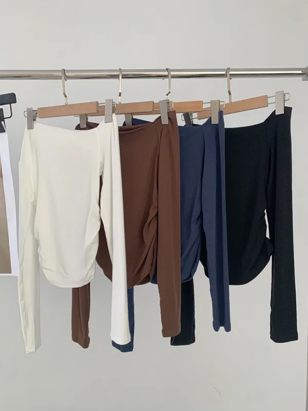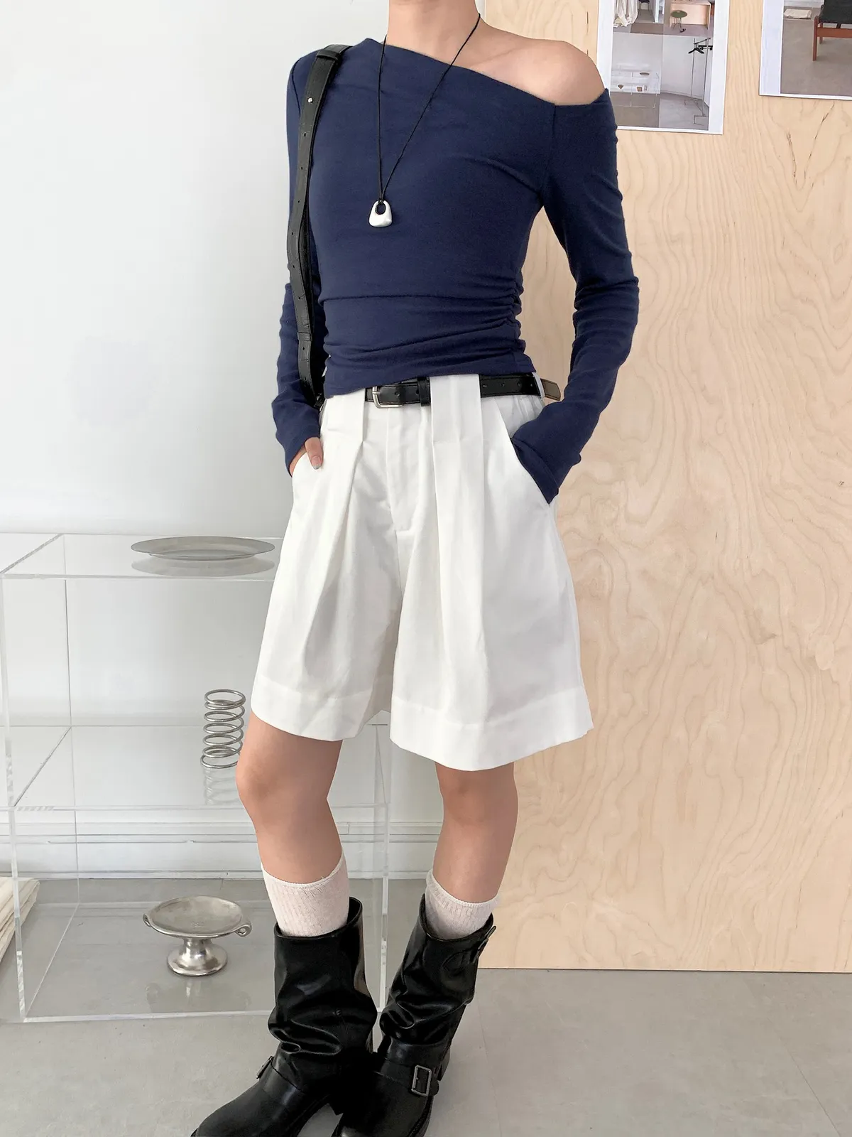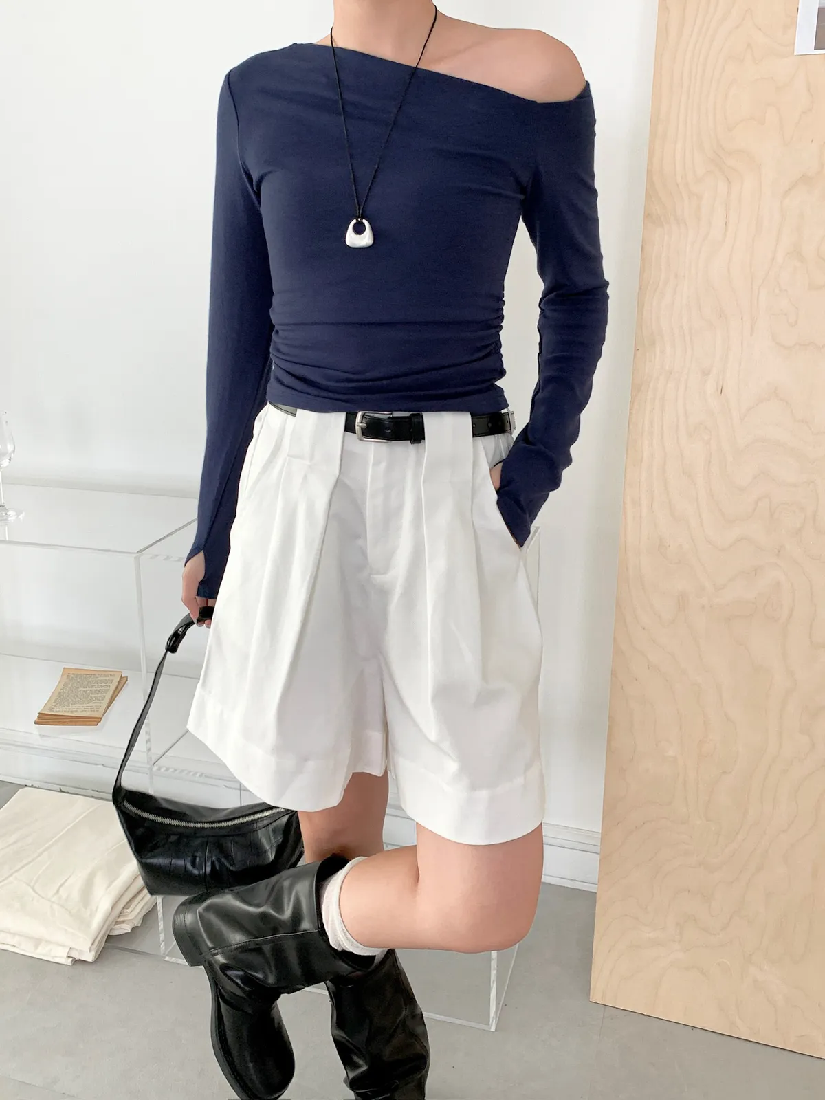 斜肩領讓肩膀更立體小露性感 短版長度側邊抓皺+收腰板型
