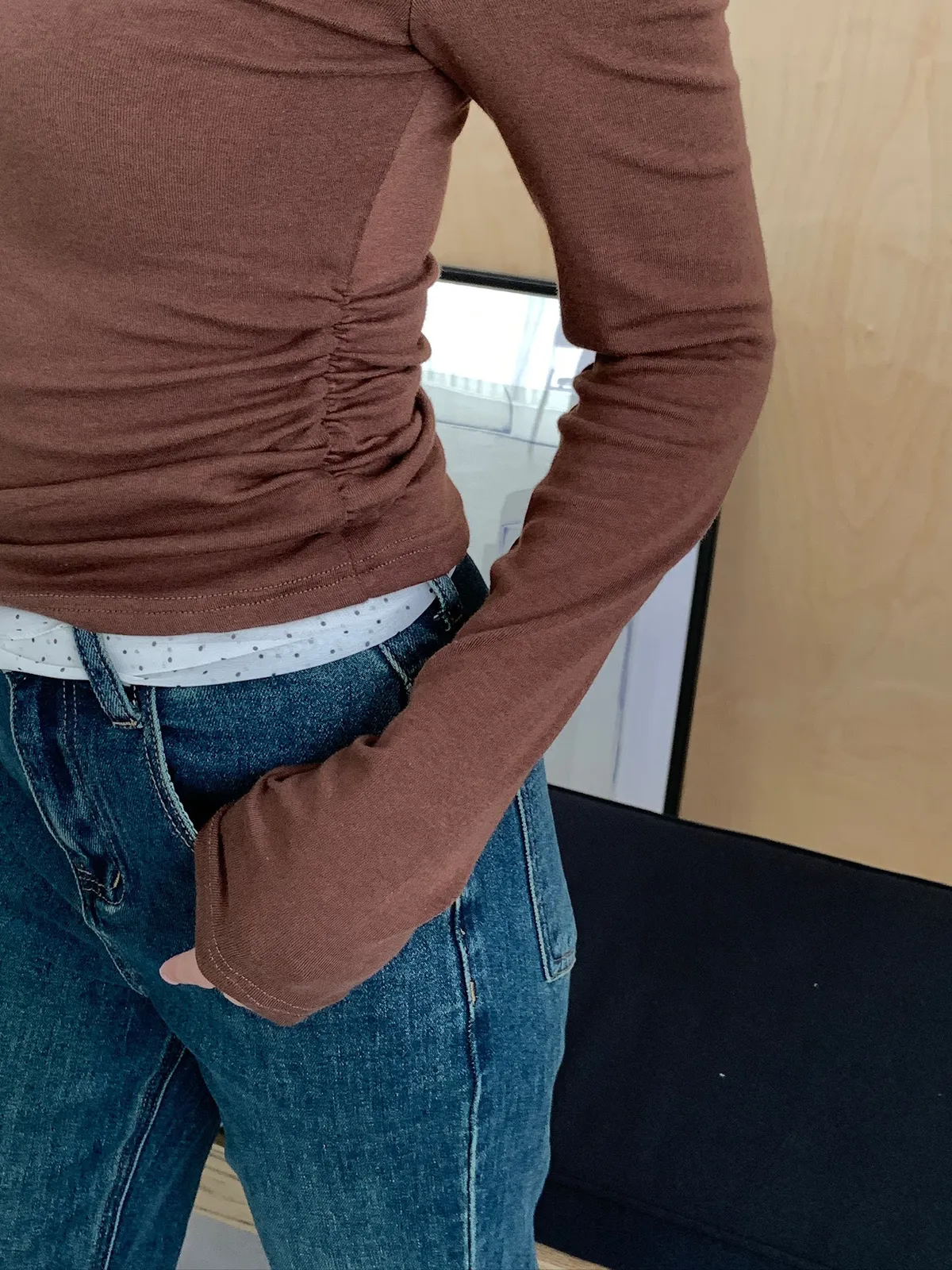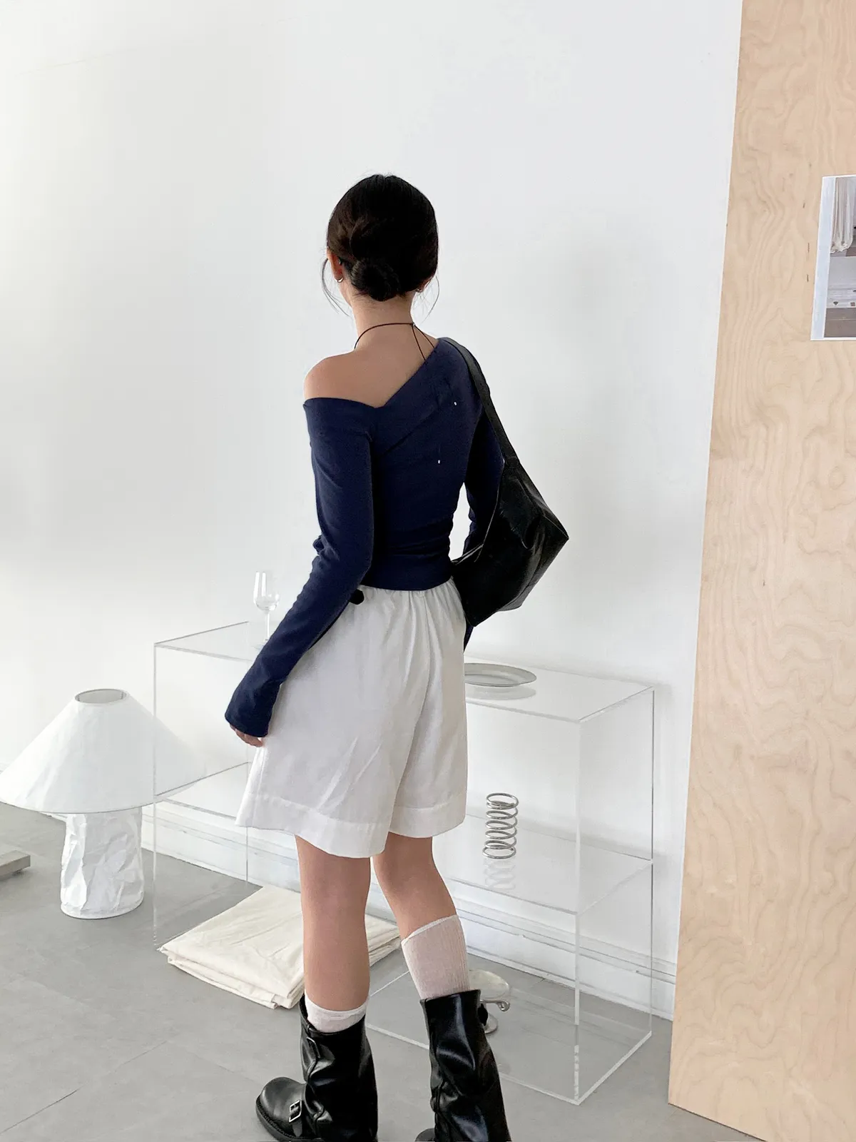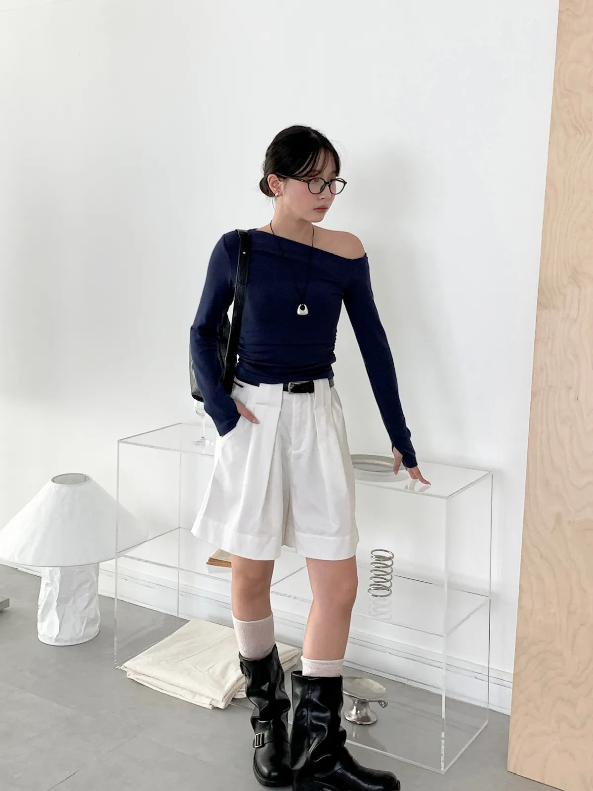 斜肩領讓肩膀更立體小露性感 短版長度側邊抓皺+收腰板型
