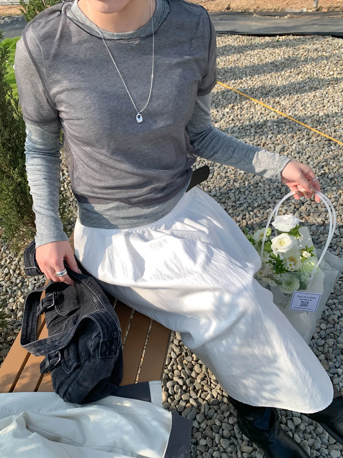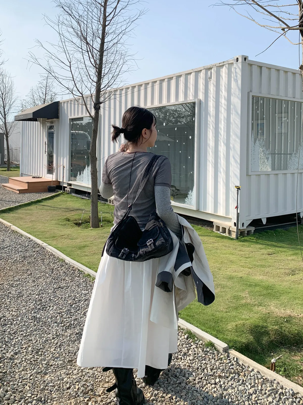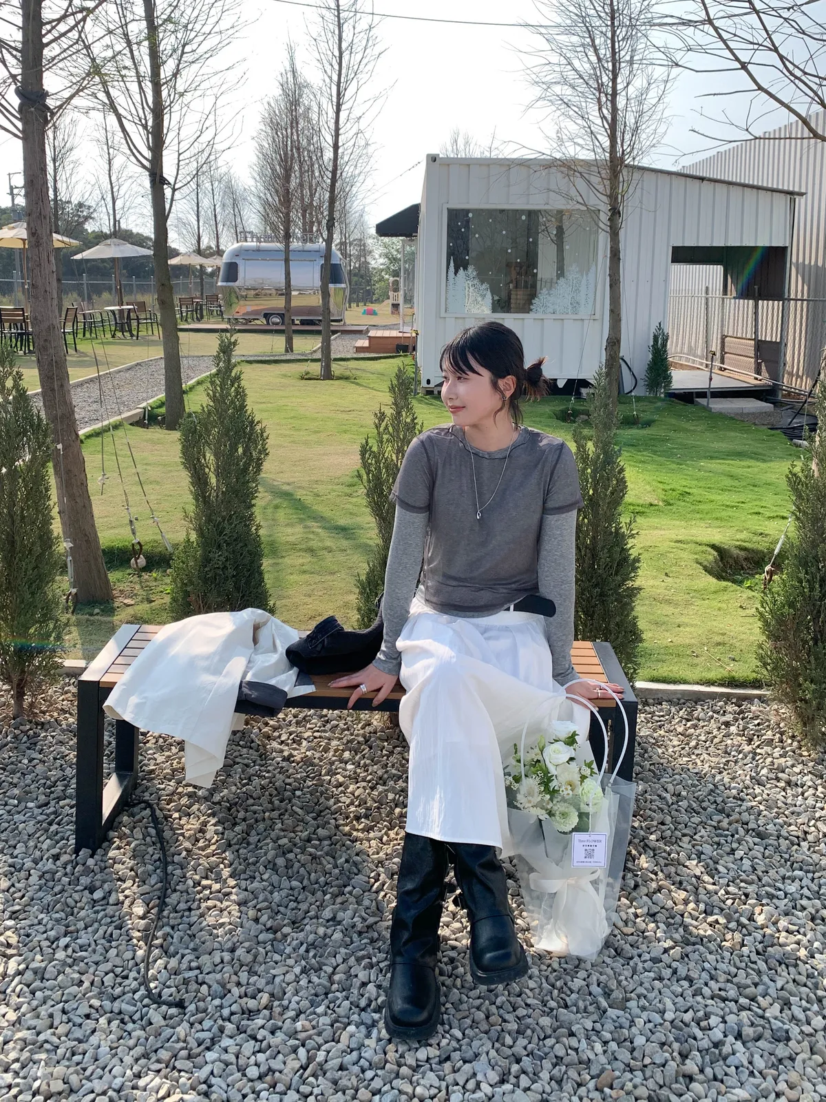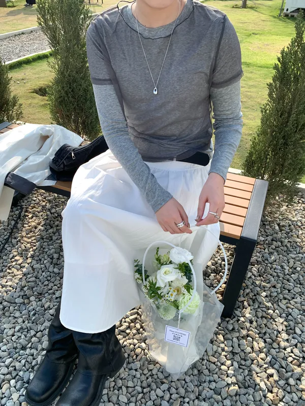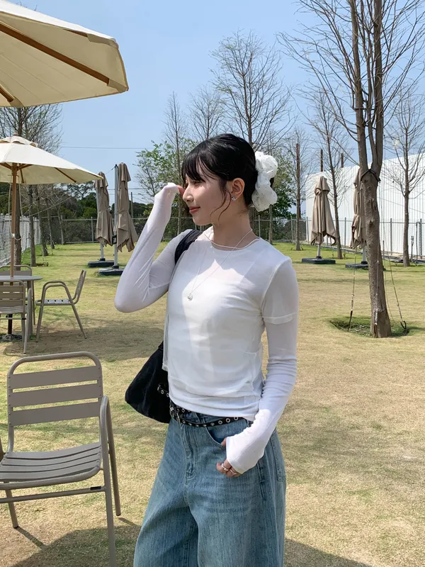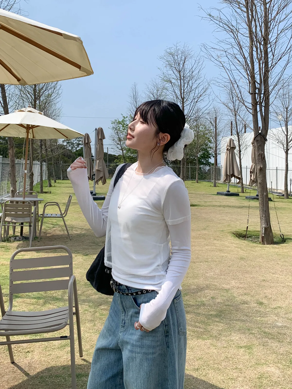 (上衣的透紗設計微透肌膚,搭配短袖內襯自然修飾身形,整體層次感明顯又有日系氛圍)