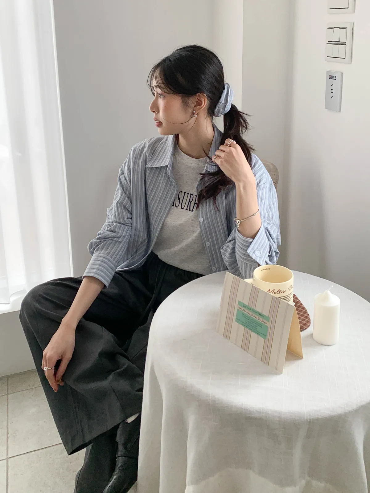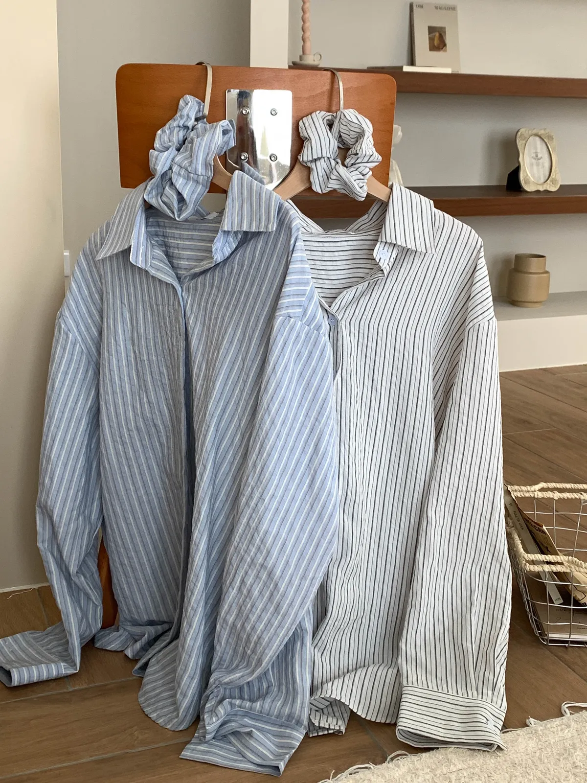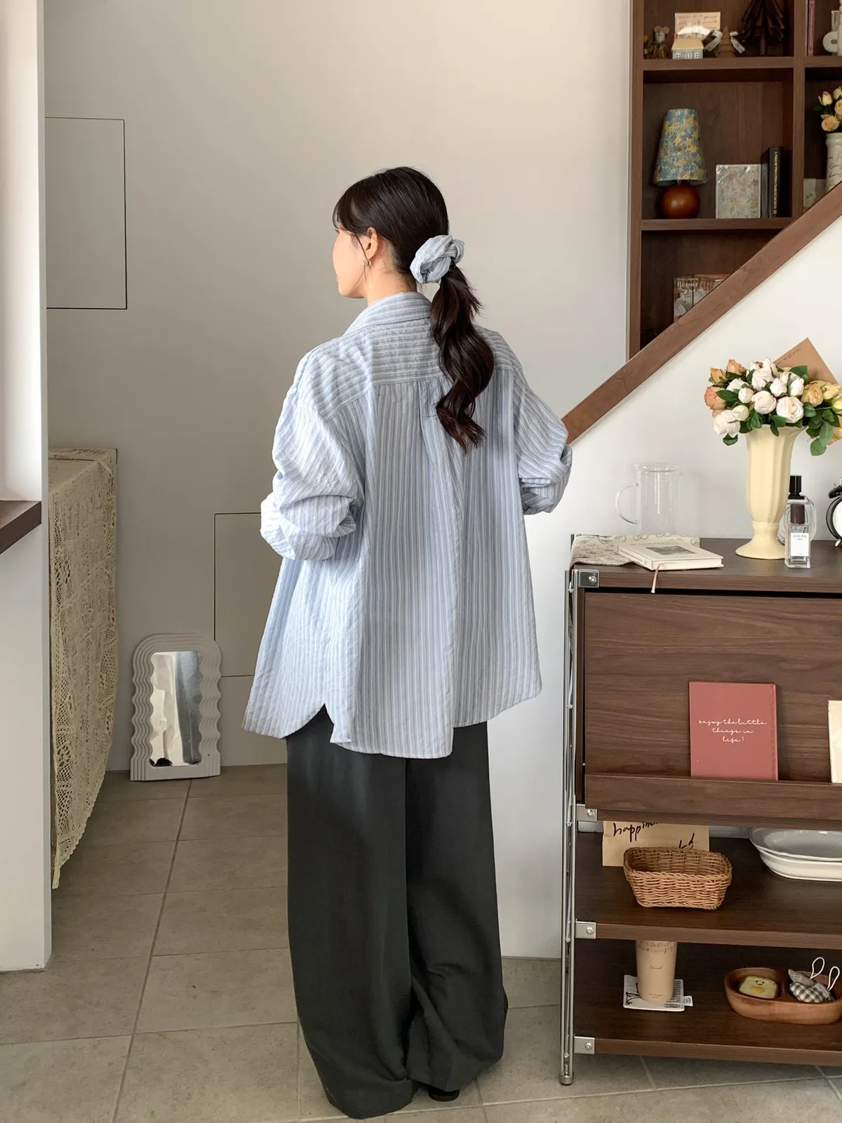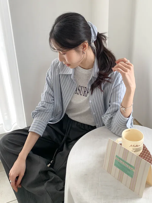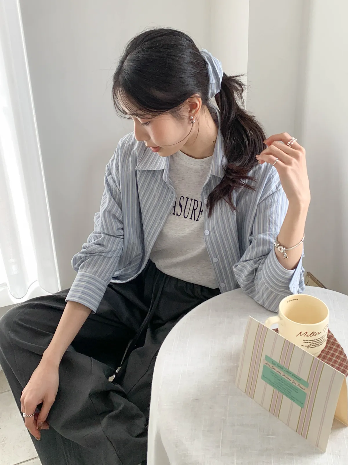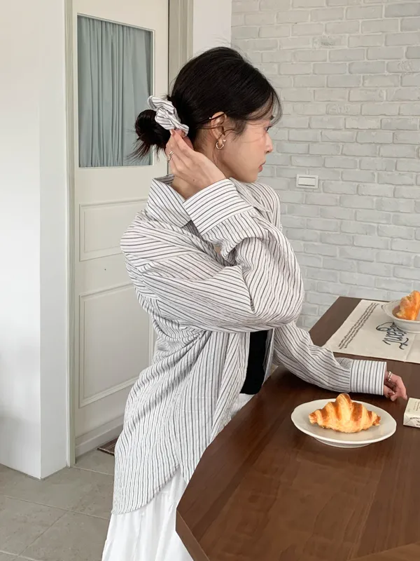 (穿起來肩袖長偏長胸寬寬鬆,透肌感條紋讓造型更有層次感,附贈的髮圈也很可愛)