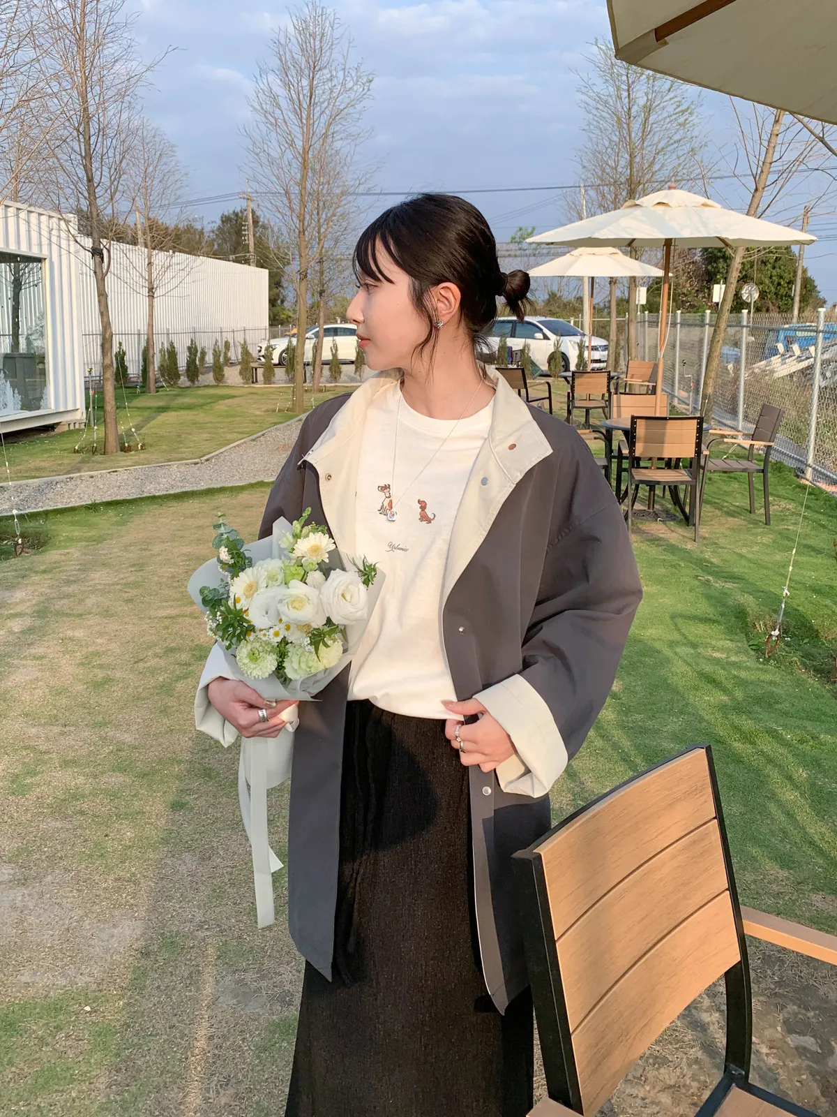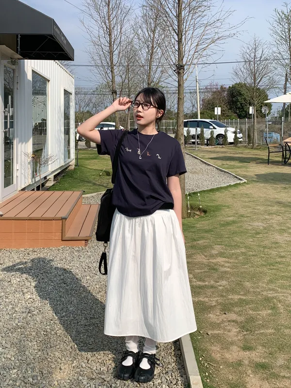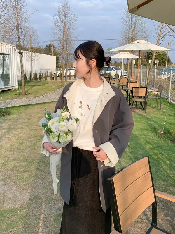 (肩線微落肩,整體略寬鬆,袖長自然落在手臂中段,小巧身形穿起來反而更可愛)