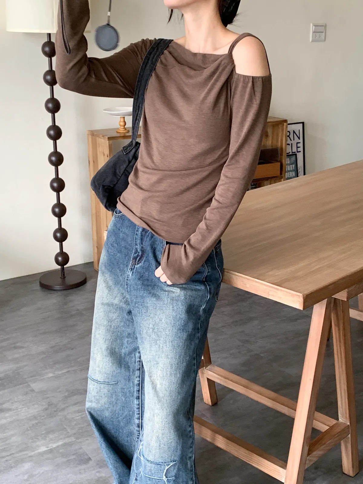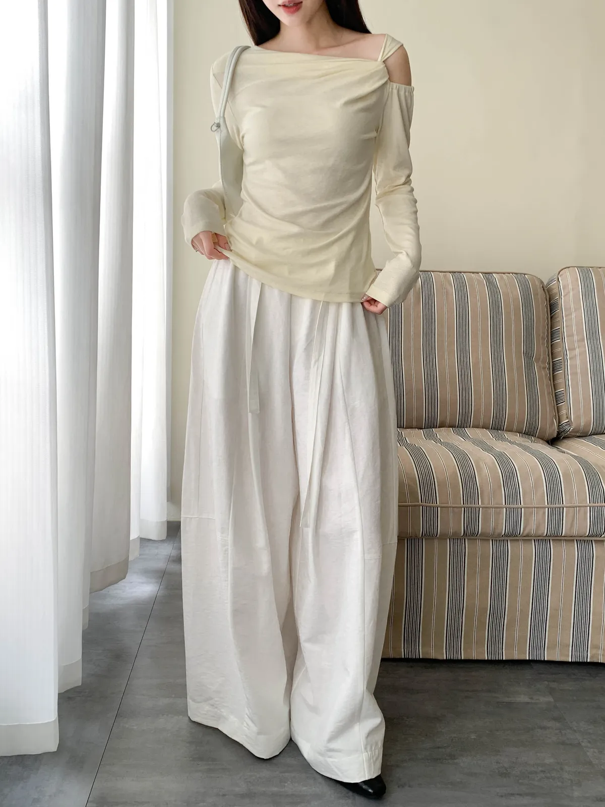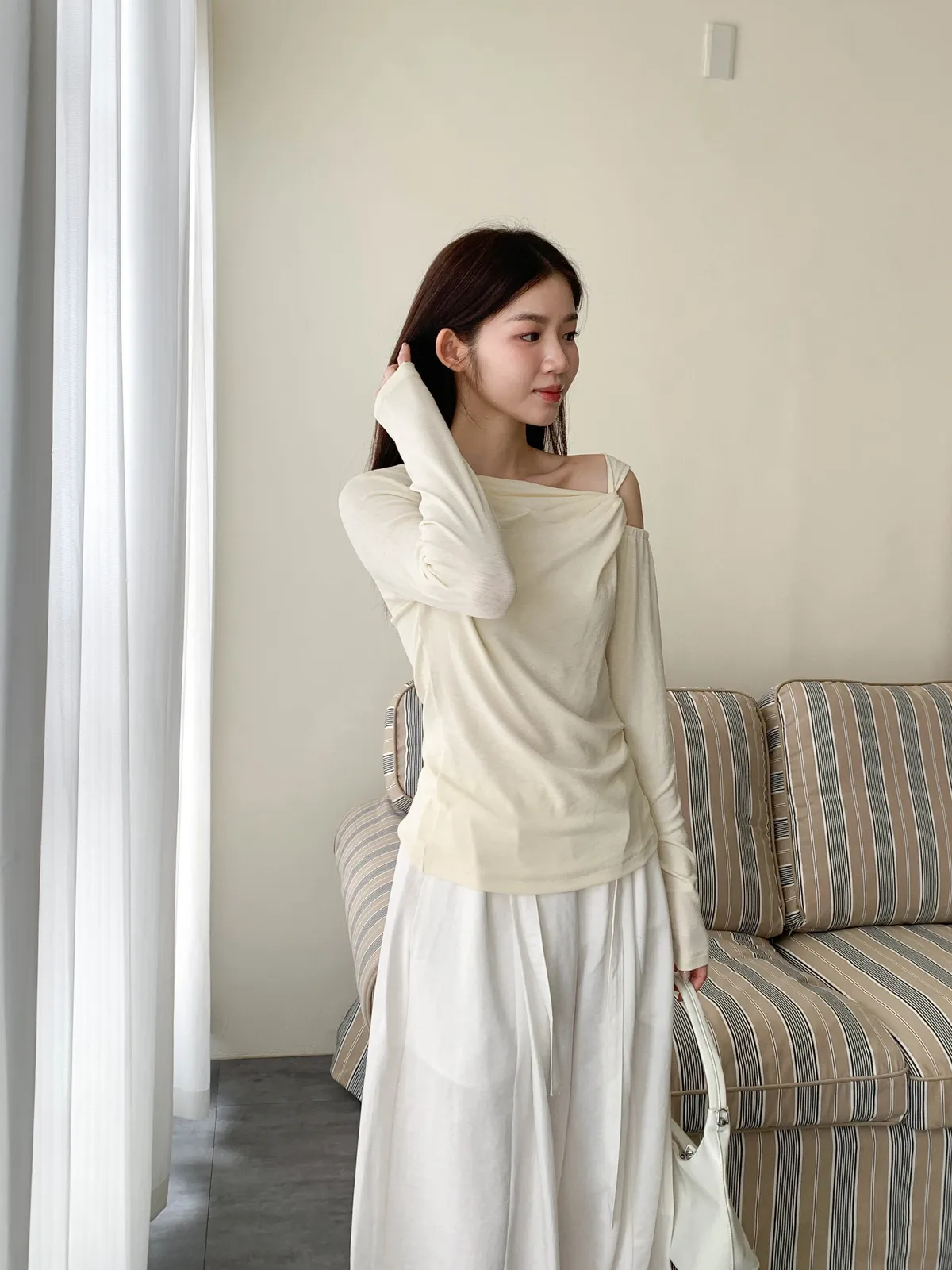 扭結斜肩設計 打造隨性感的上身線條