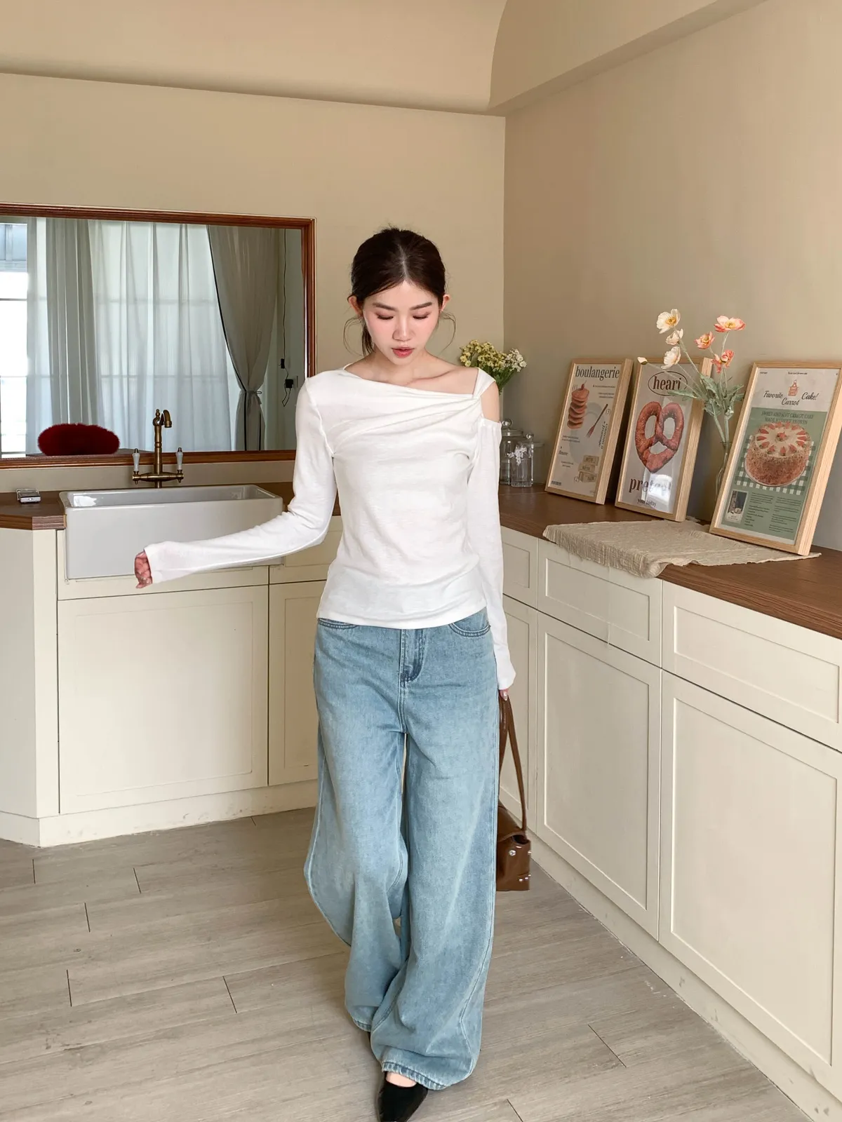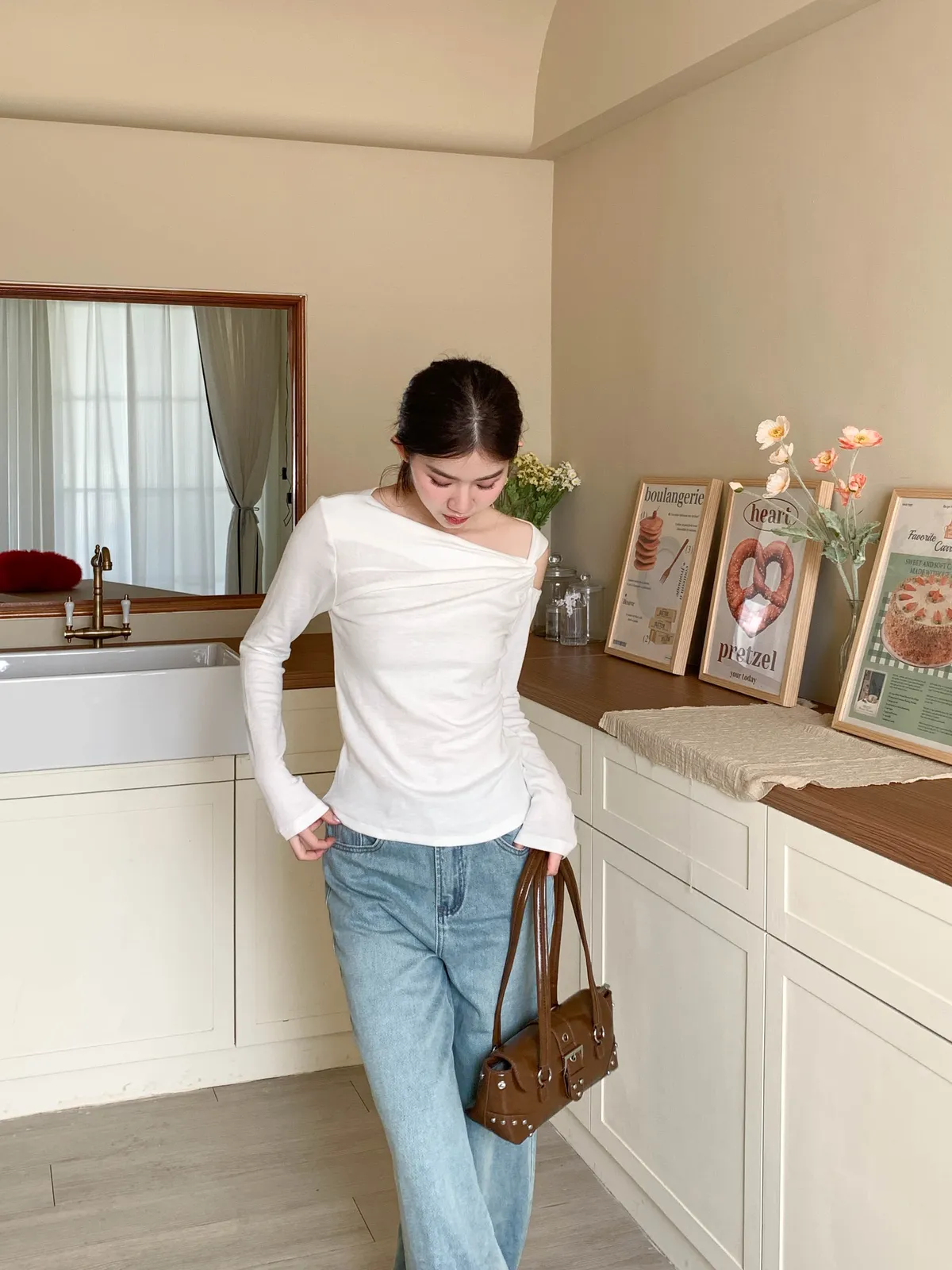 (斜裁挖肩設計增添小巧個性,小個子穿起來比例俐落,休閒又帶點時髦感)