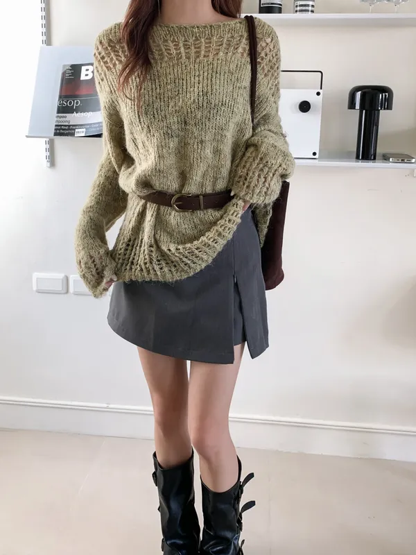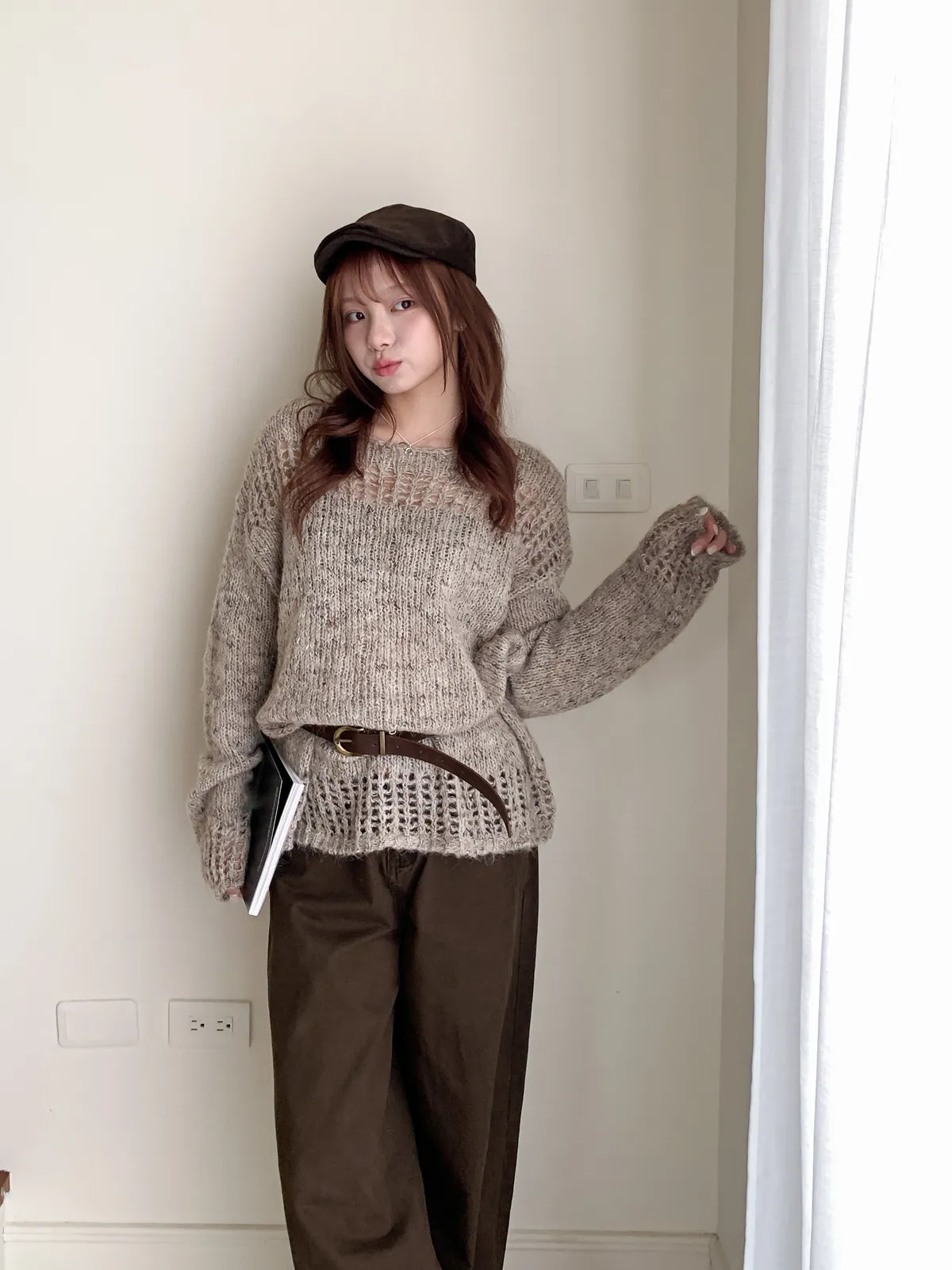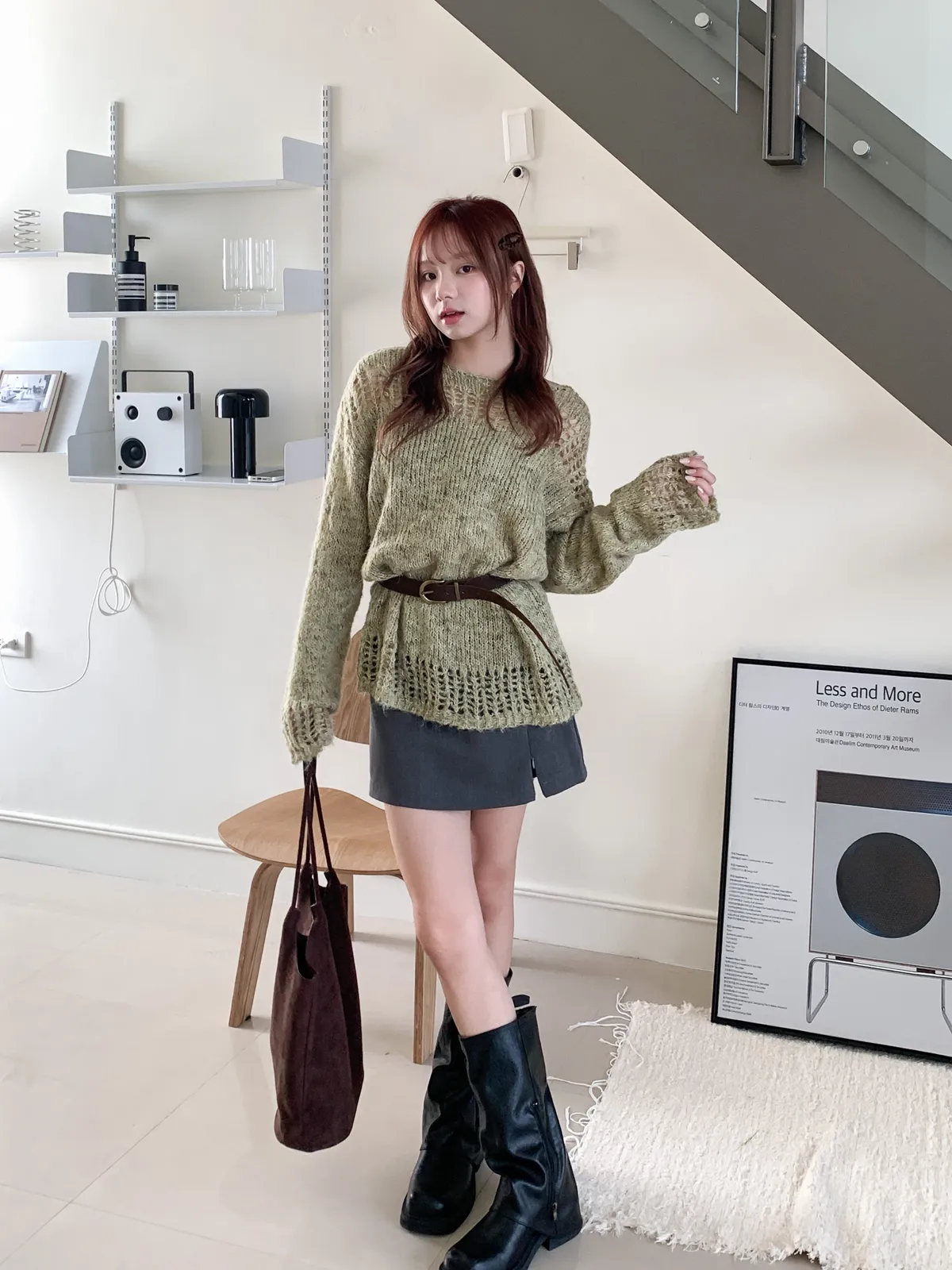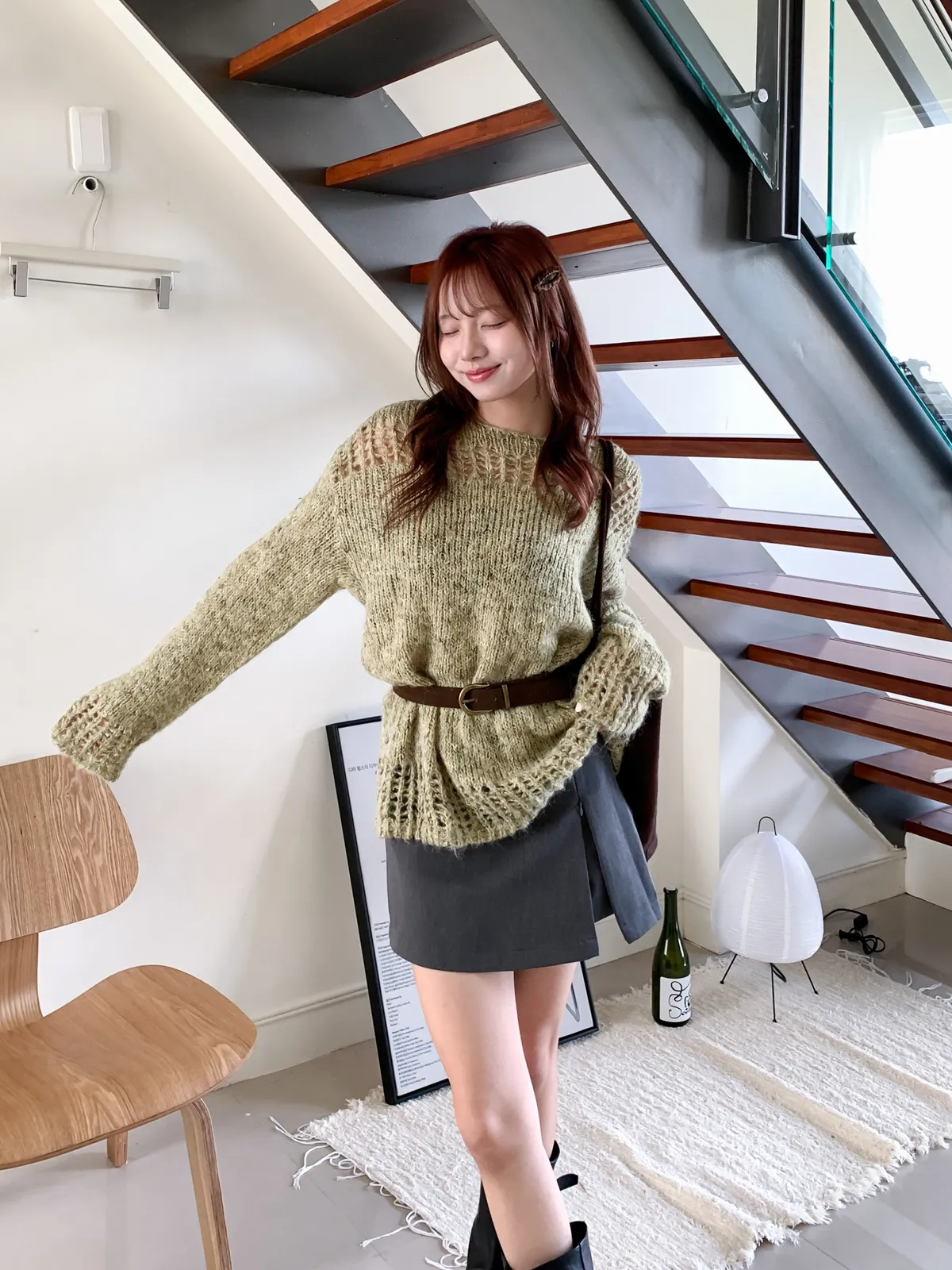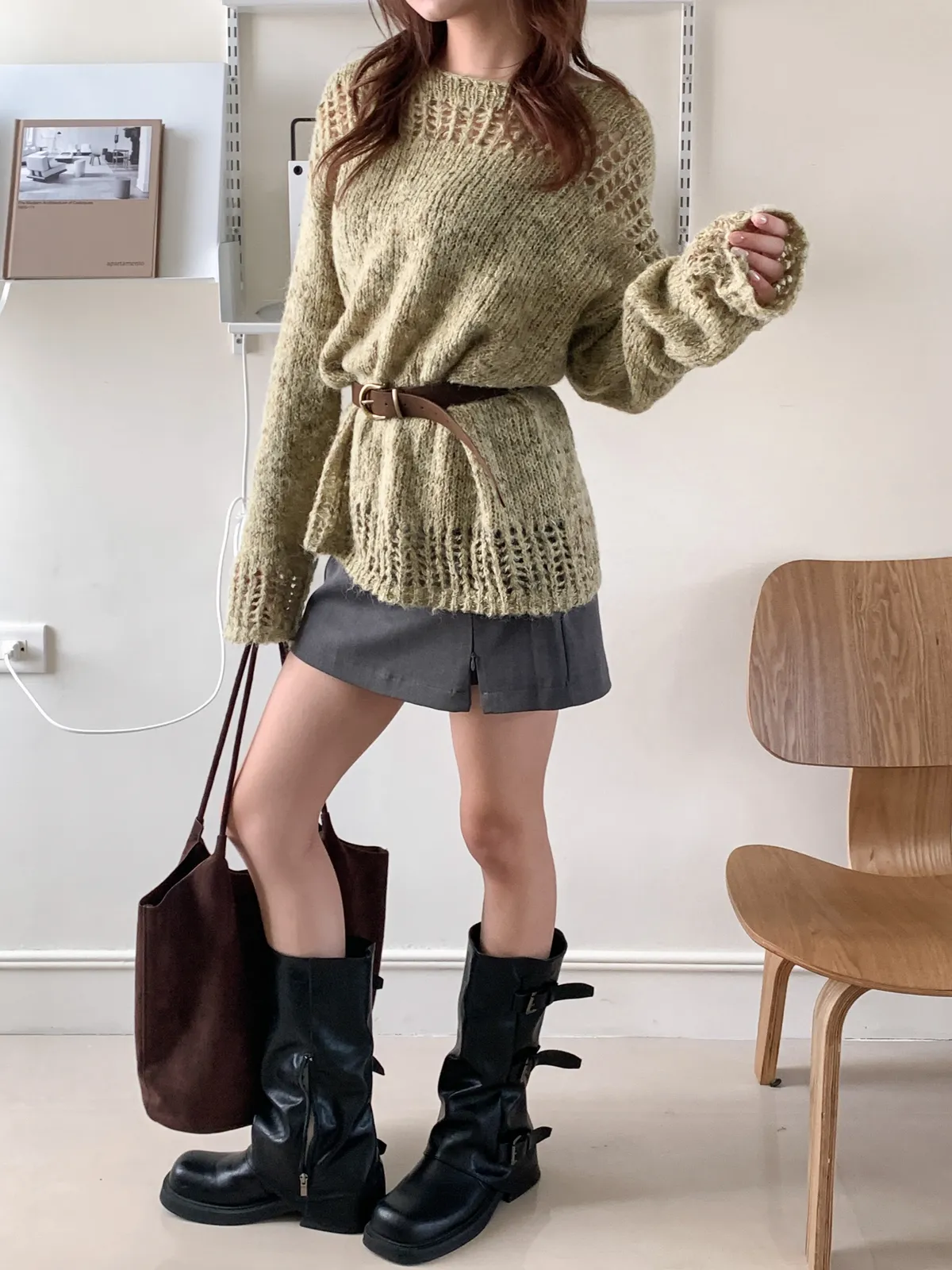掉進針織夢境|休閒簍空毛線上衣(附皮帶)