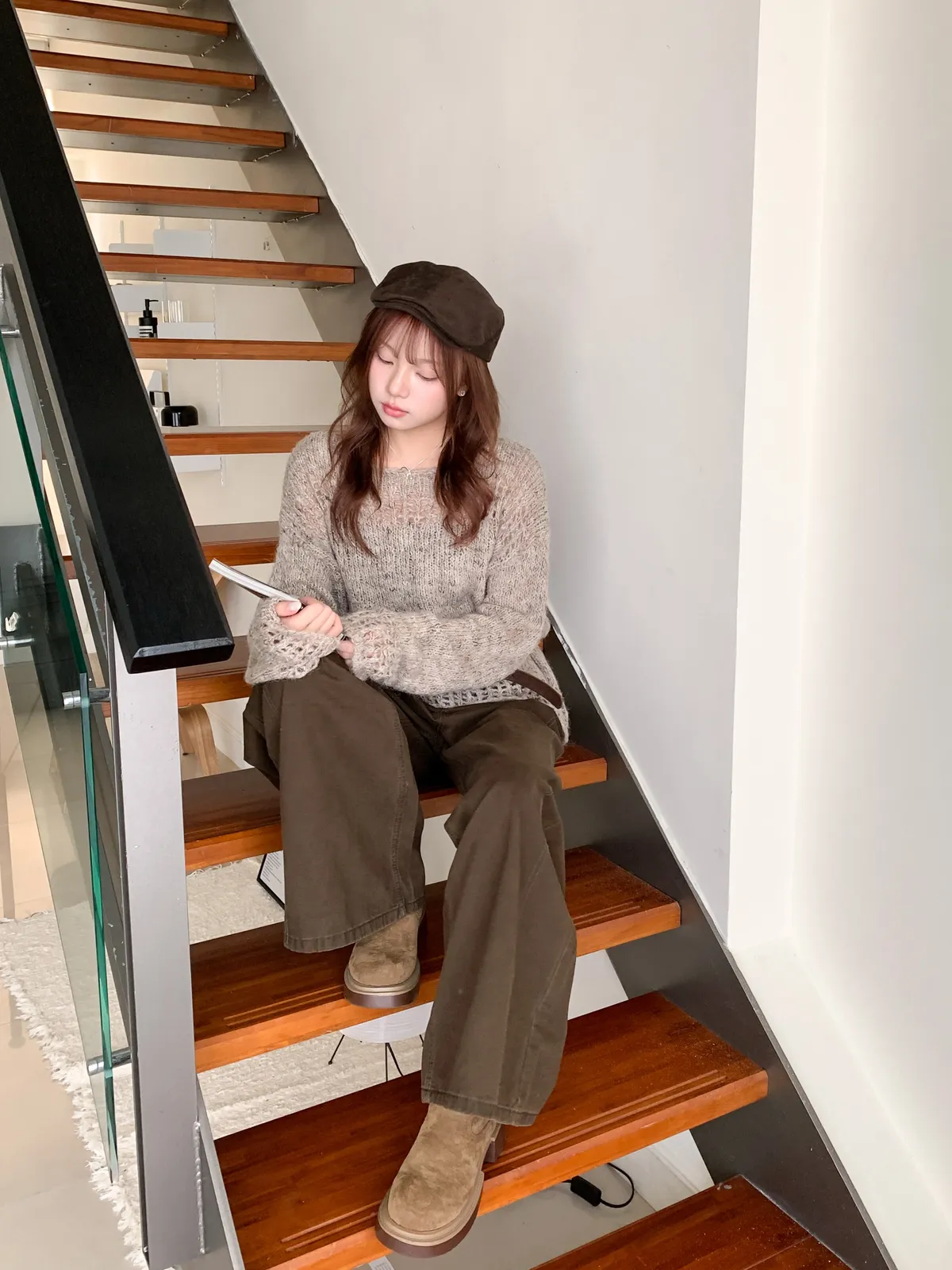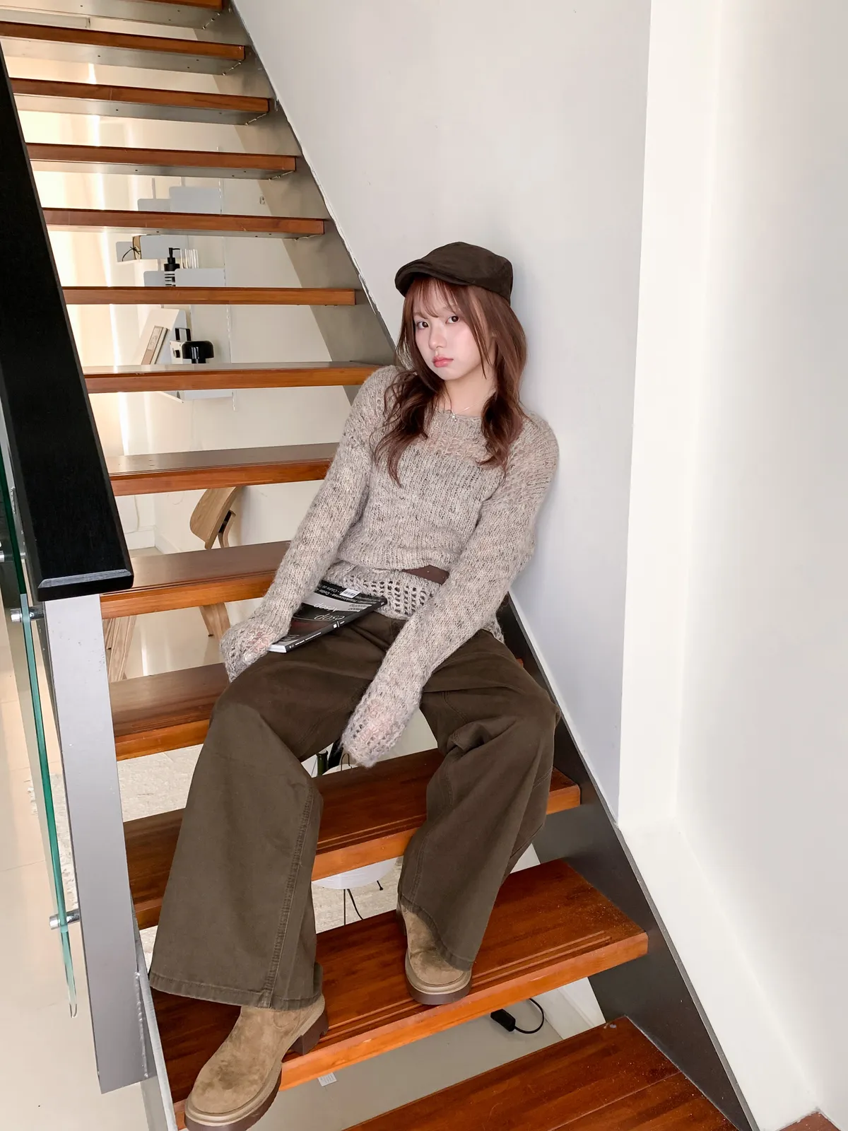 搭配咖色麂皮皮帶質感加分 整件做混色針織