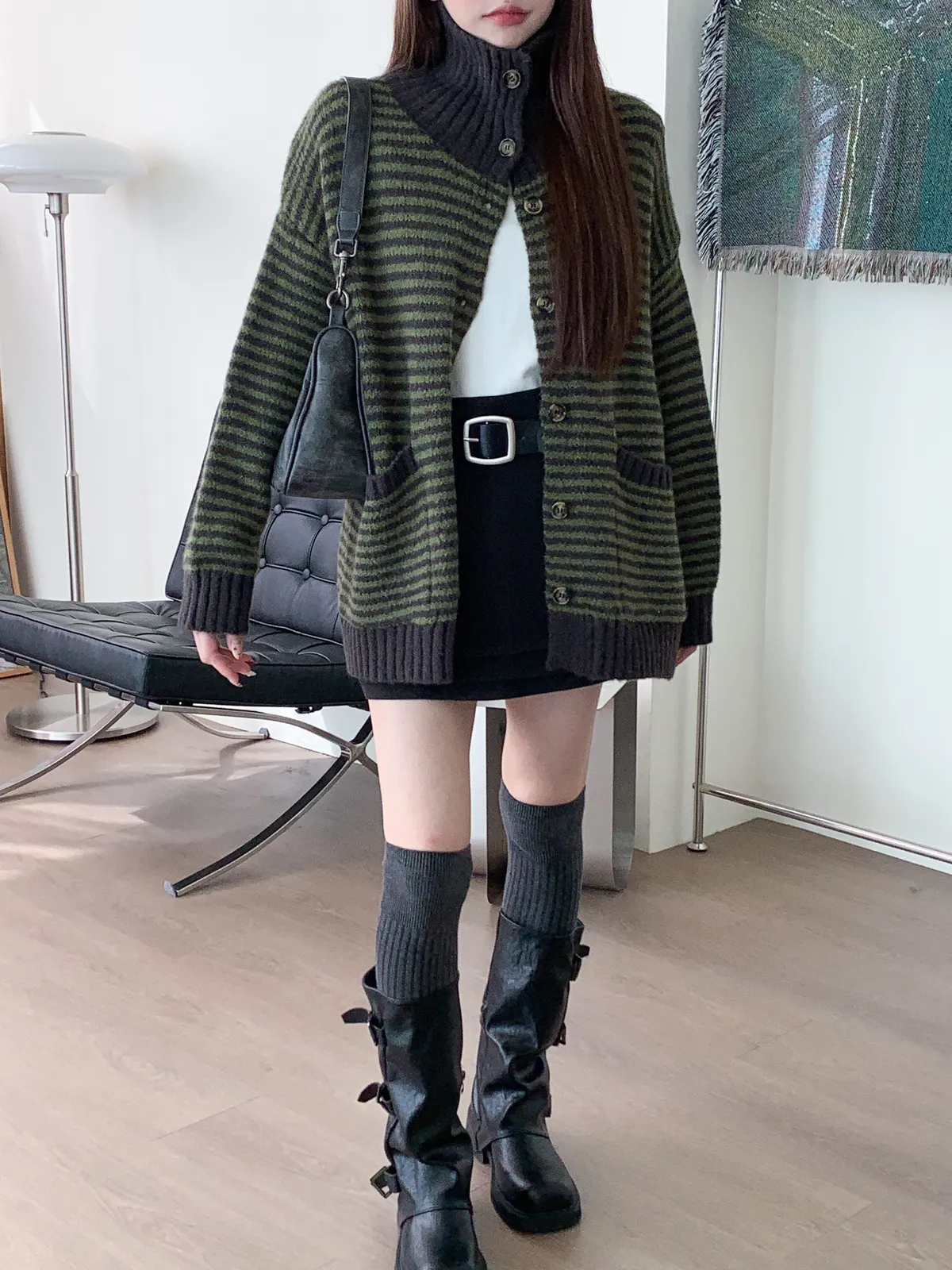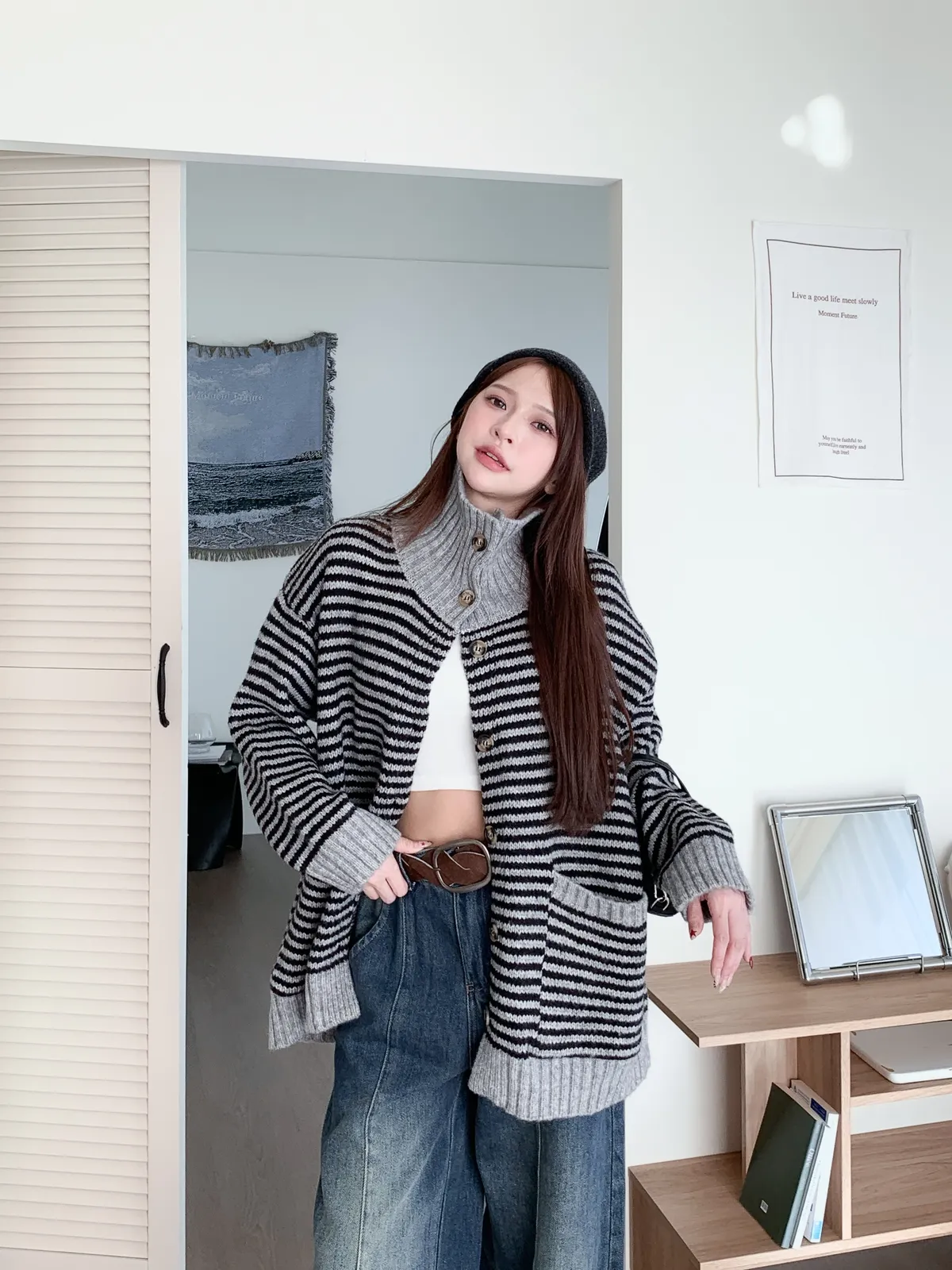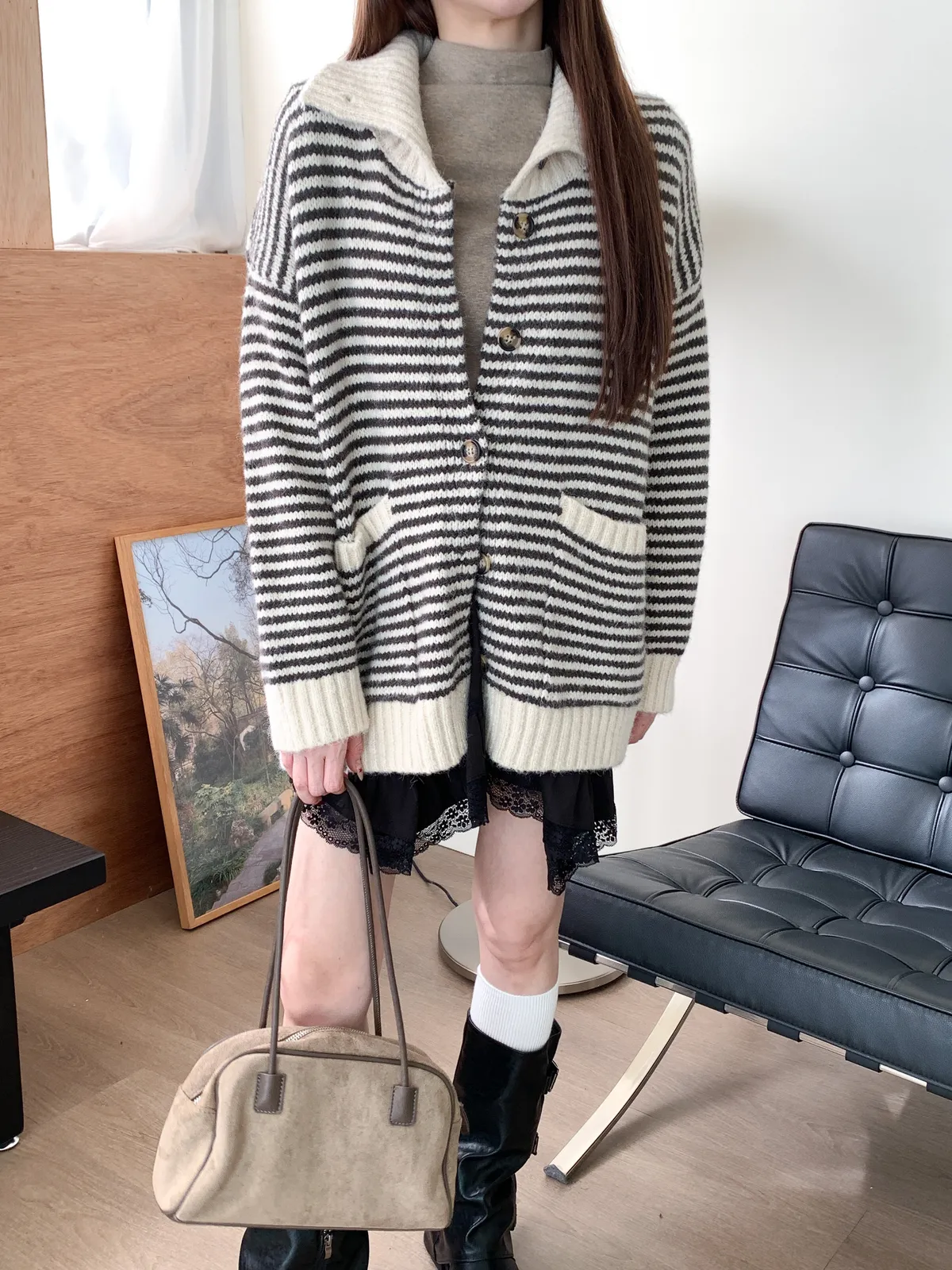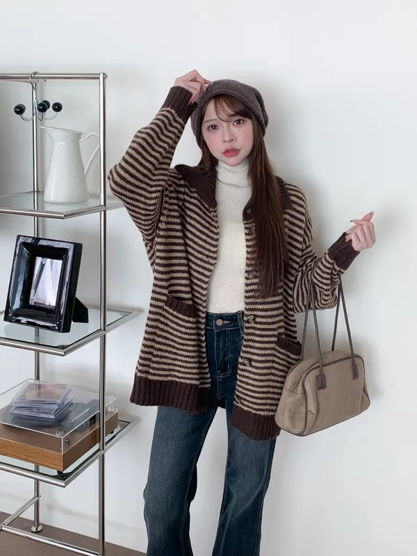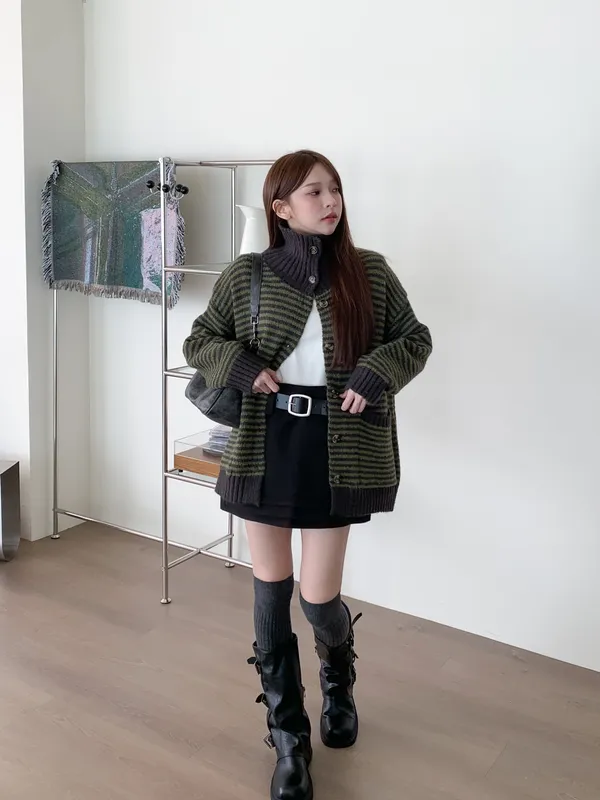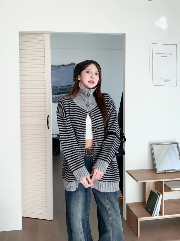 森系氣質|翻領條紋撞色針織長袖