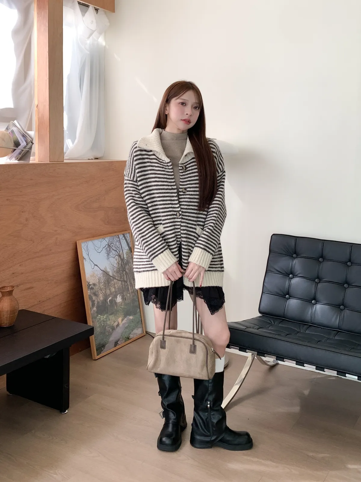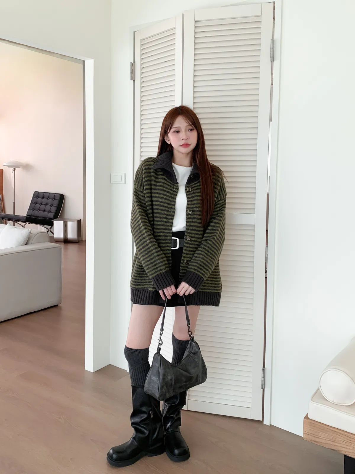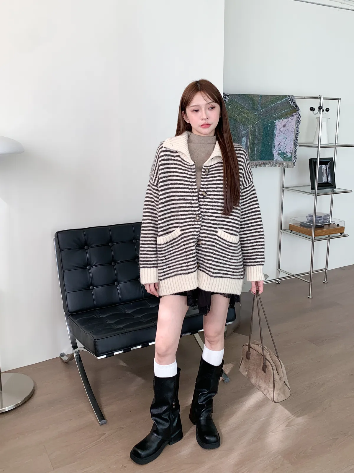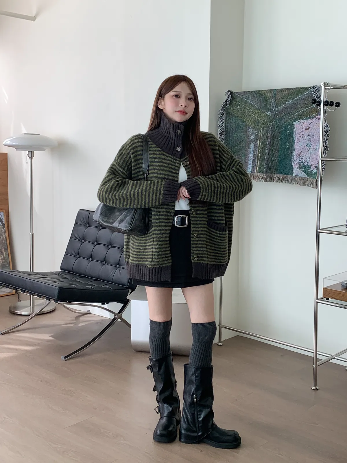 森系氣質|翻領條紋撞色針織長袖