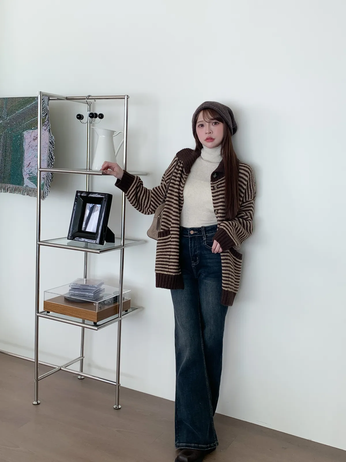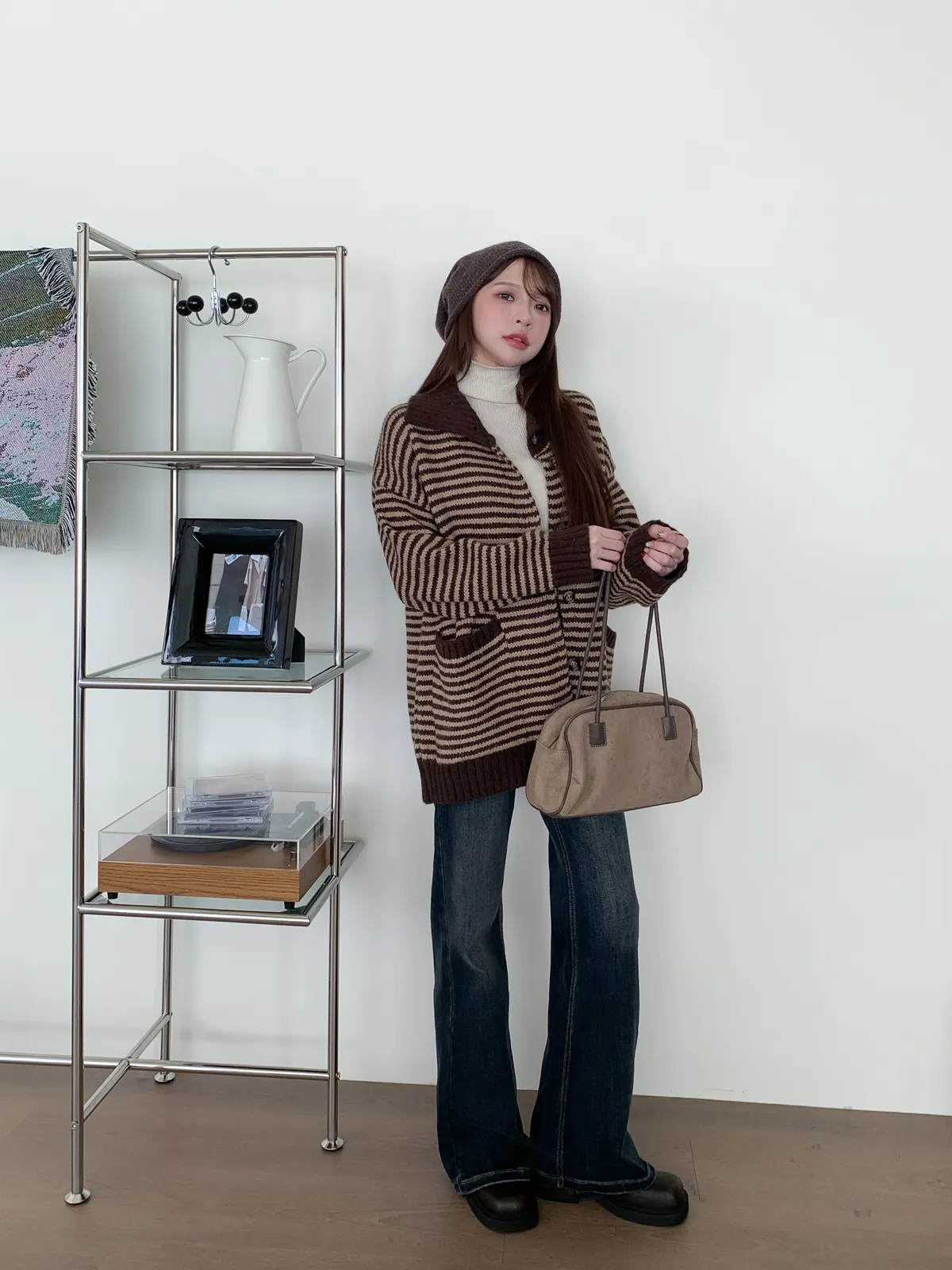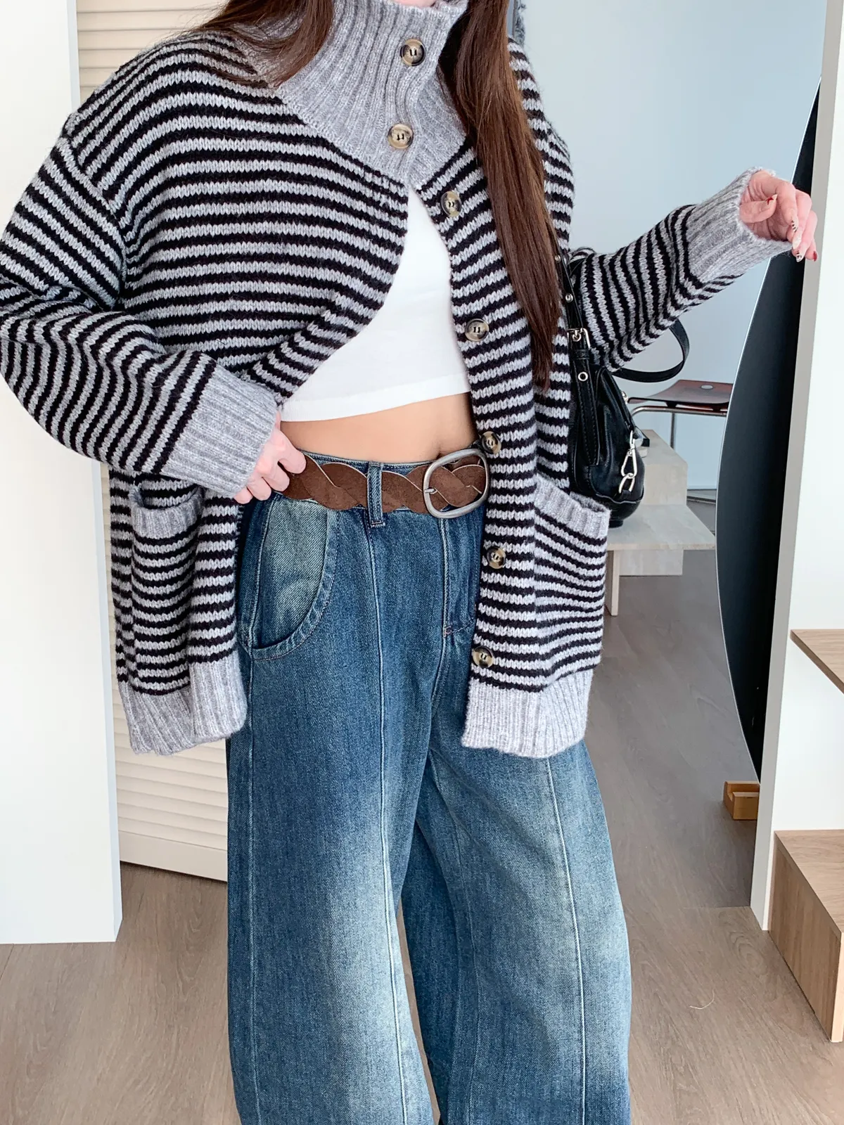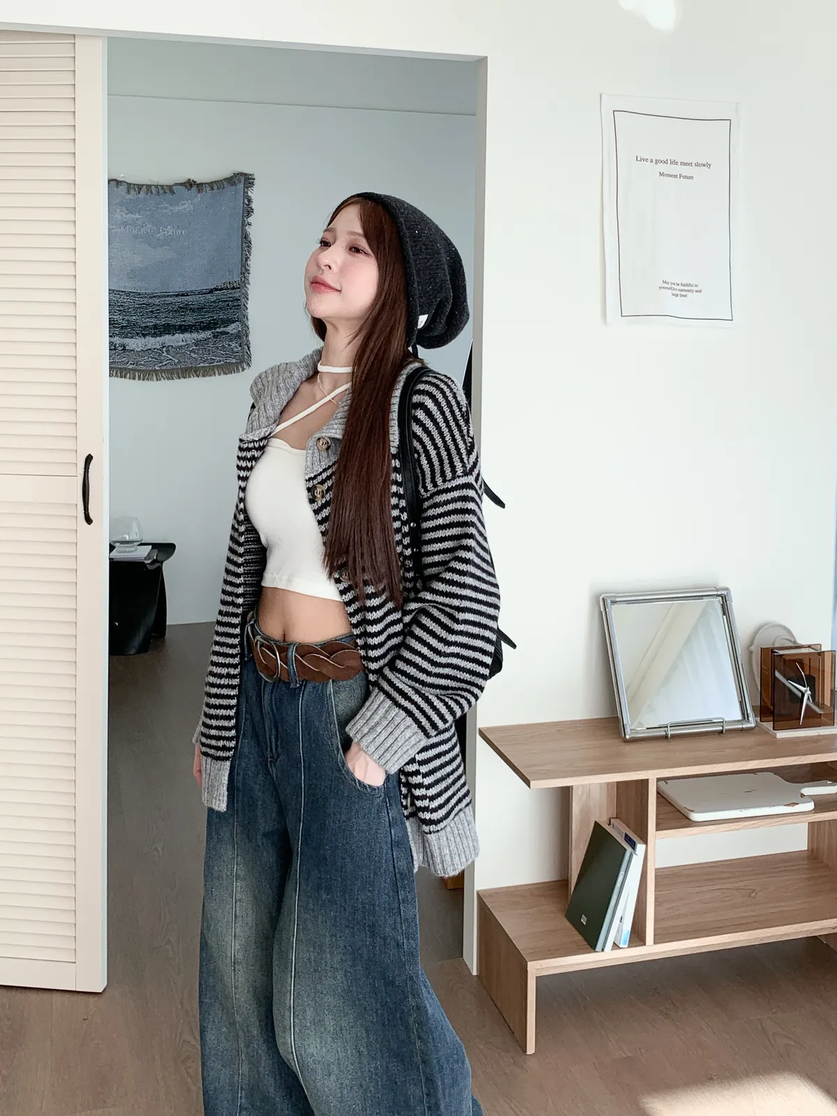 森系氣質|翻領條紋撞色針織長袖