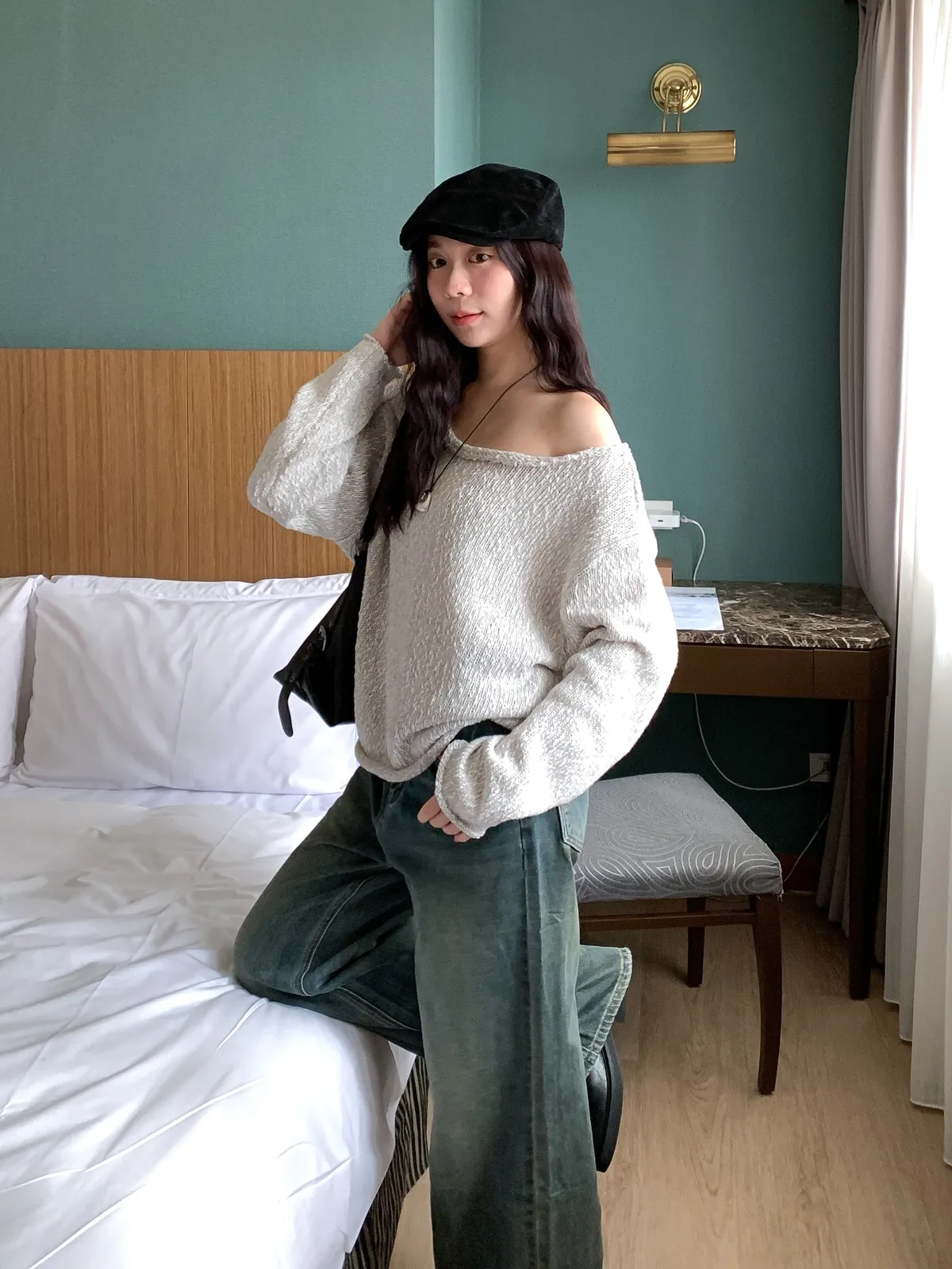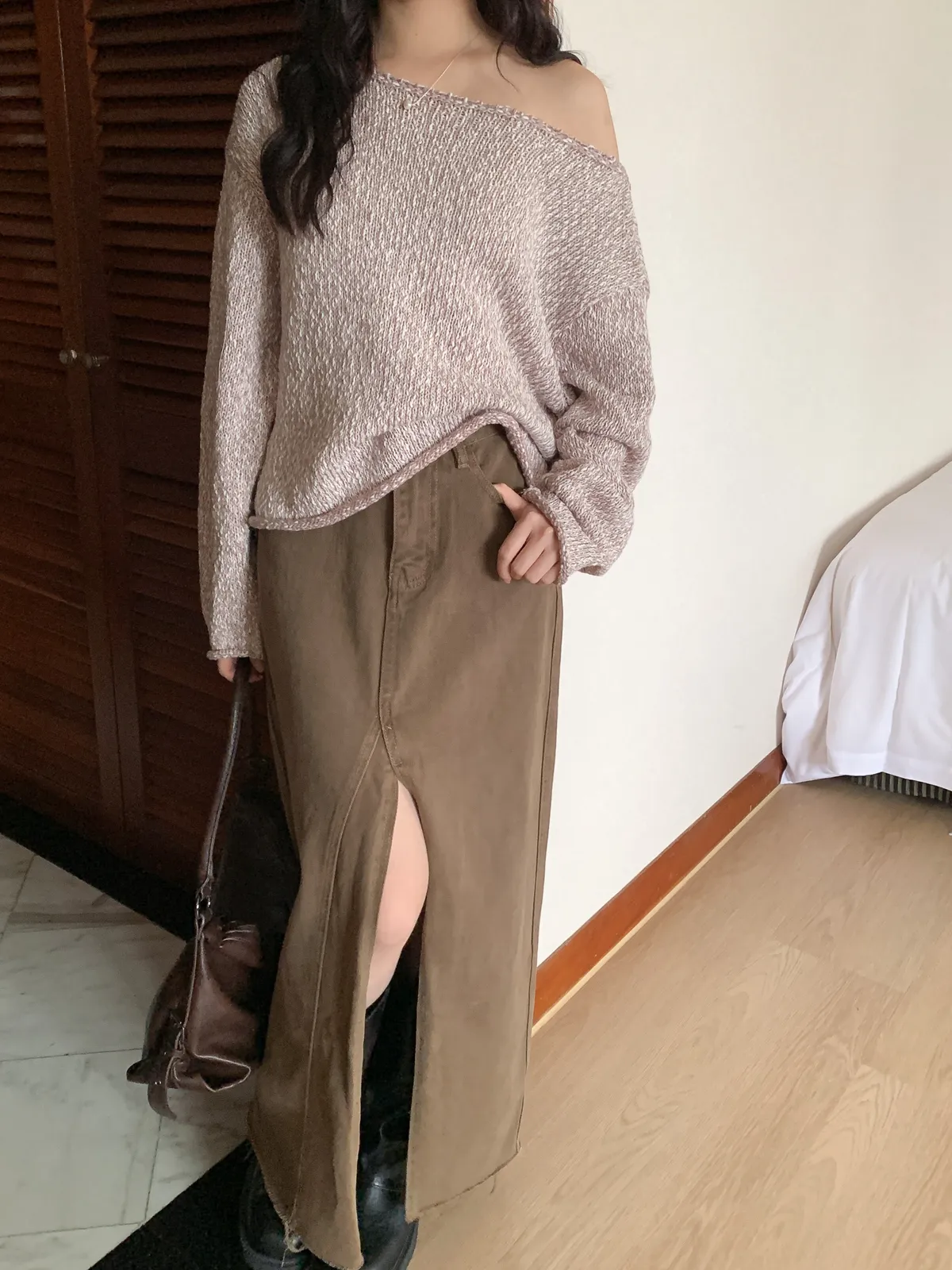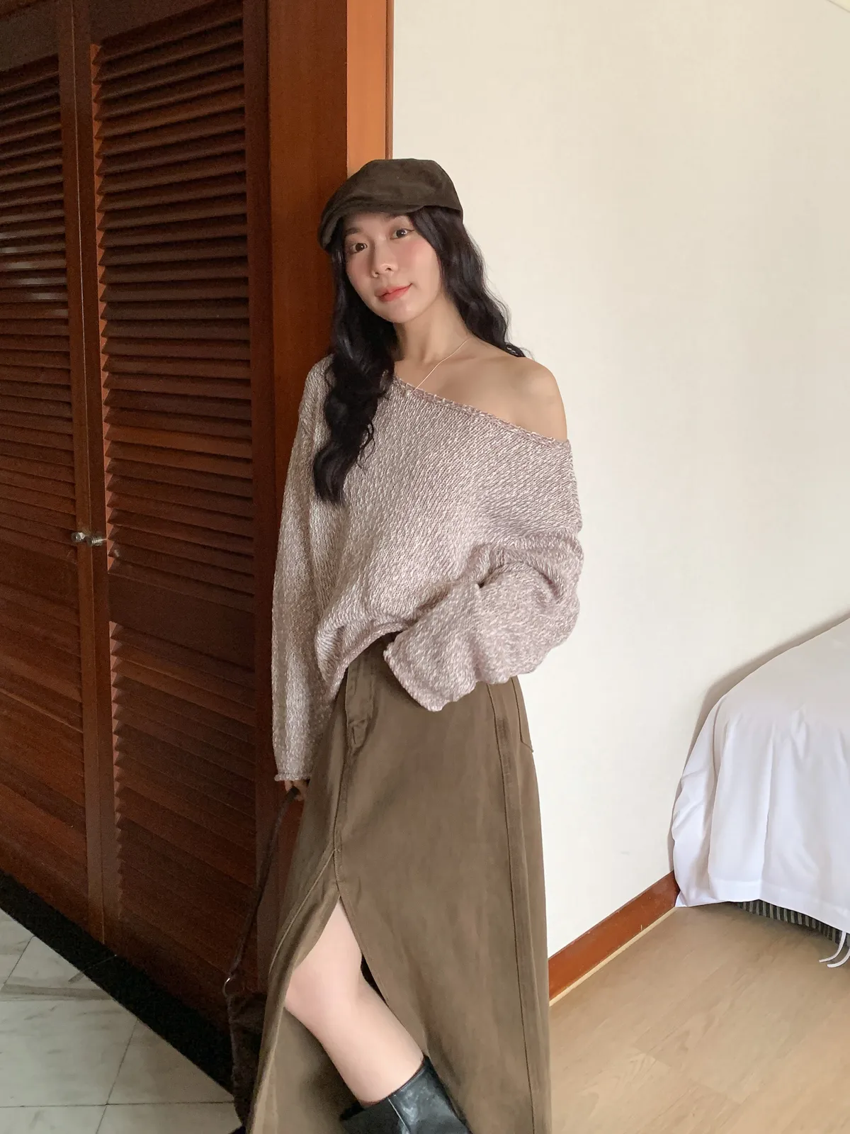 捲邊設計針織上衣 船領大領口可拉斜肩