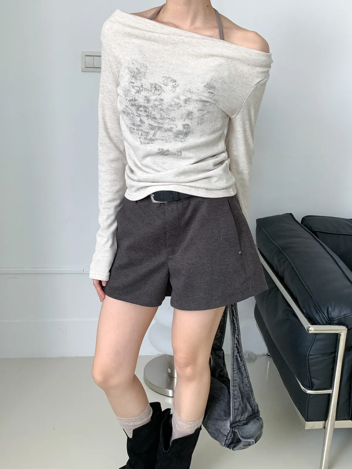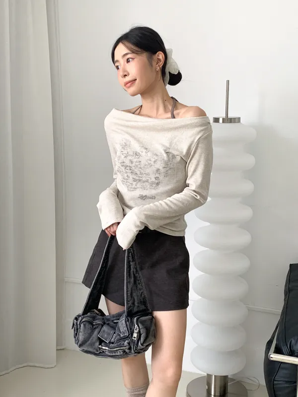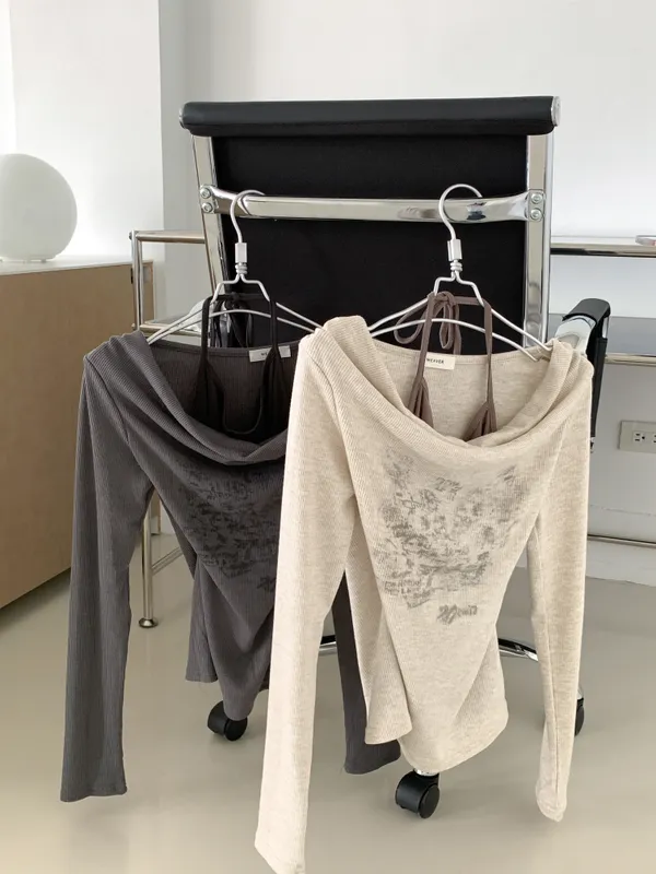 韓系初秋設計感/兩件式綁帶一字領上衣