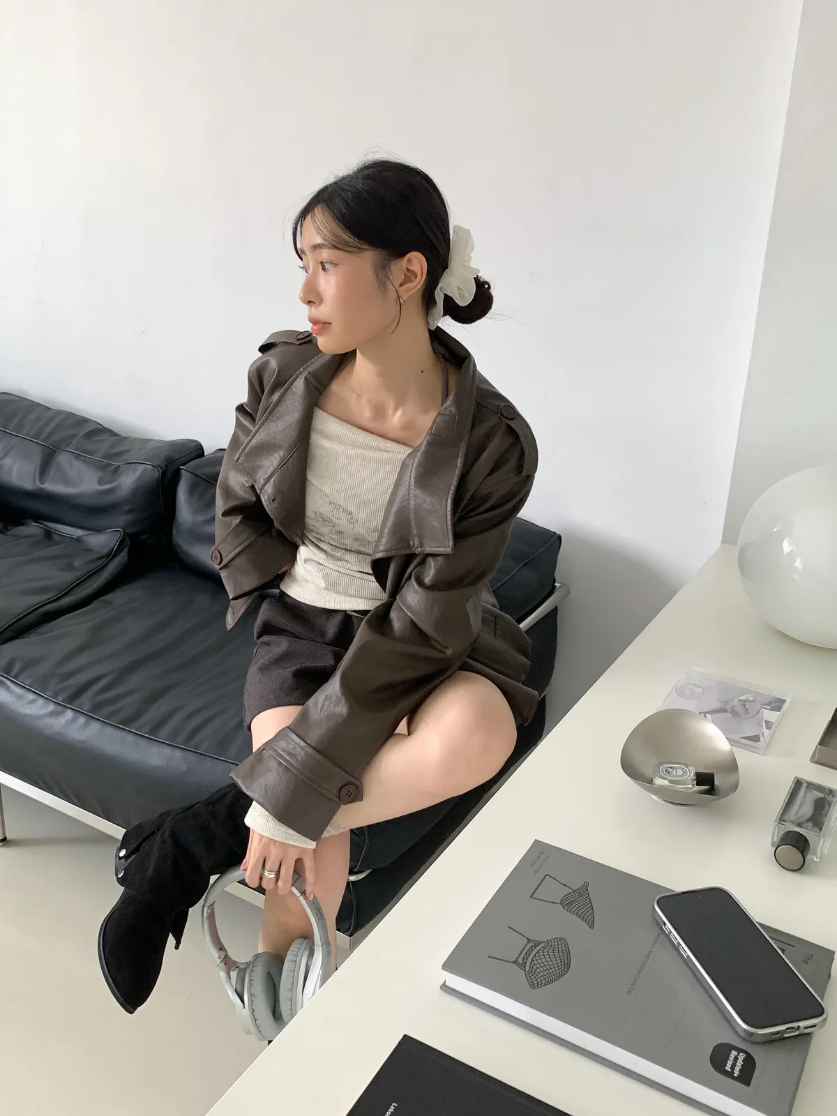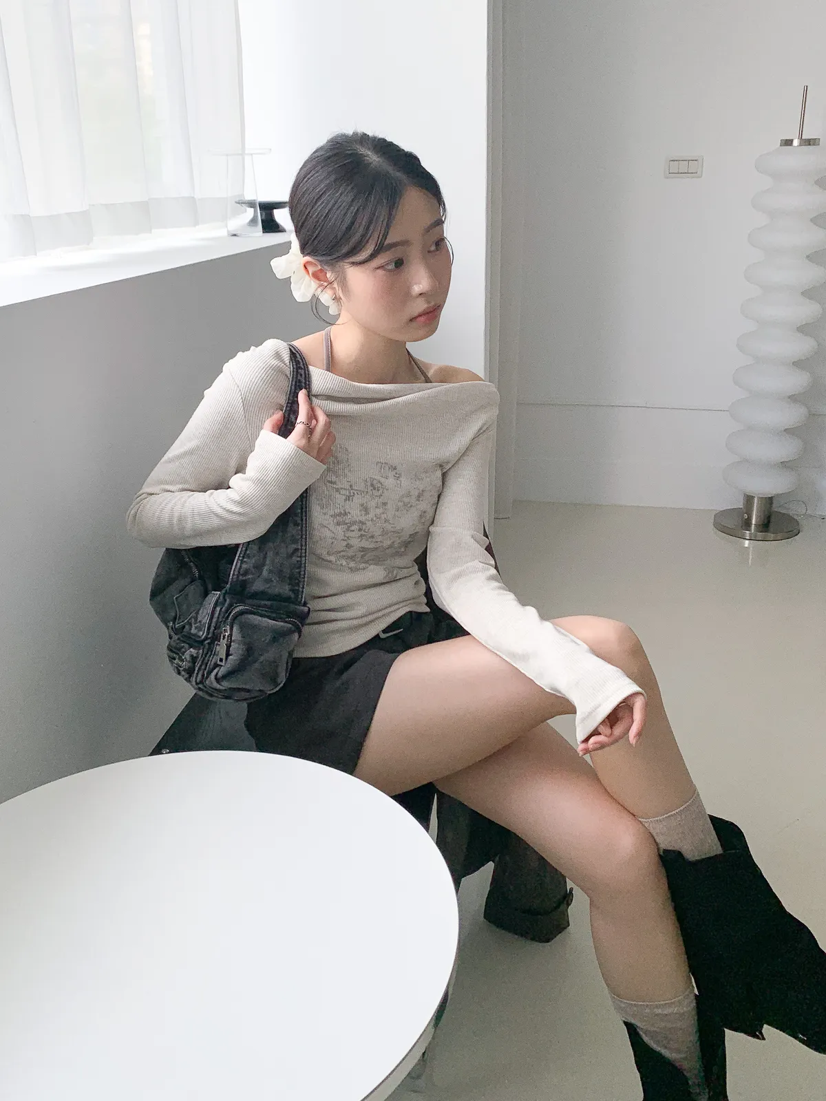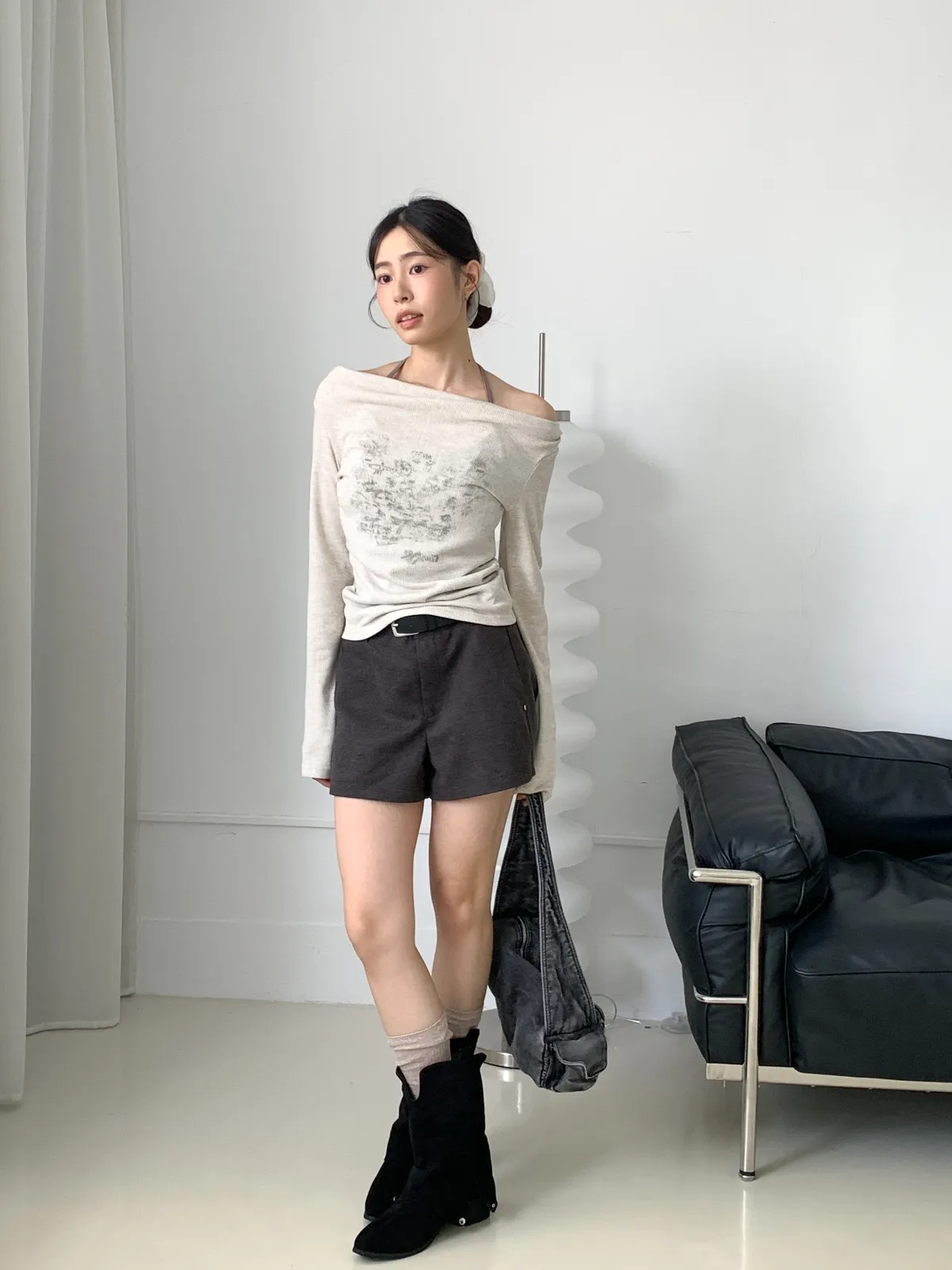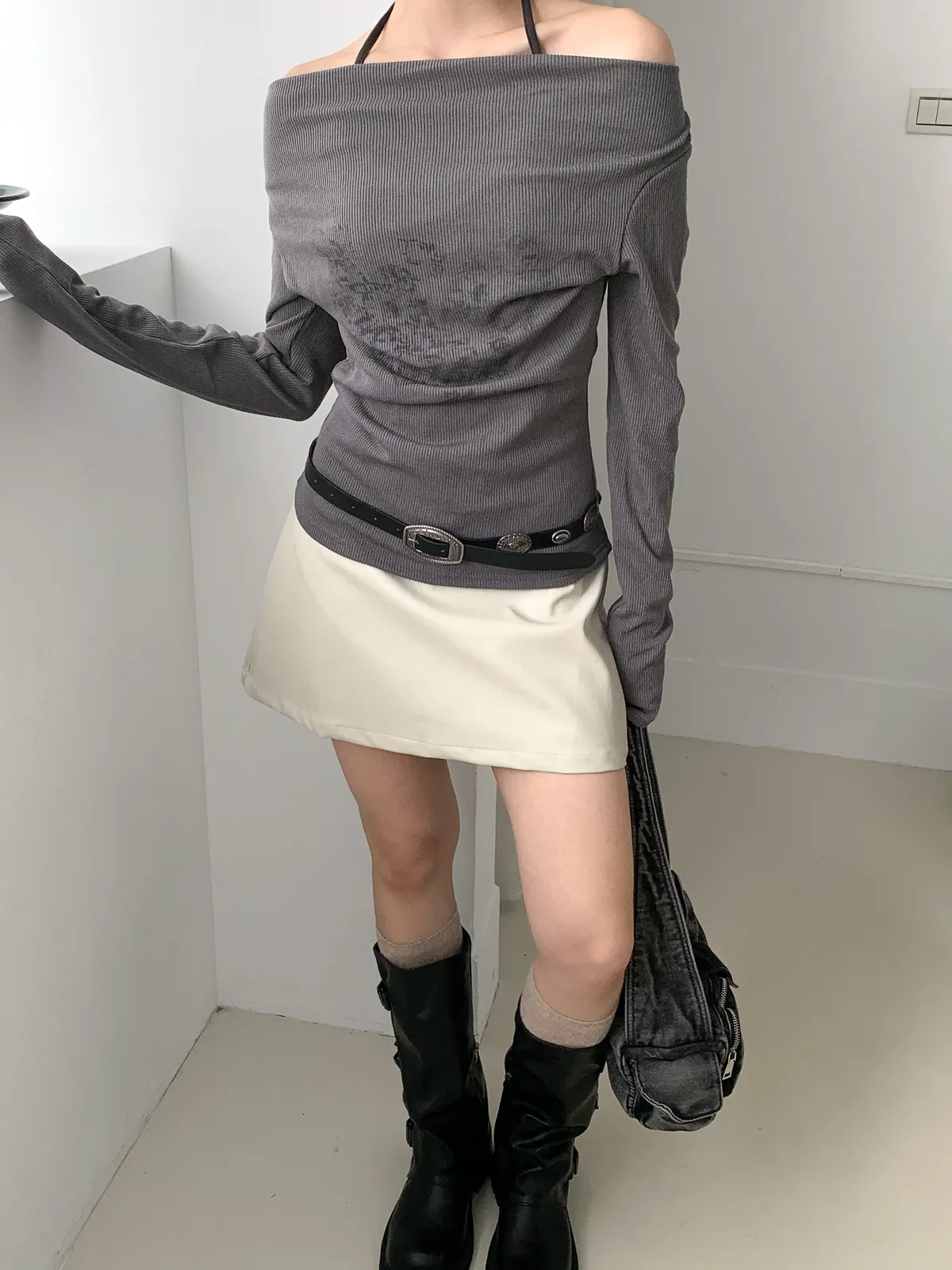兩件式綁帶一字領上衣
