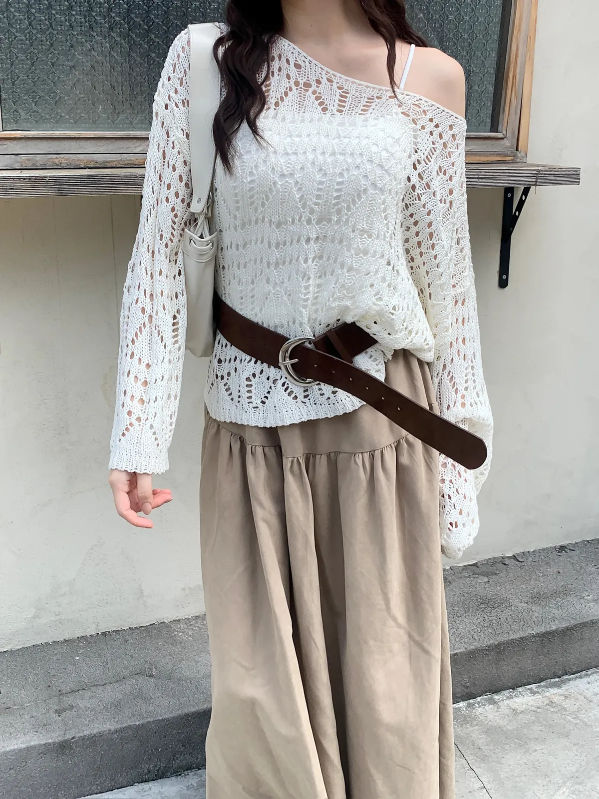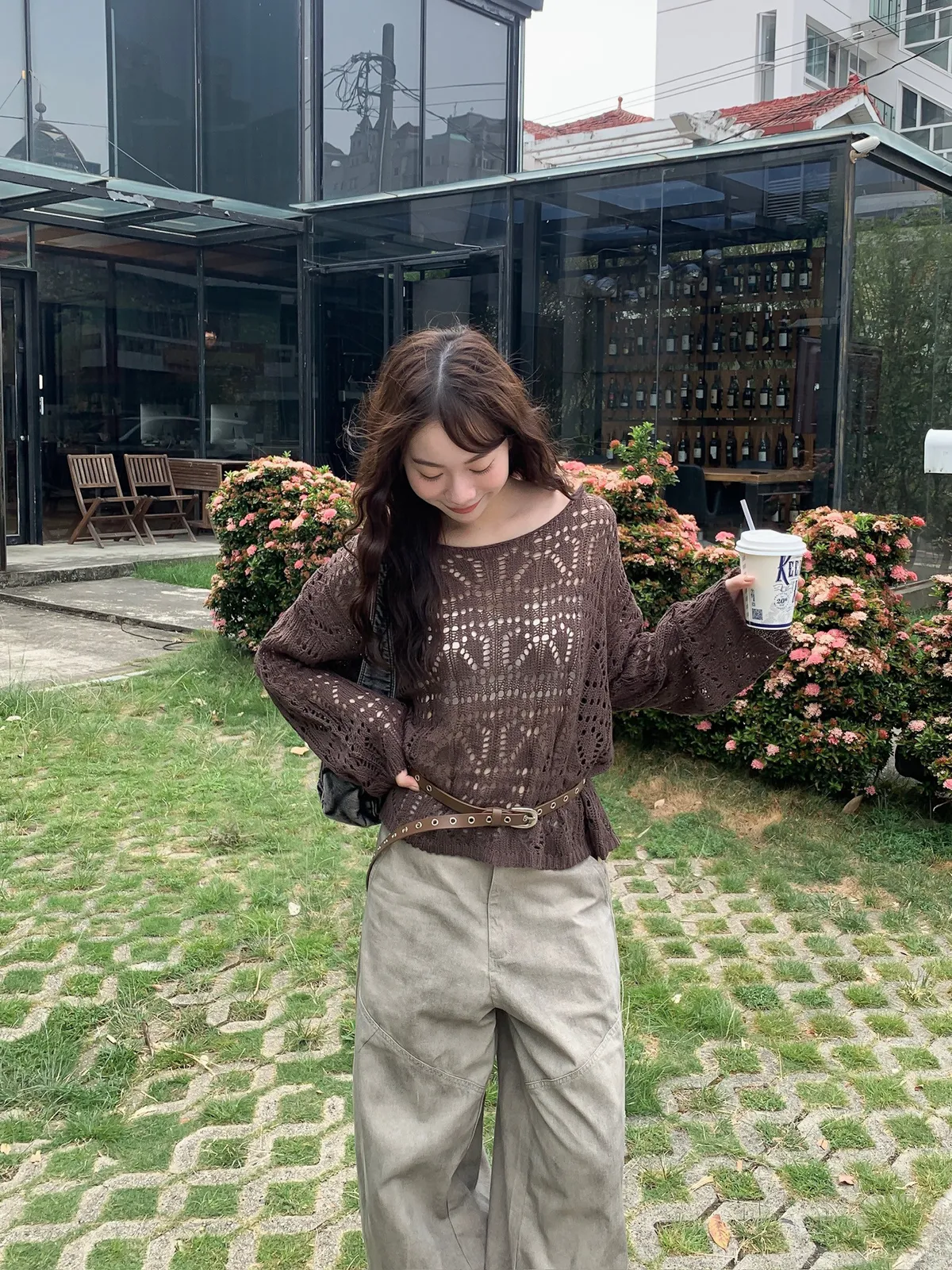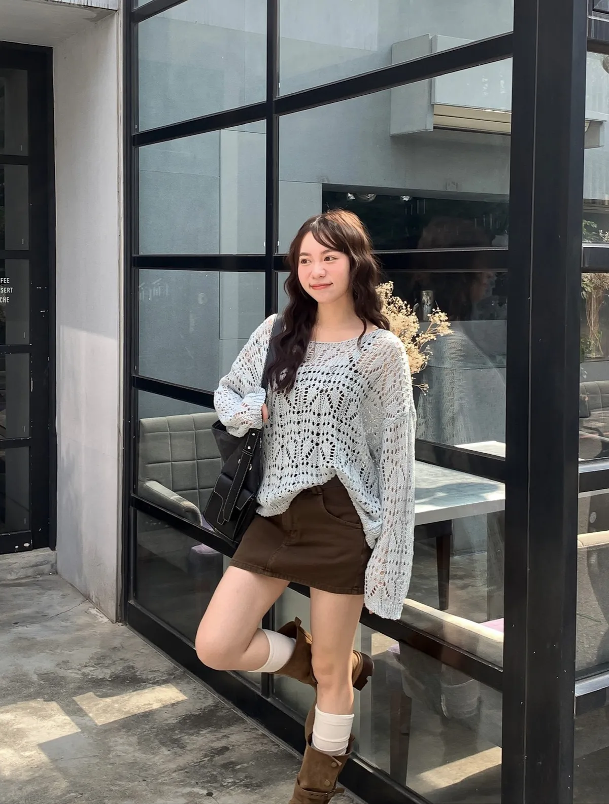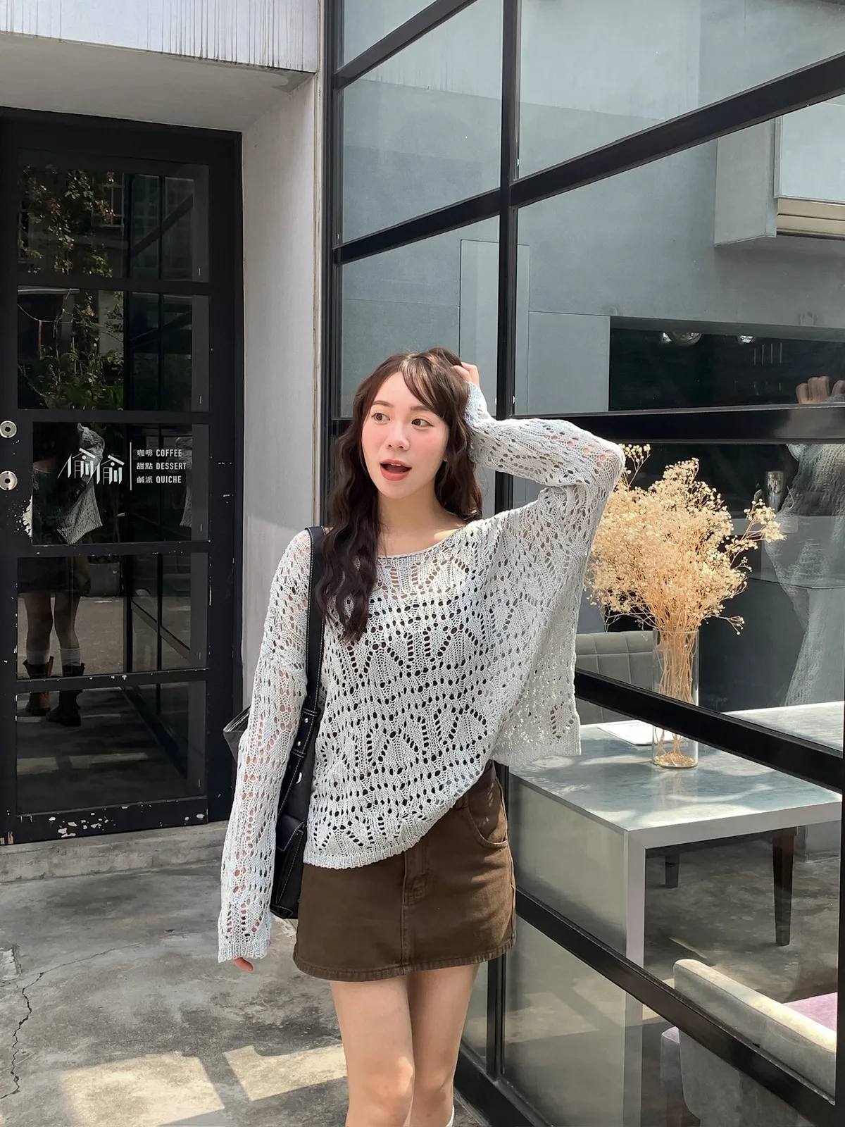 洞洞簍空針織上衣帶點微性感 船領設計可拉斜肩