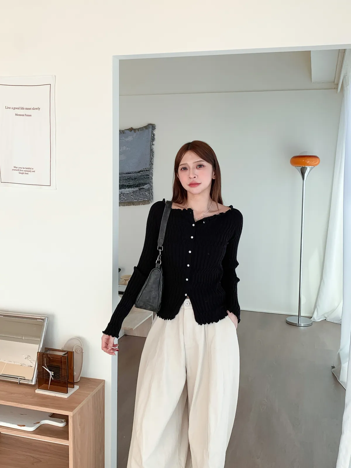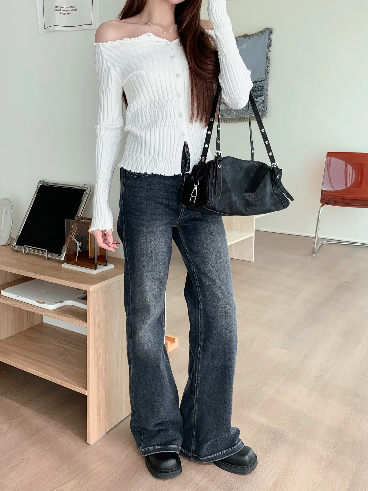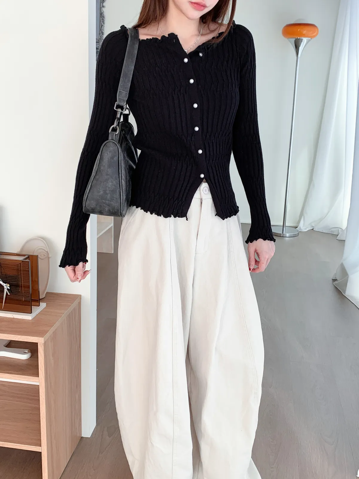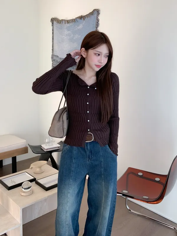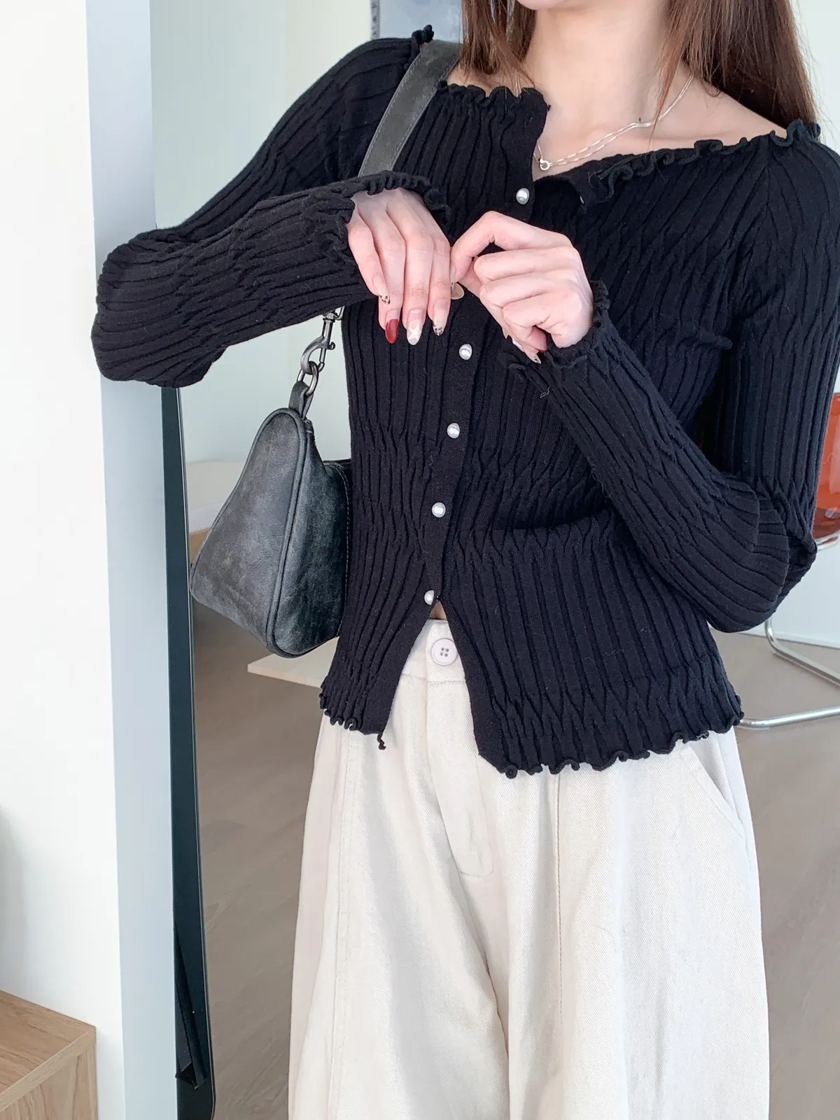 邊緣波紋|顯瘦修身百搭露肩長袖針織上衣
