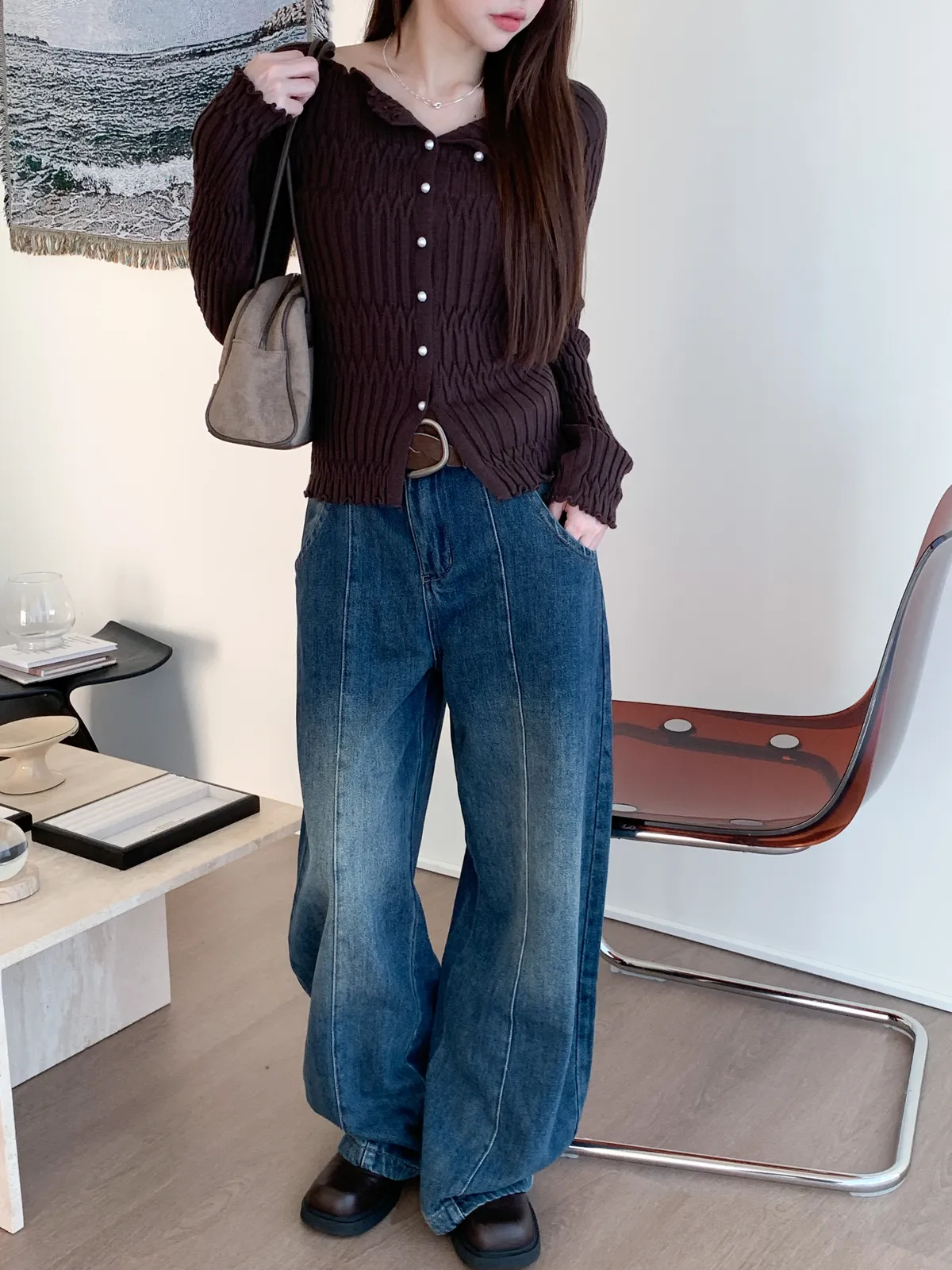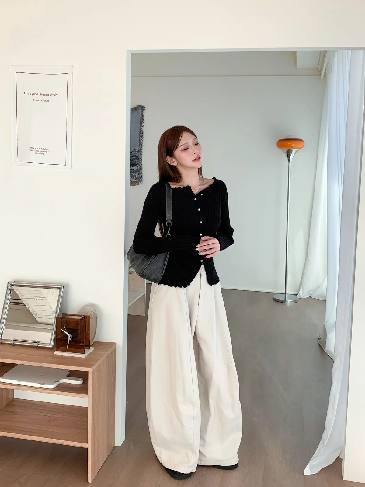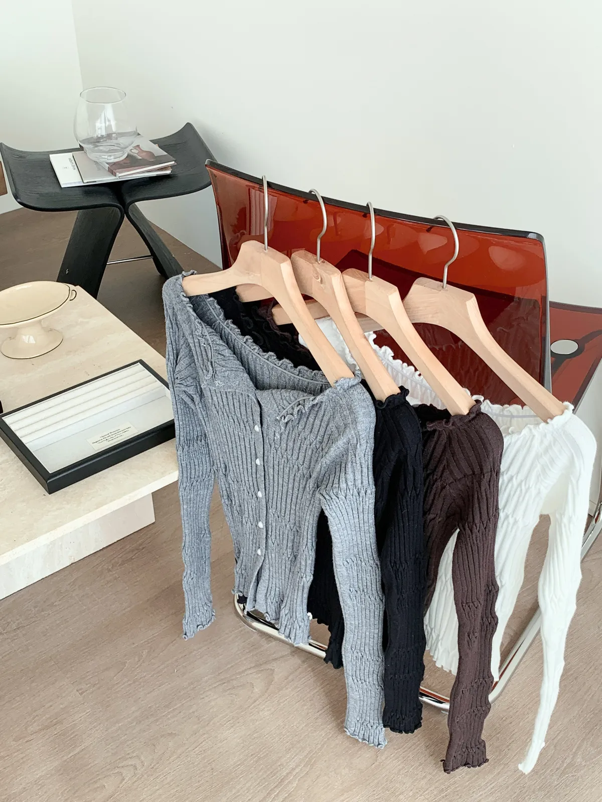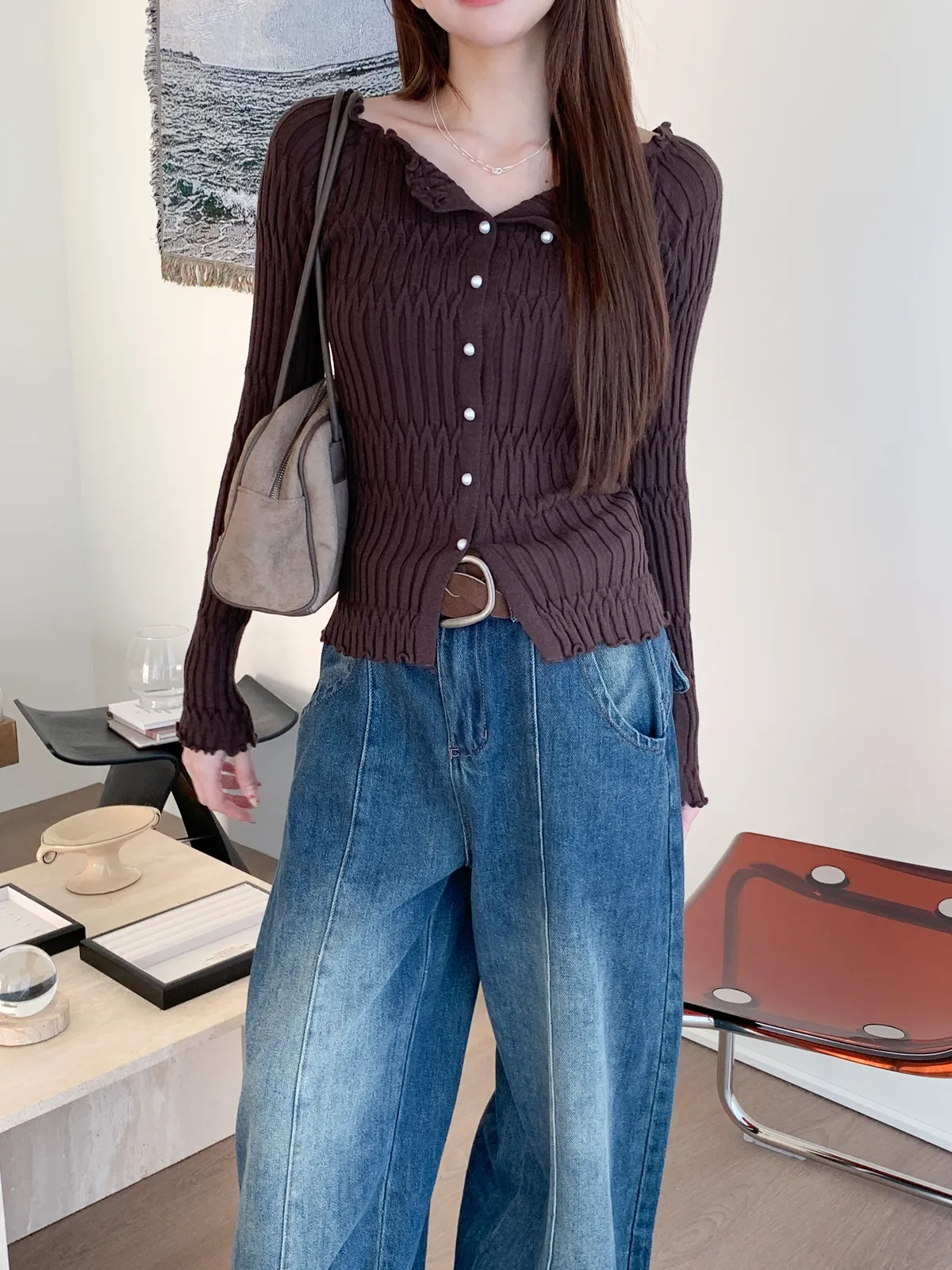 邊緣波紋|顯瘦修身百搭露肩長袖針織上衣
