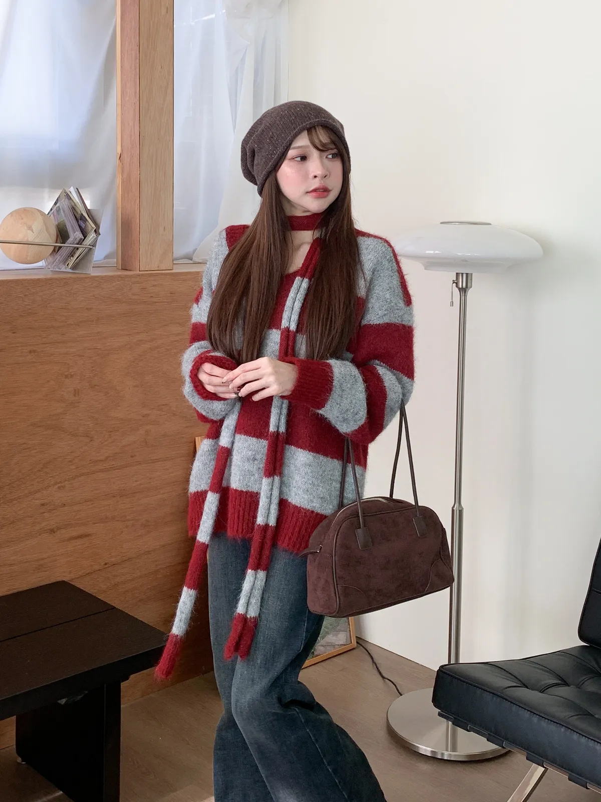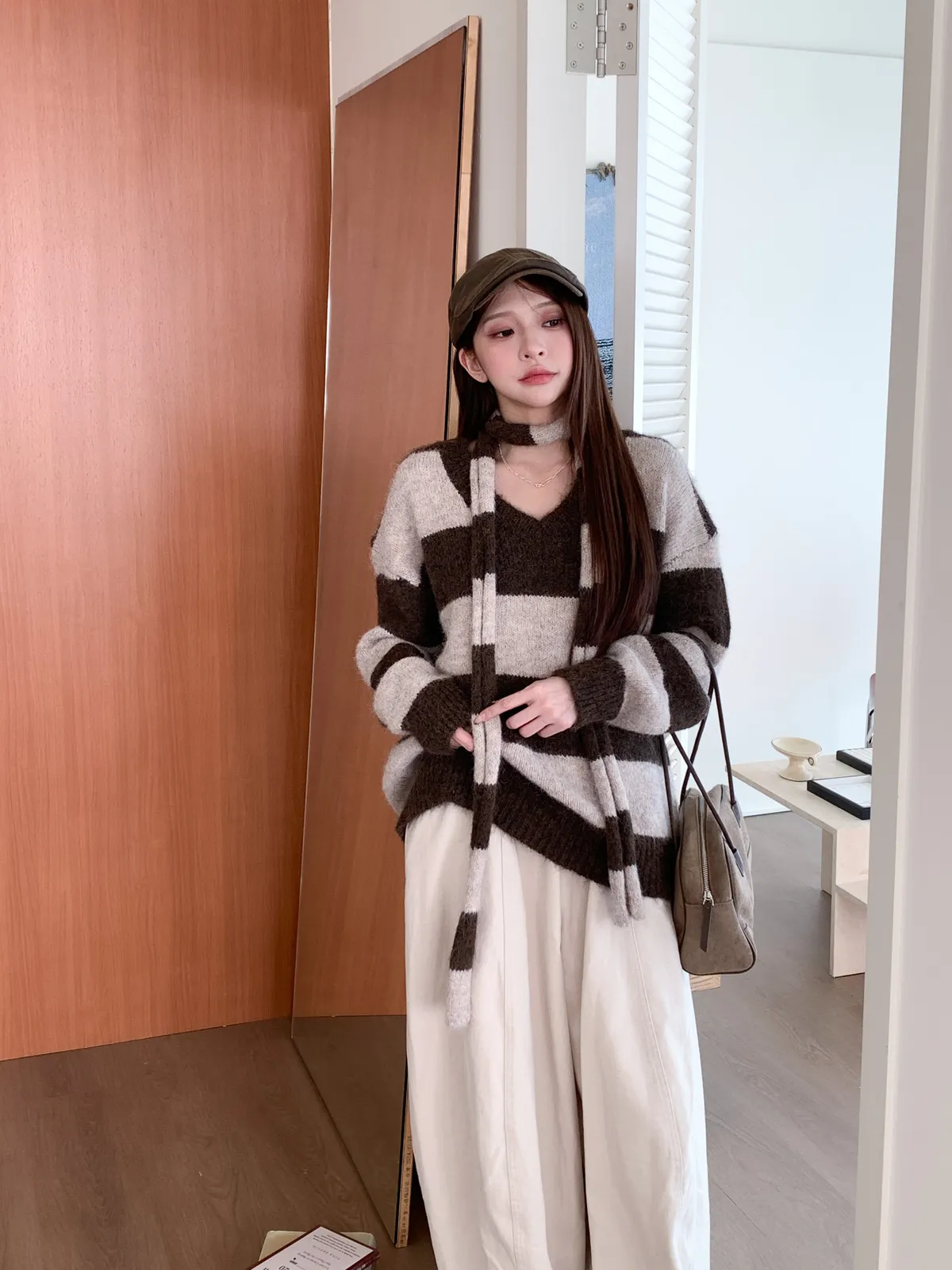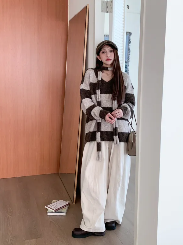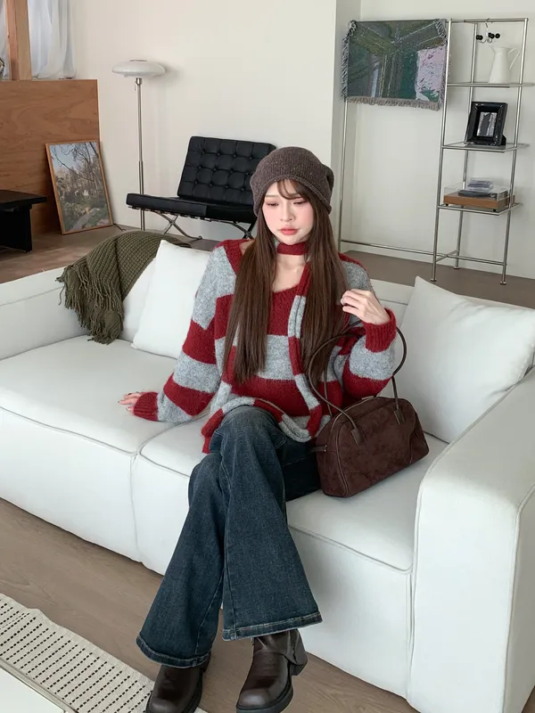 一穿即暖|V領撞色條紋針織上衣