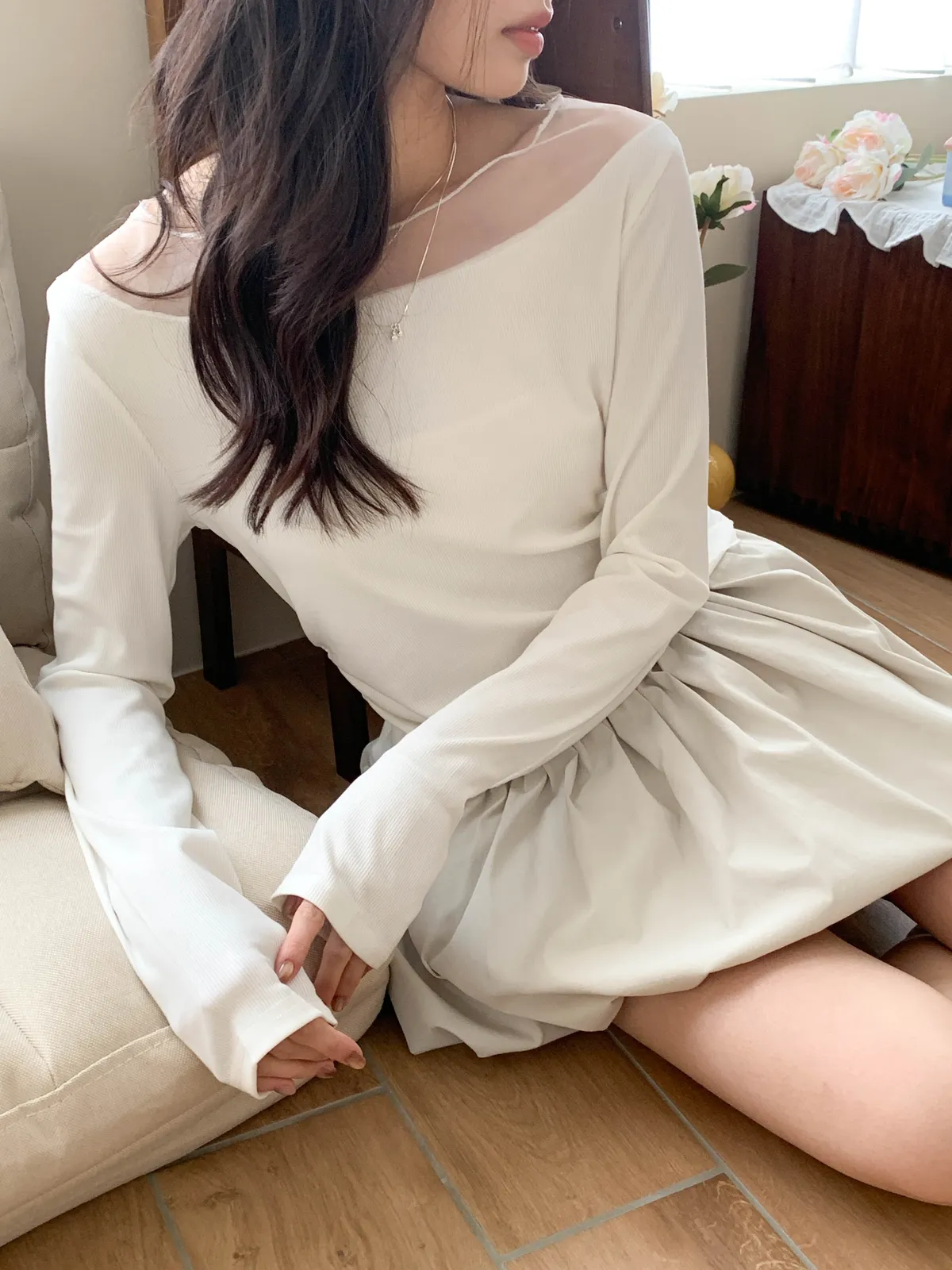(透紗拼接設計增添層次感與輕盈感,小個子穿起來比例好,看起來甜美又有氣質~)