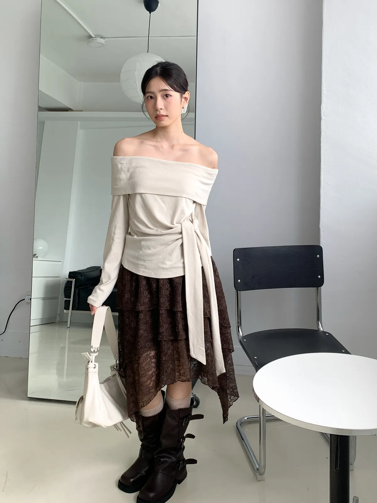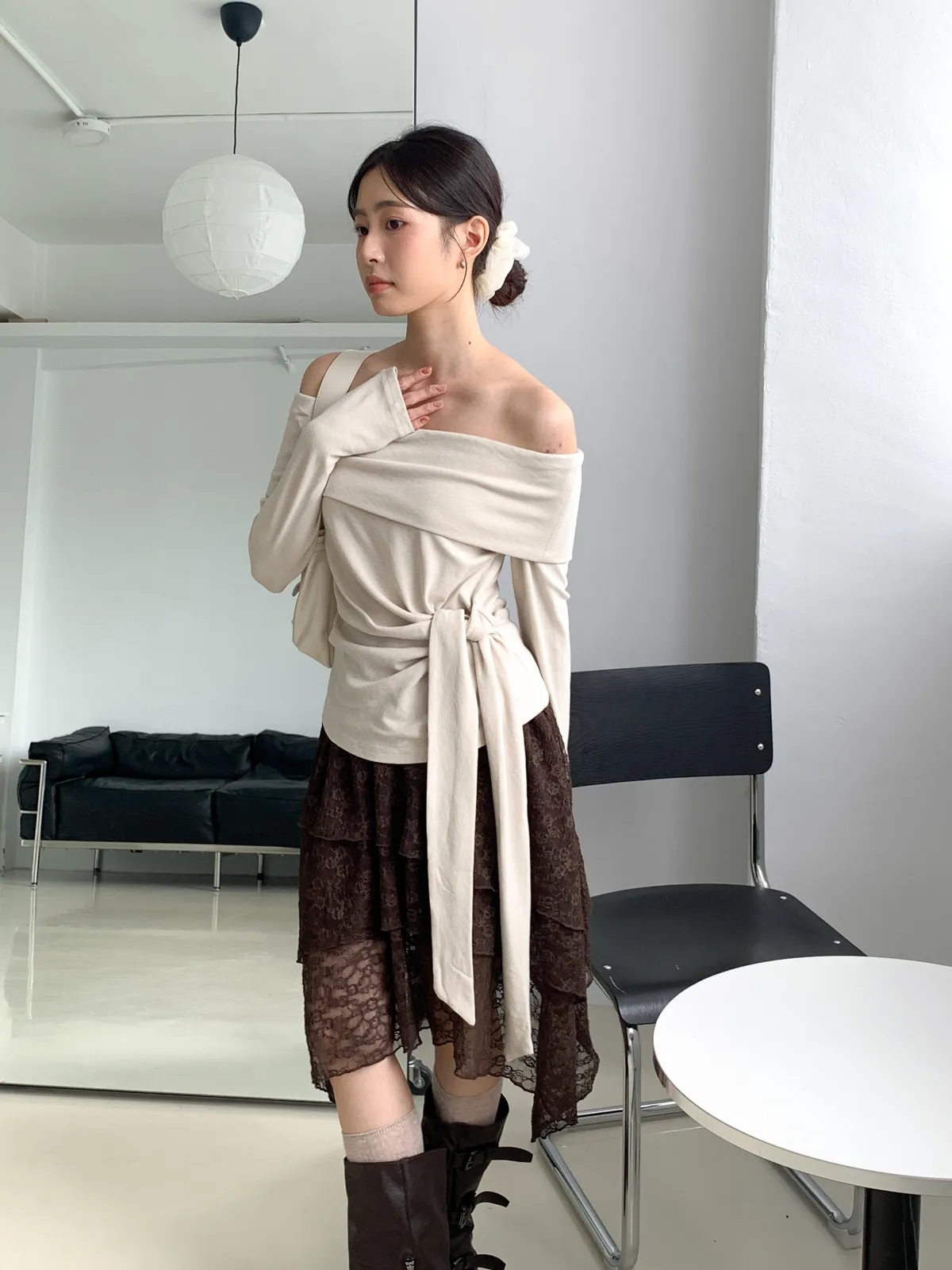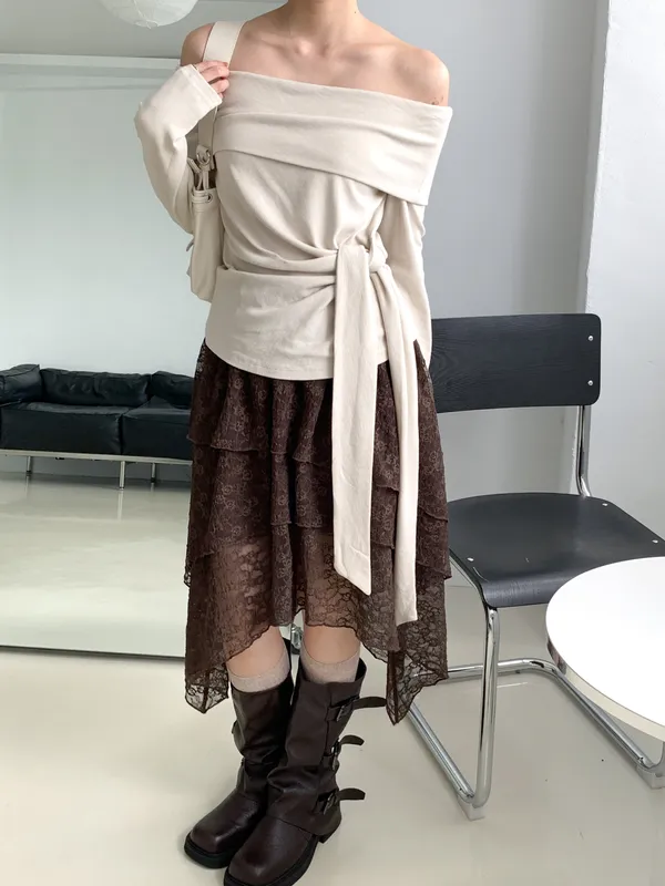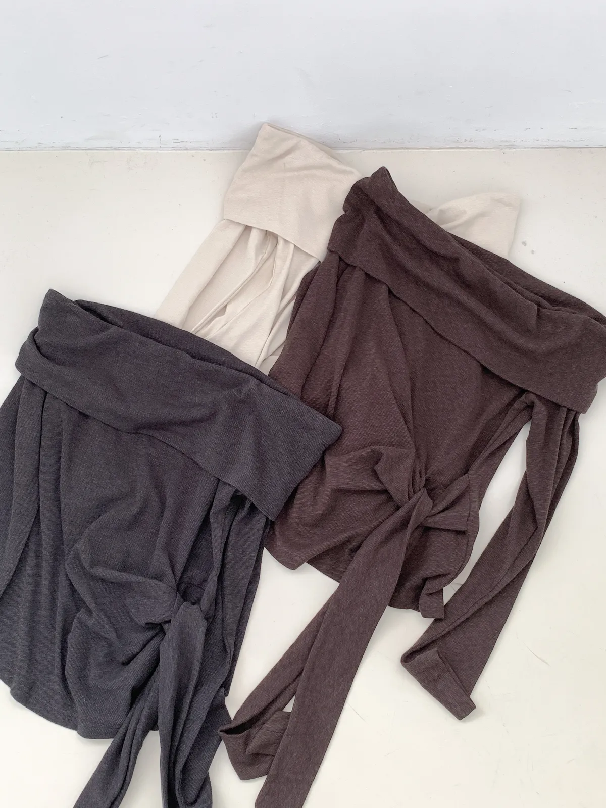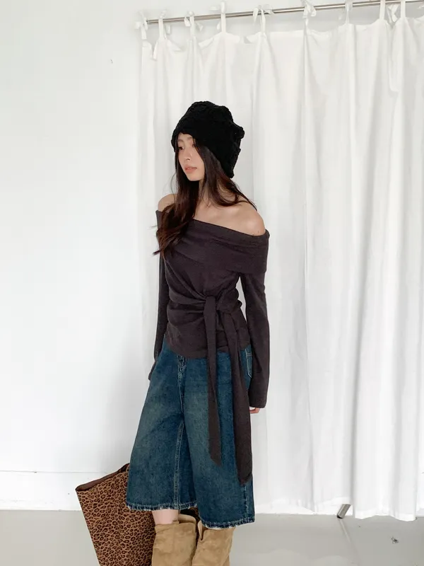 一字領設計透露一點小性感 附綁帶可綁腰上或當繞脖