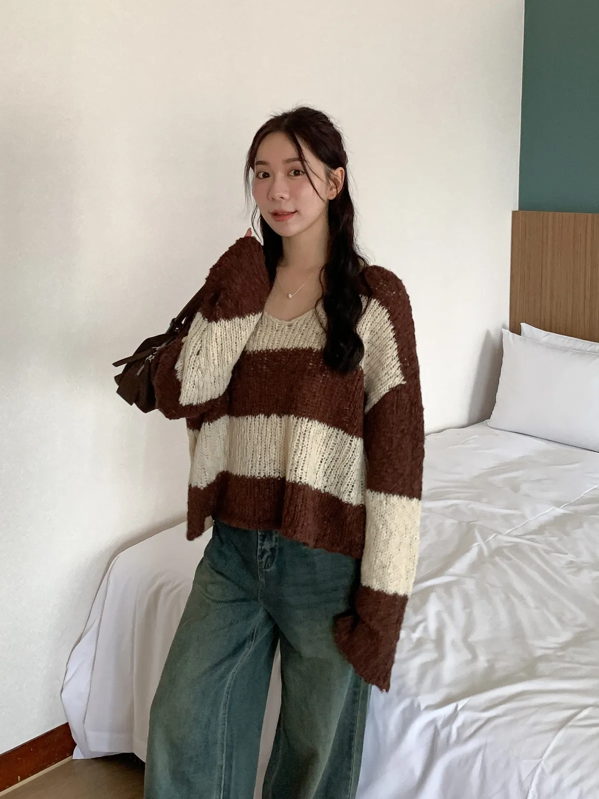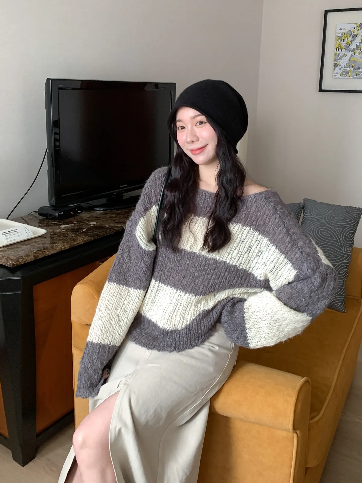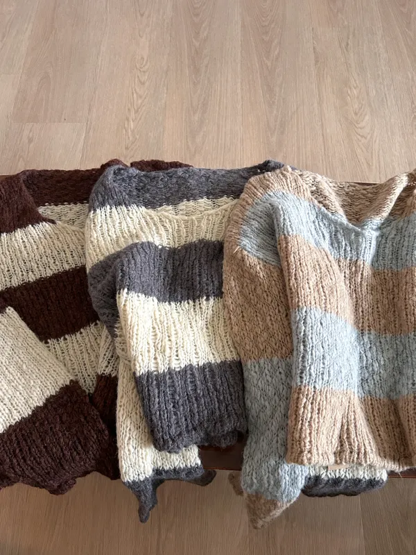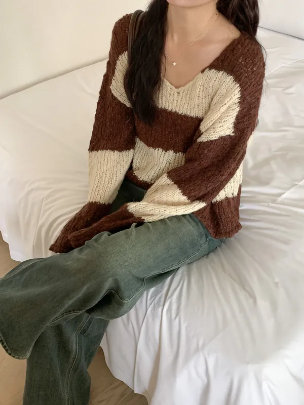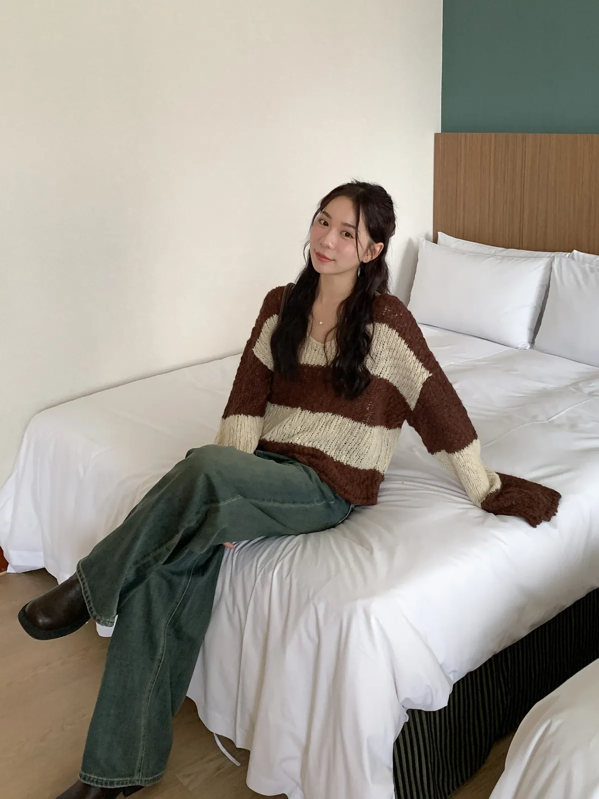 寬橫條紋配色上衣 V領領口彈性足夠可拉斜肩