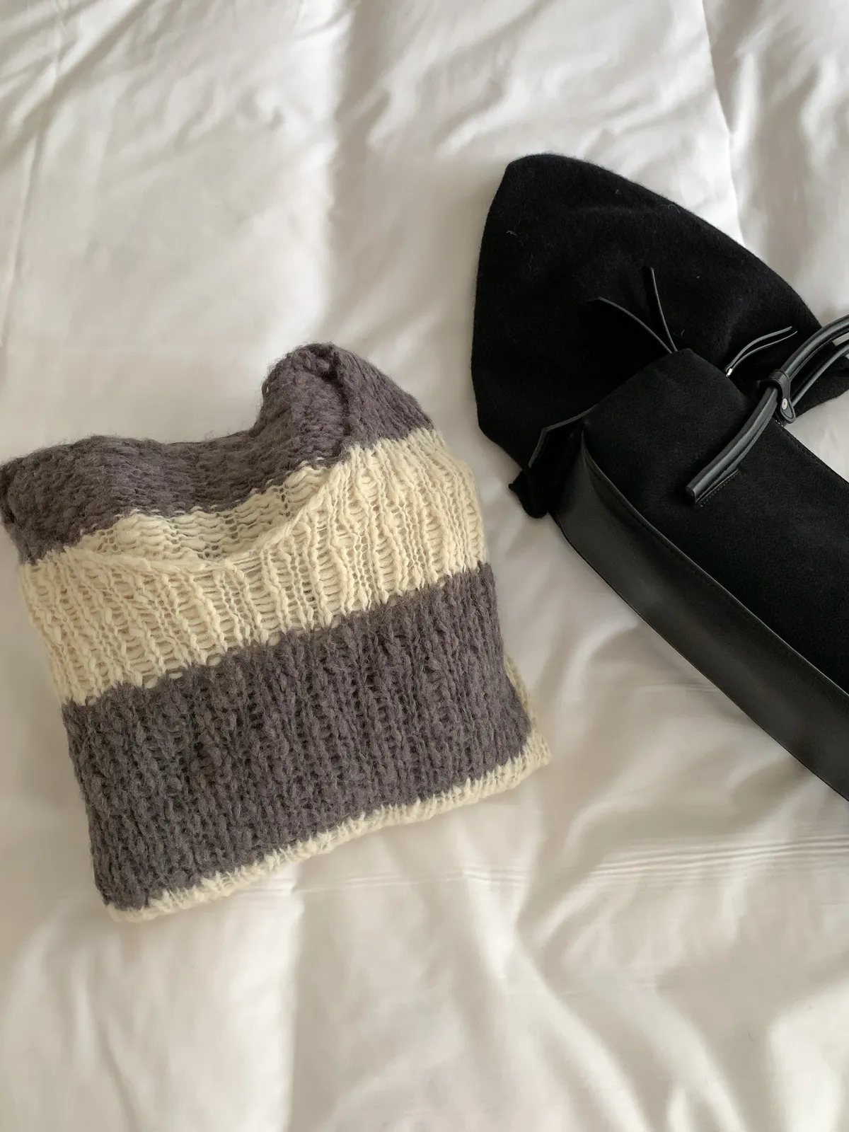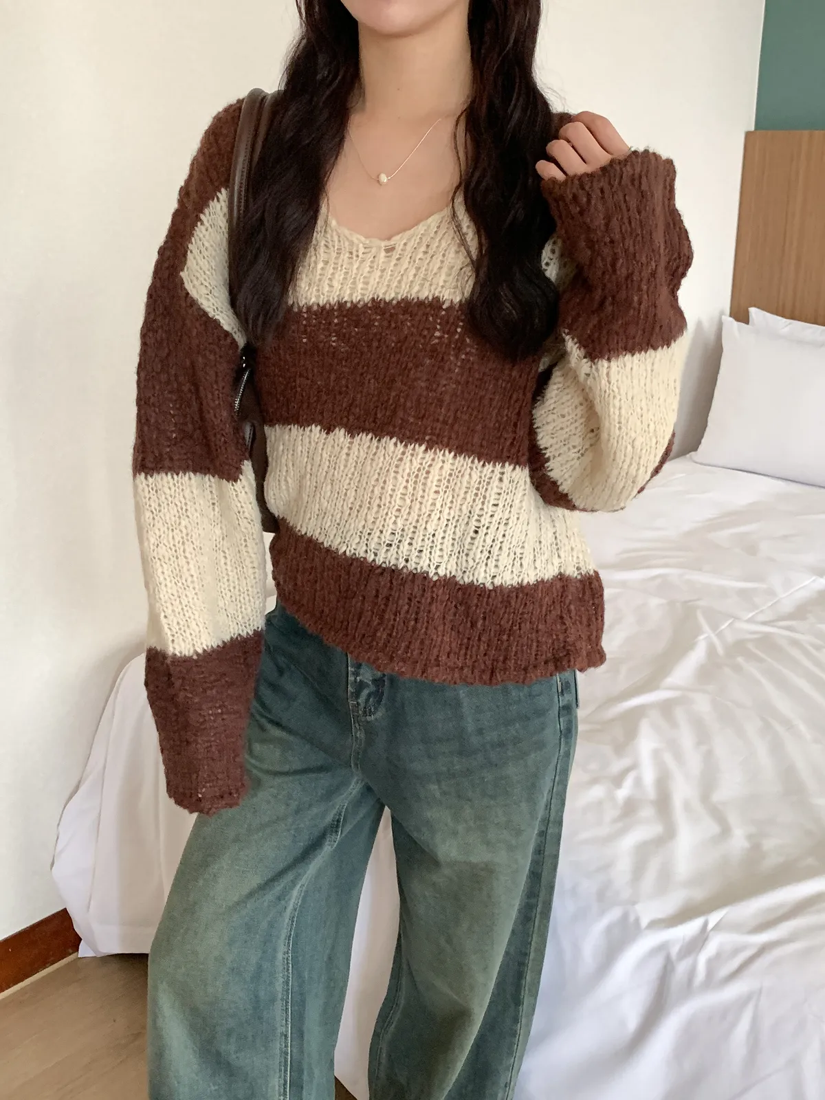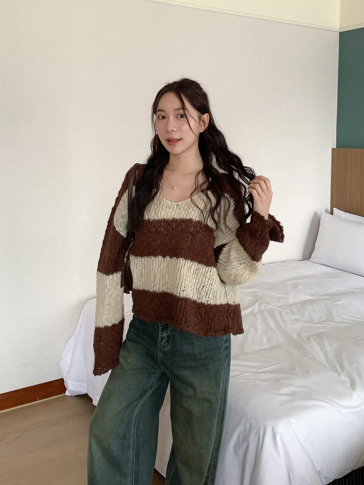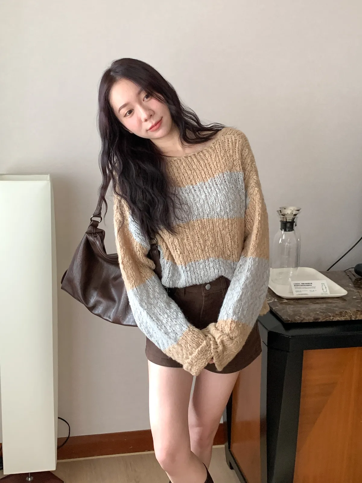 寬橫條紋配色上衣 V領領口彈性足夠可拉斜肩