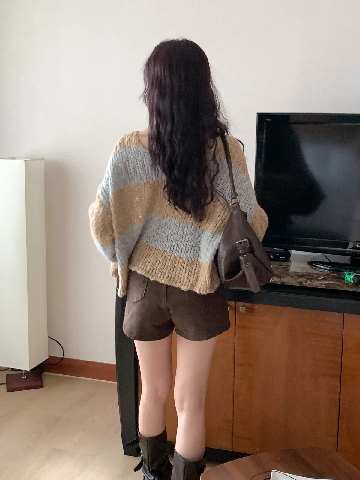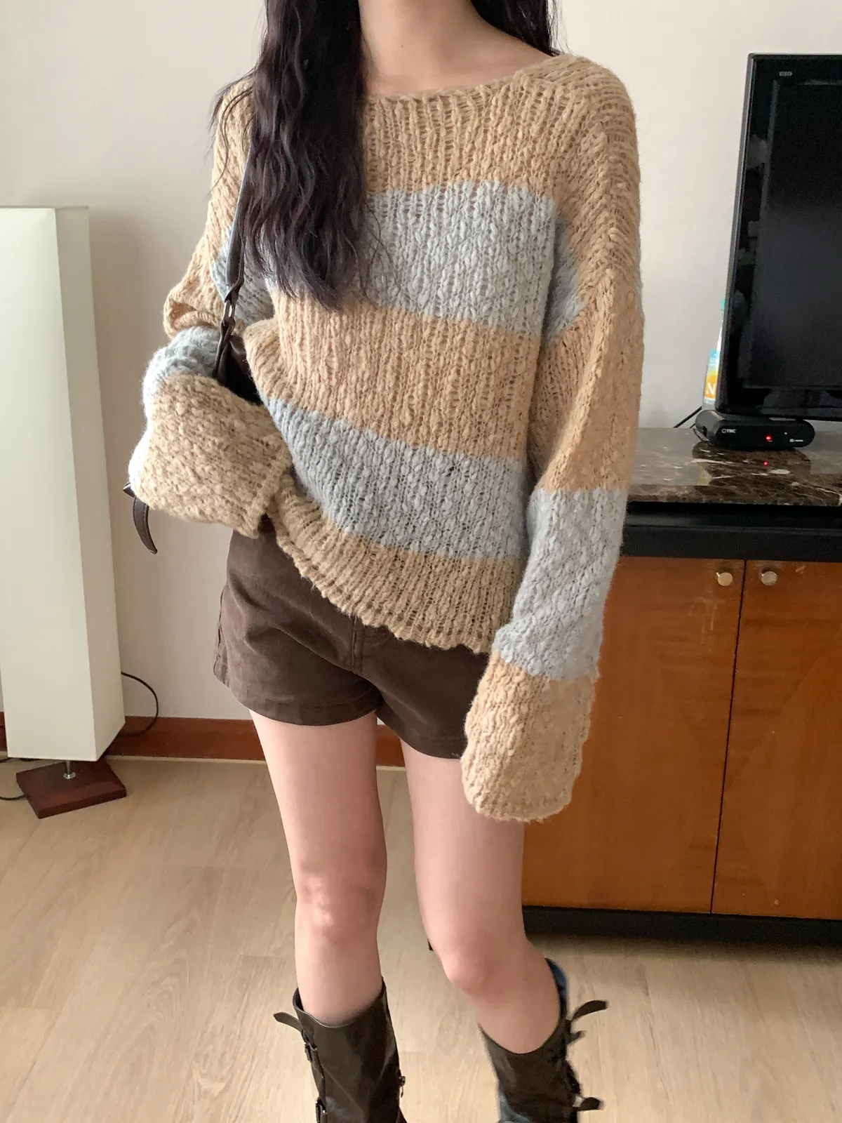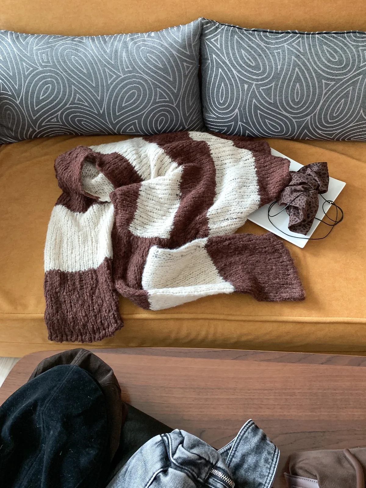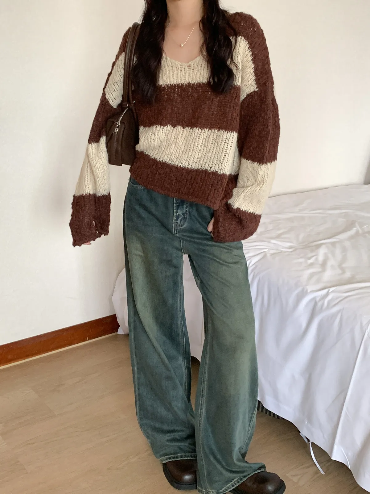 寬橫條紋配色上衣 V領領口彈性足夠可拉斜肩