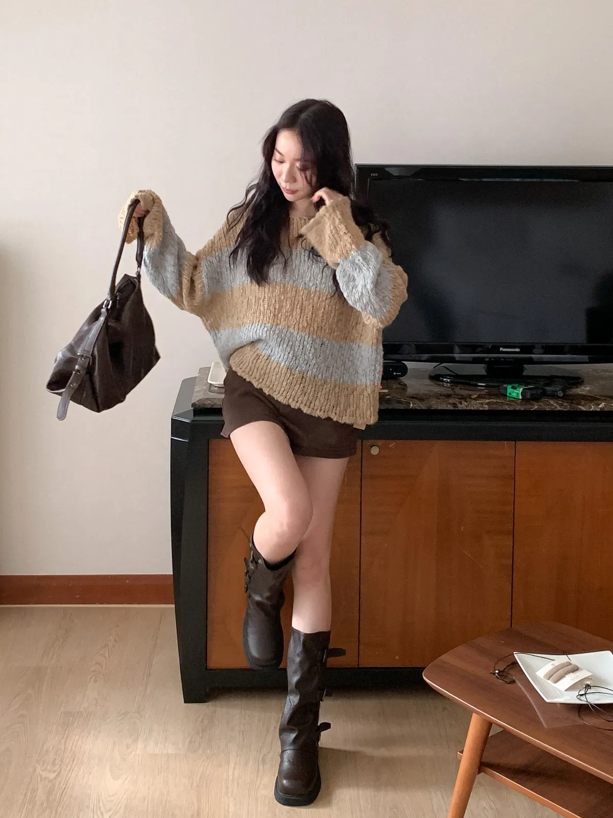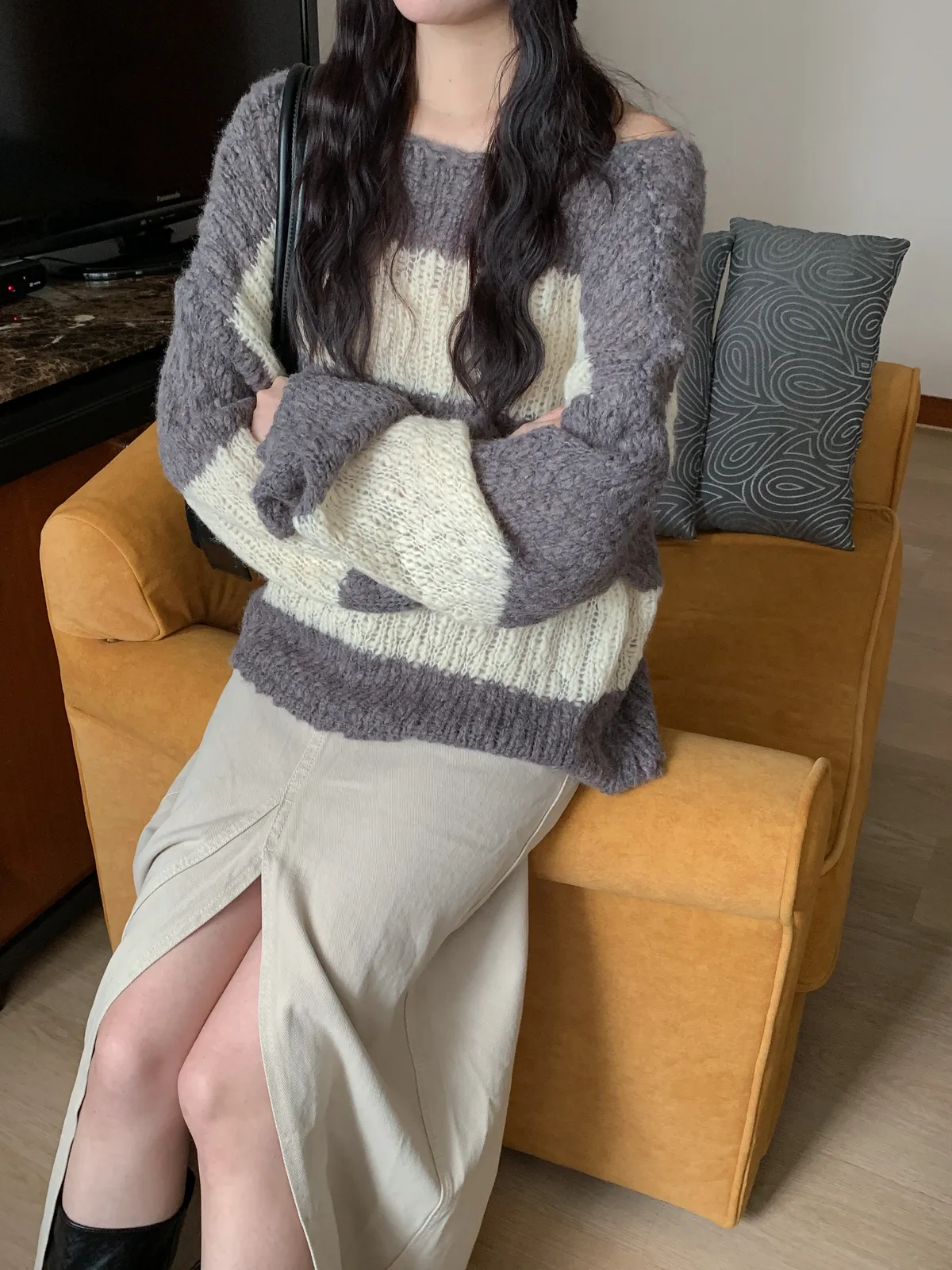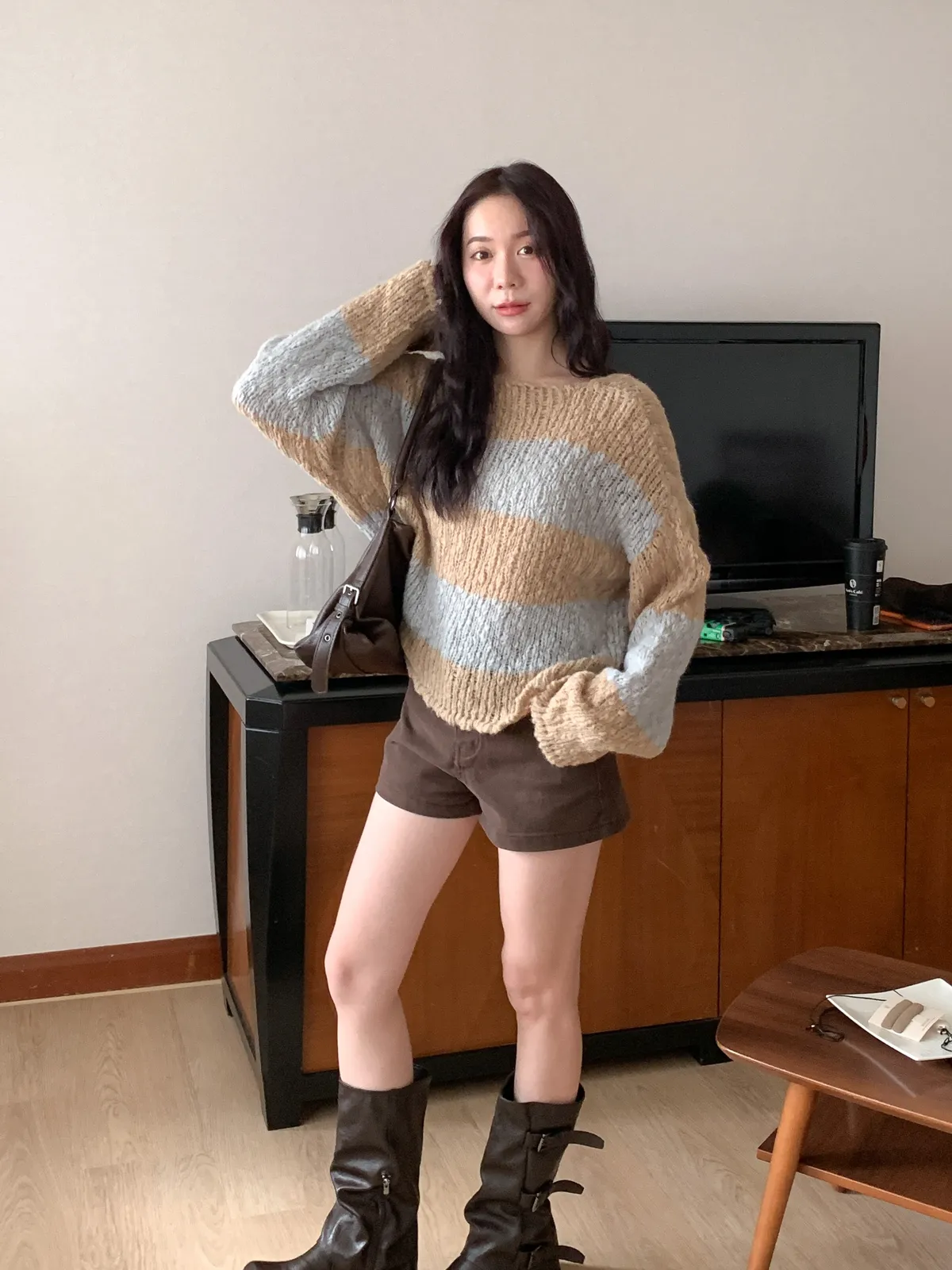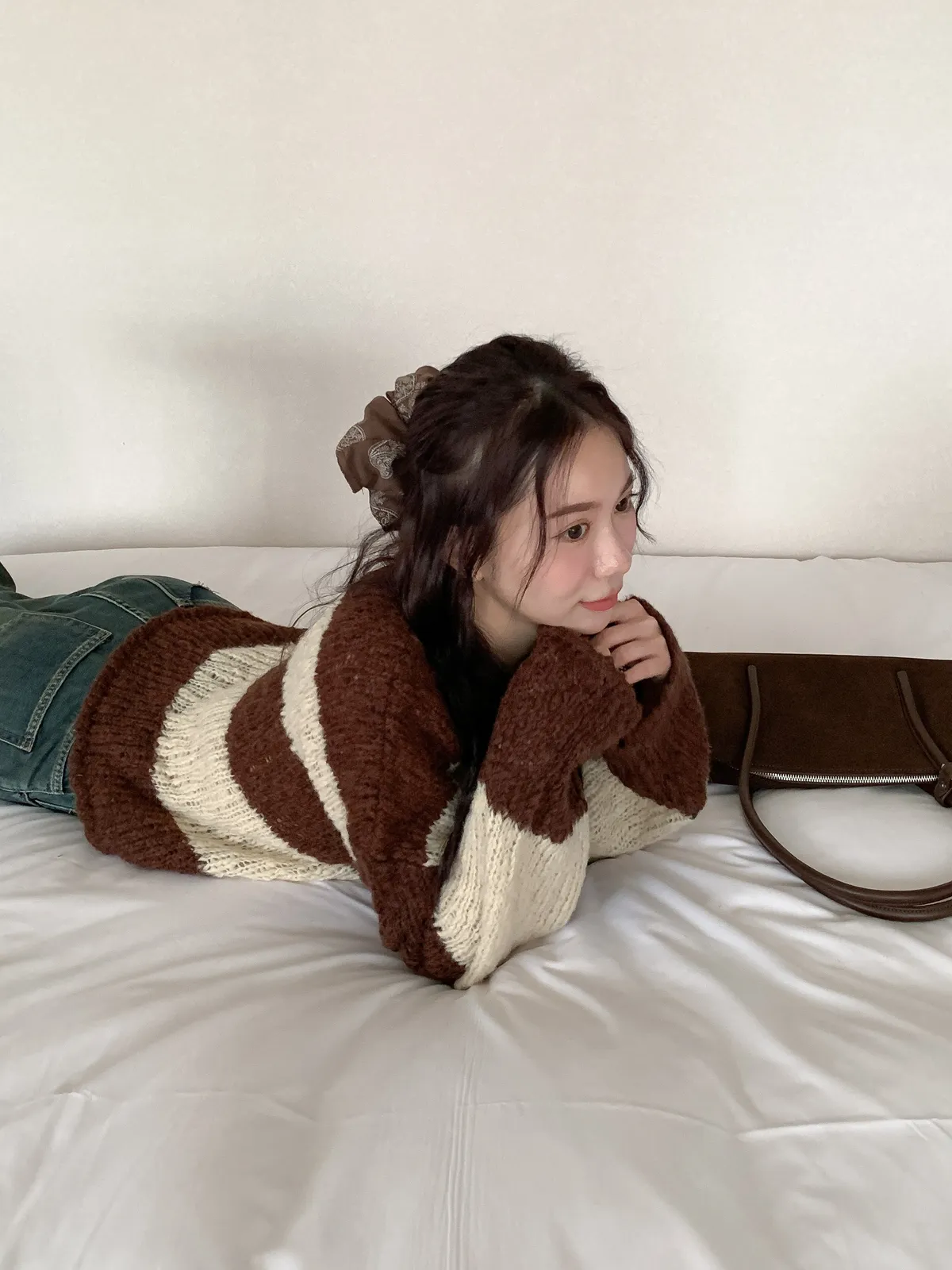 寬橫條紋配色上衣 V領領口彈性足夠可拉斜肩