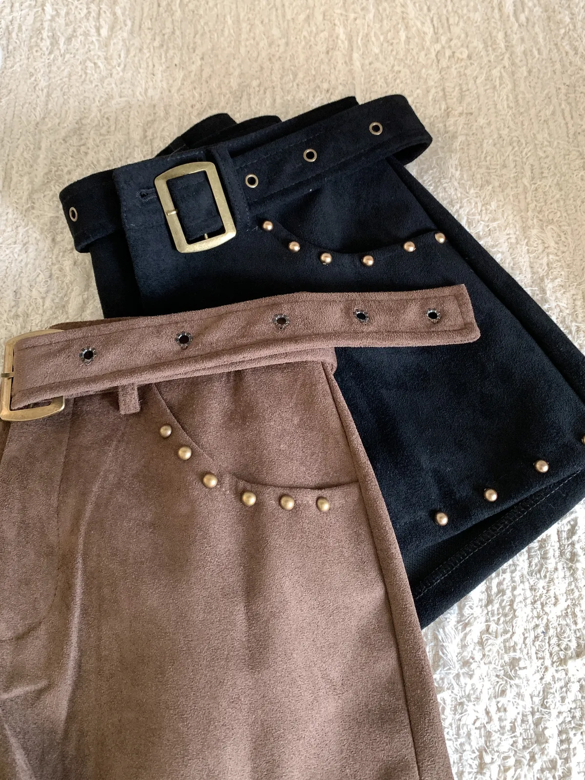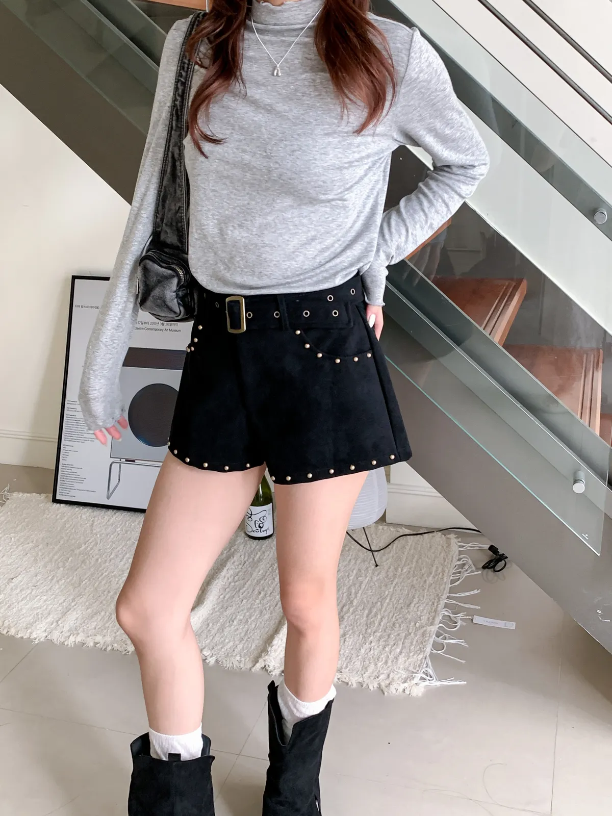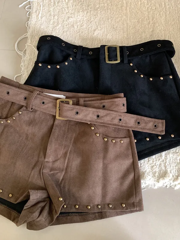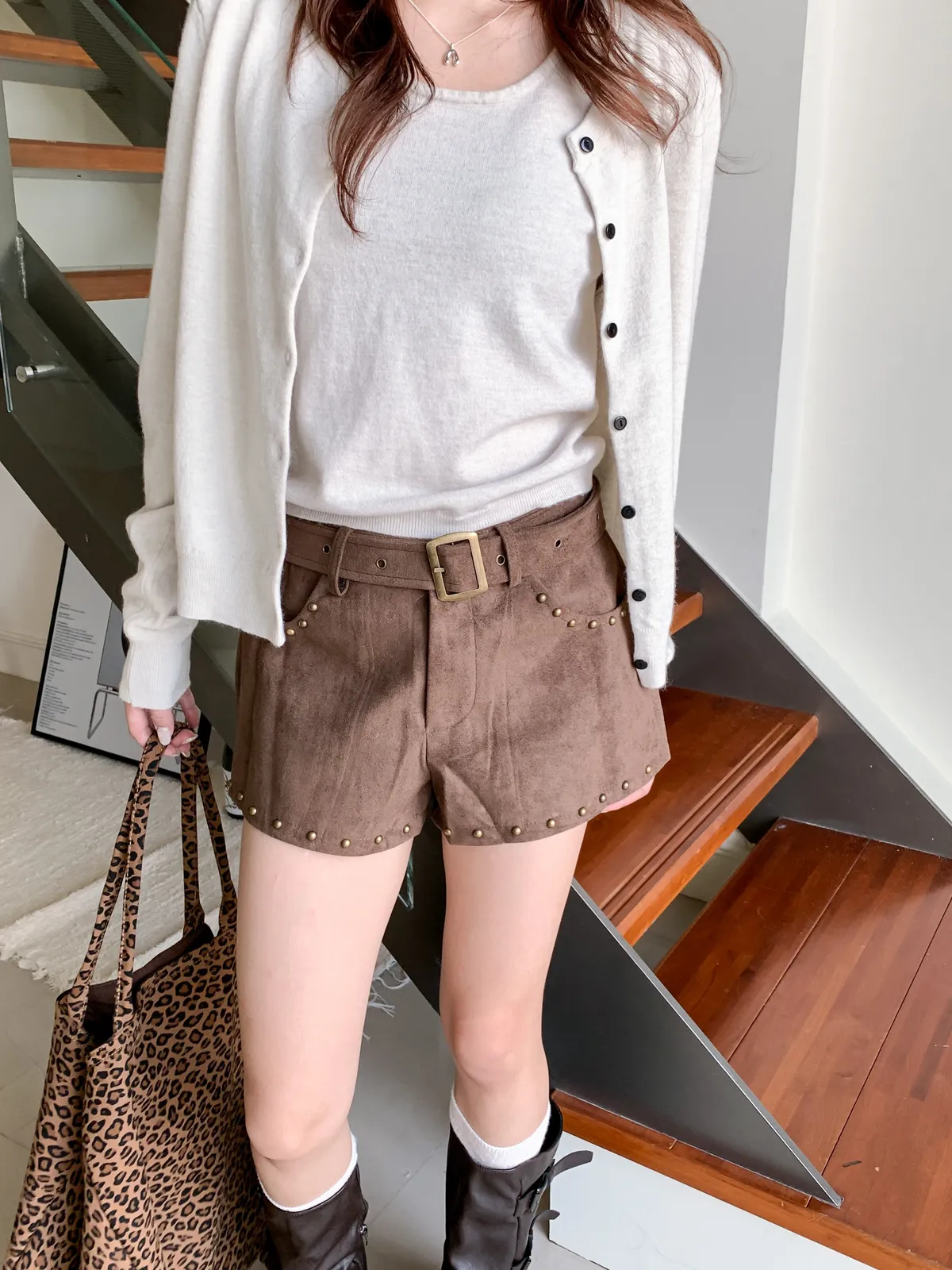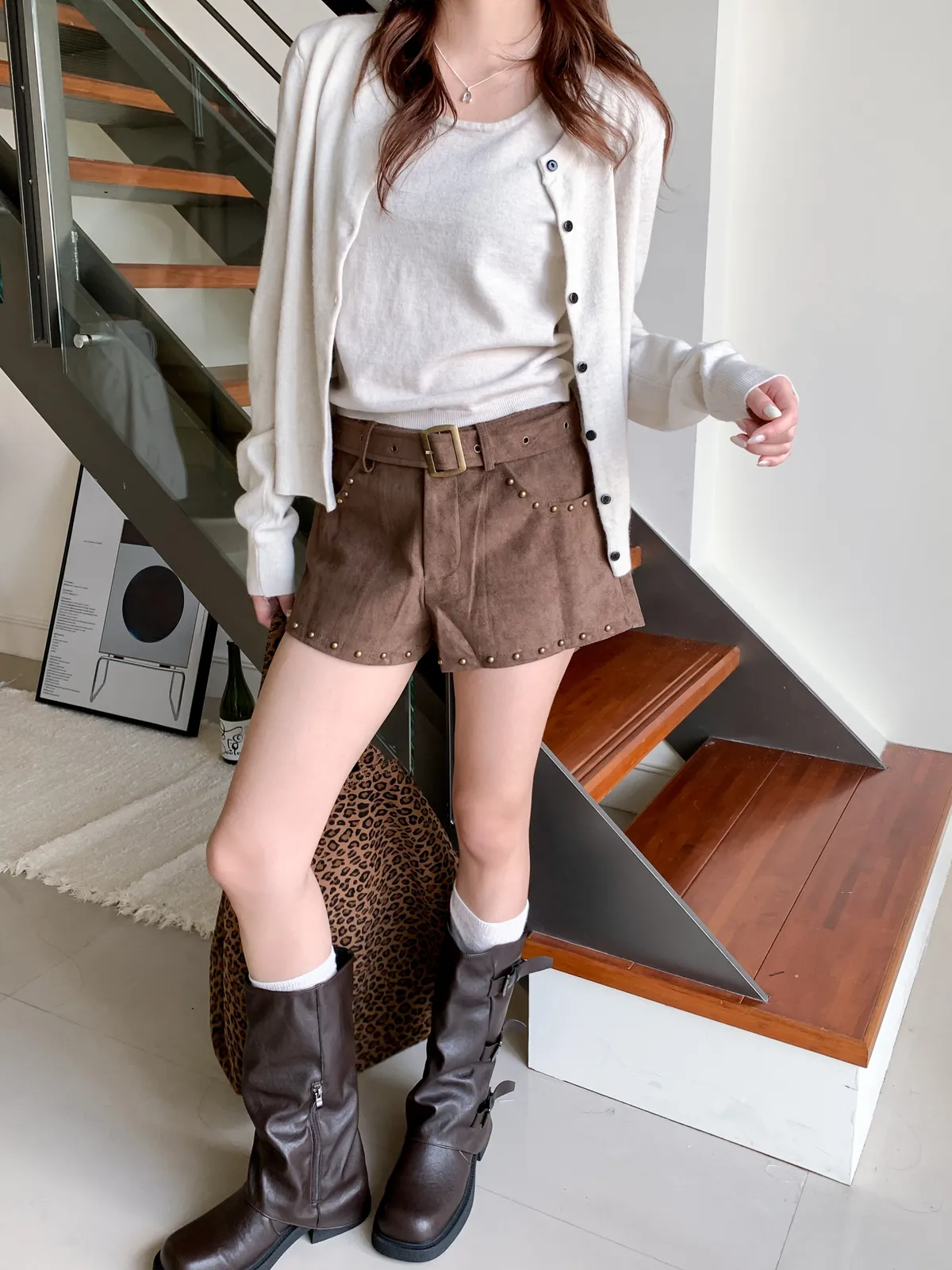 復古美式辣妹!麂皮金屬鉚釘皮帶短褲