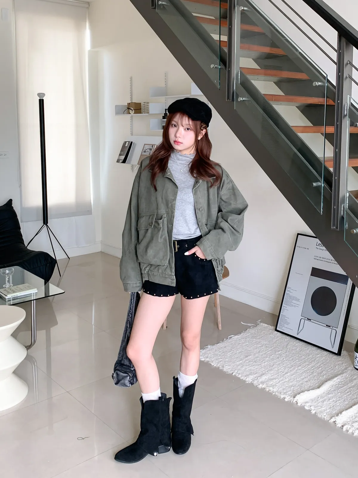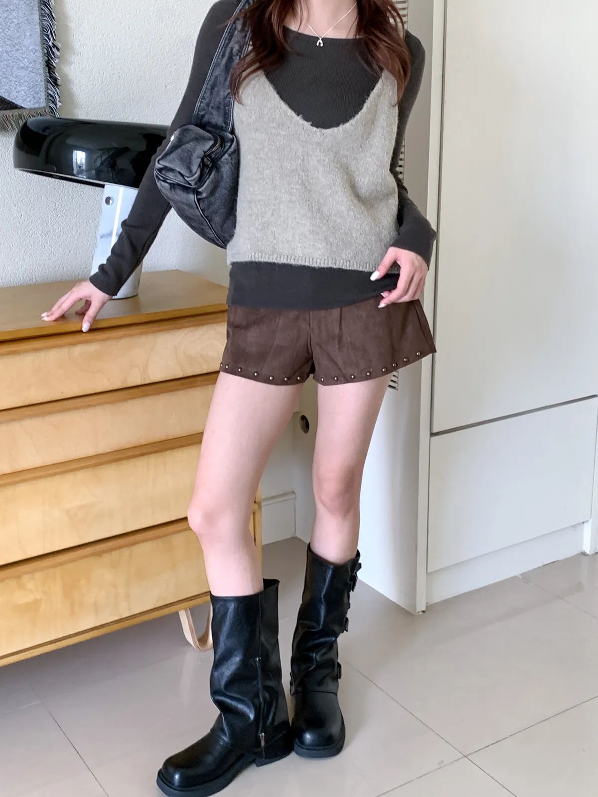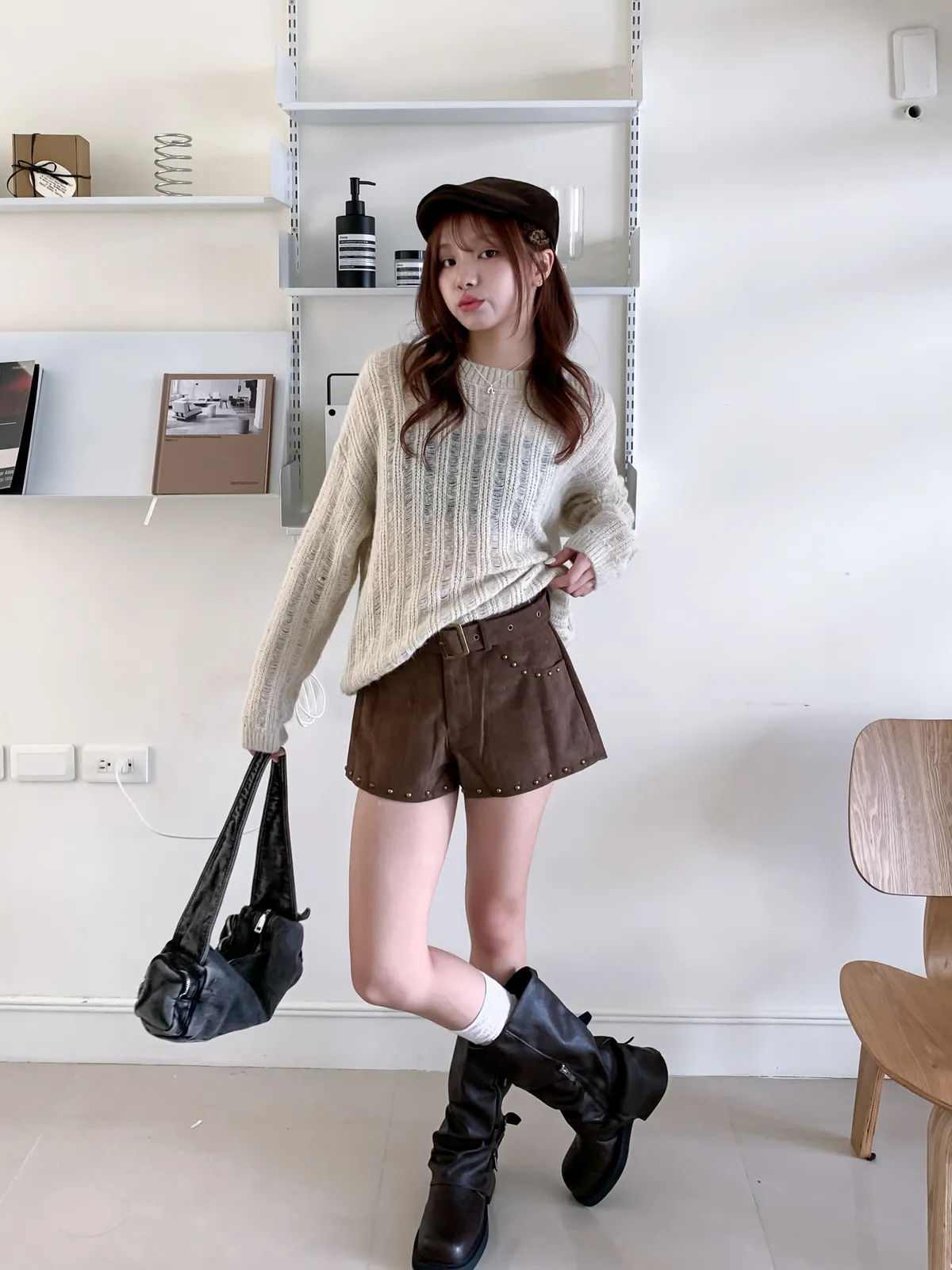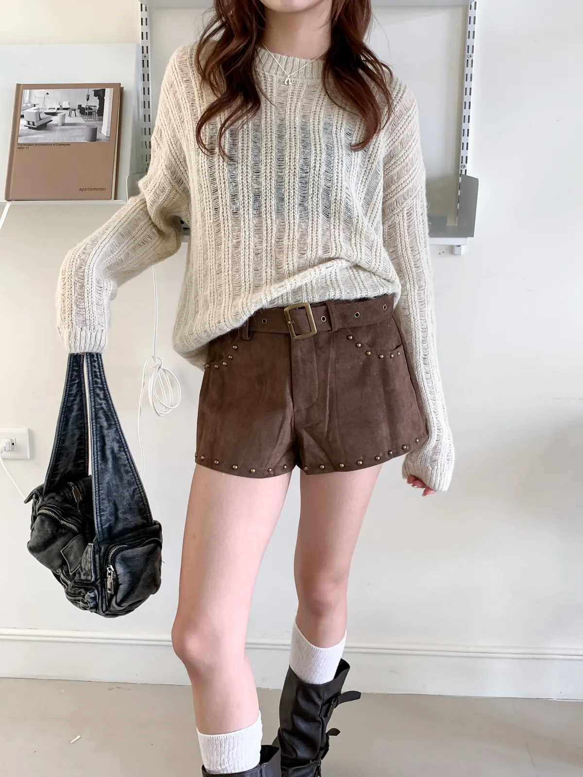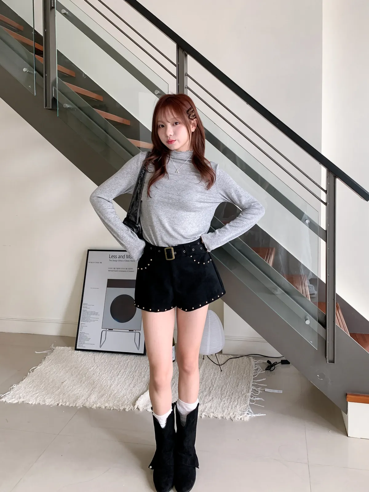復古美式辣妹!麂皮金屬鉚釘皮帶短褲