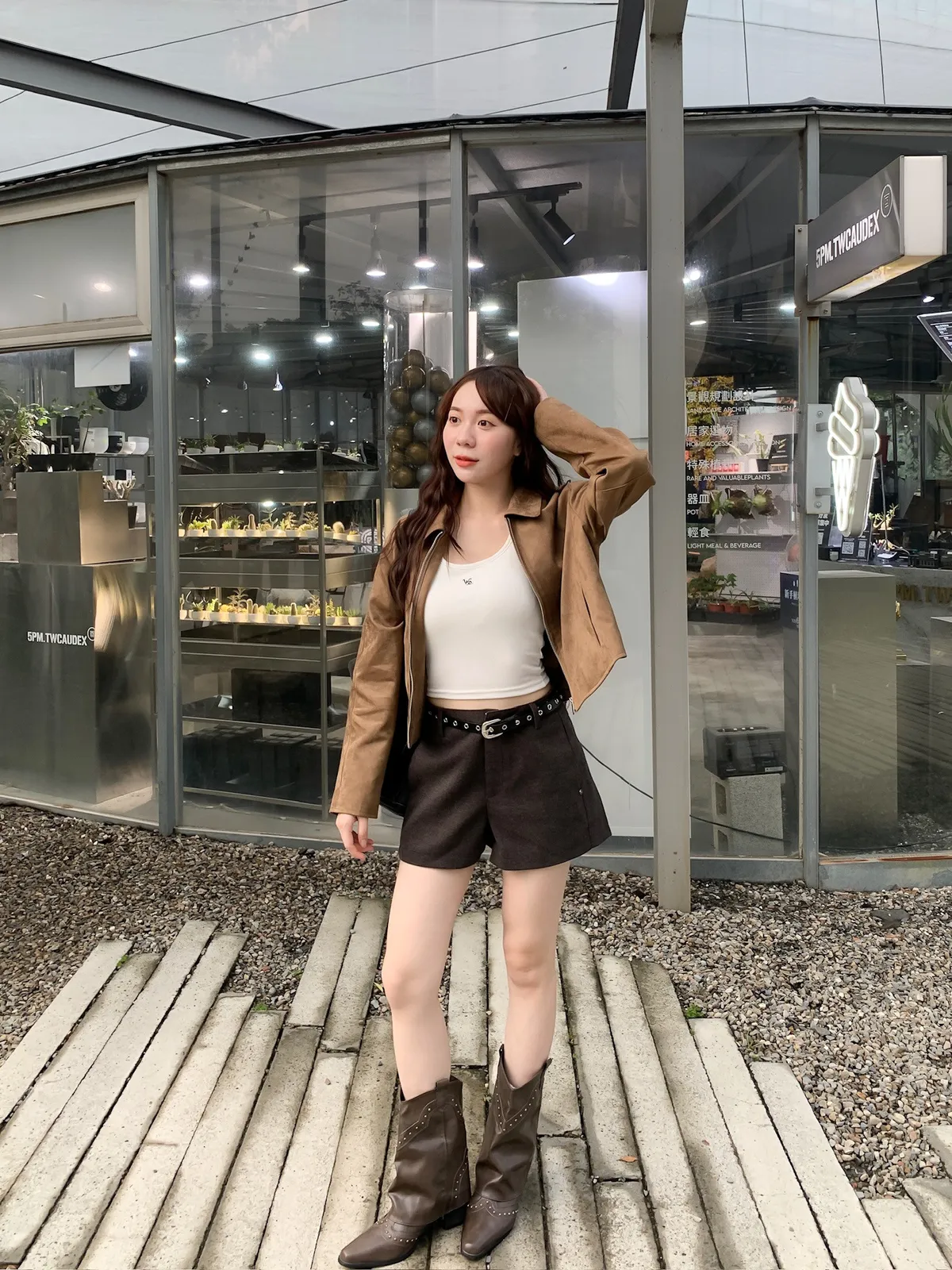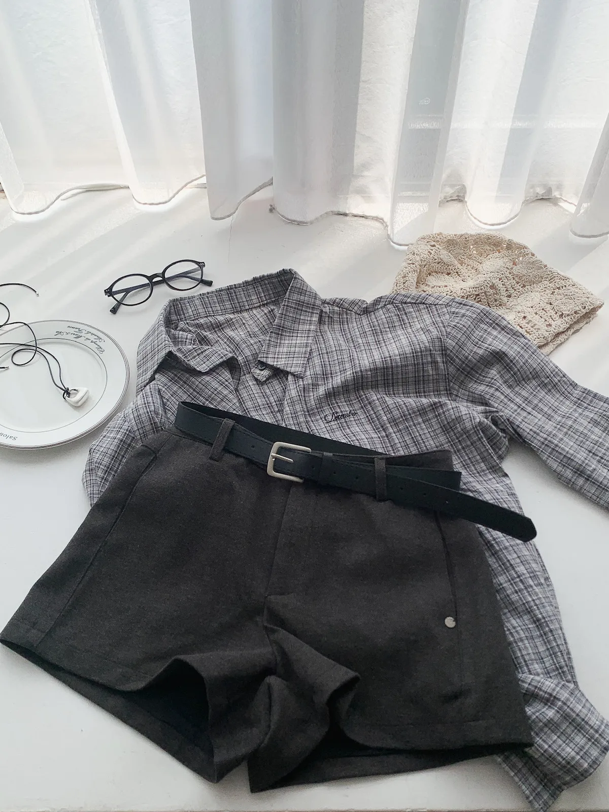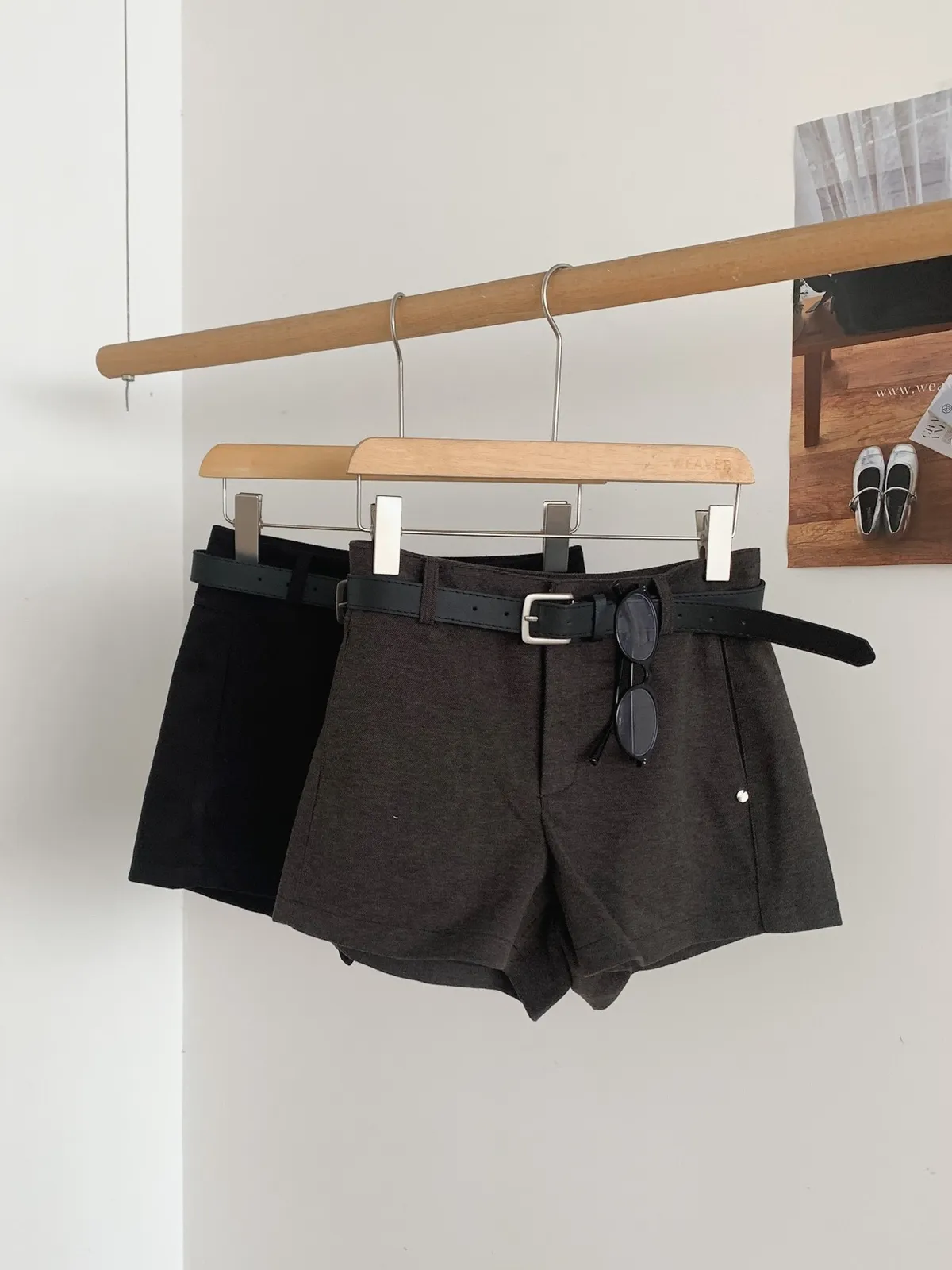 必須擁有!附皮帶金屬小標高腰毛呢短褲