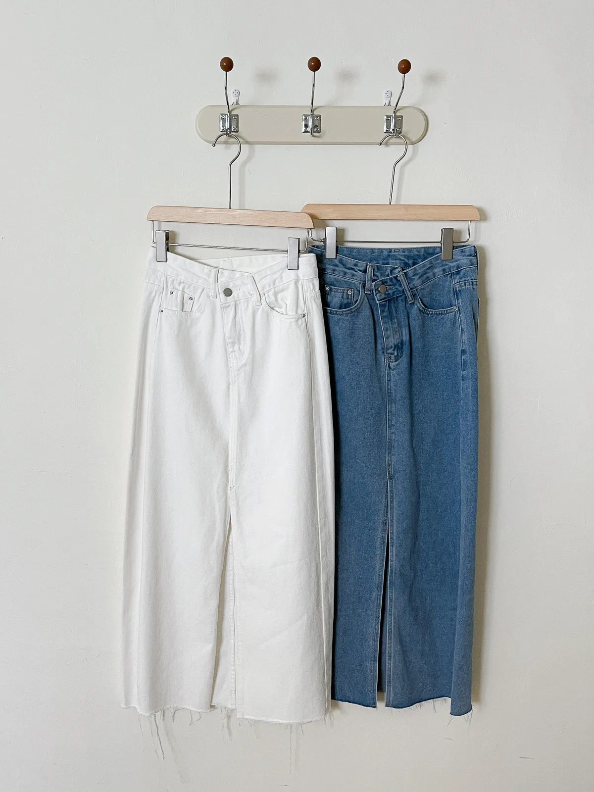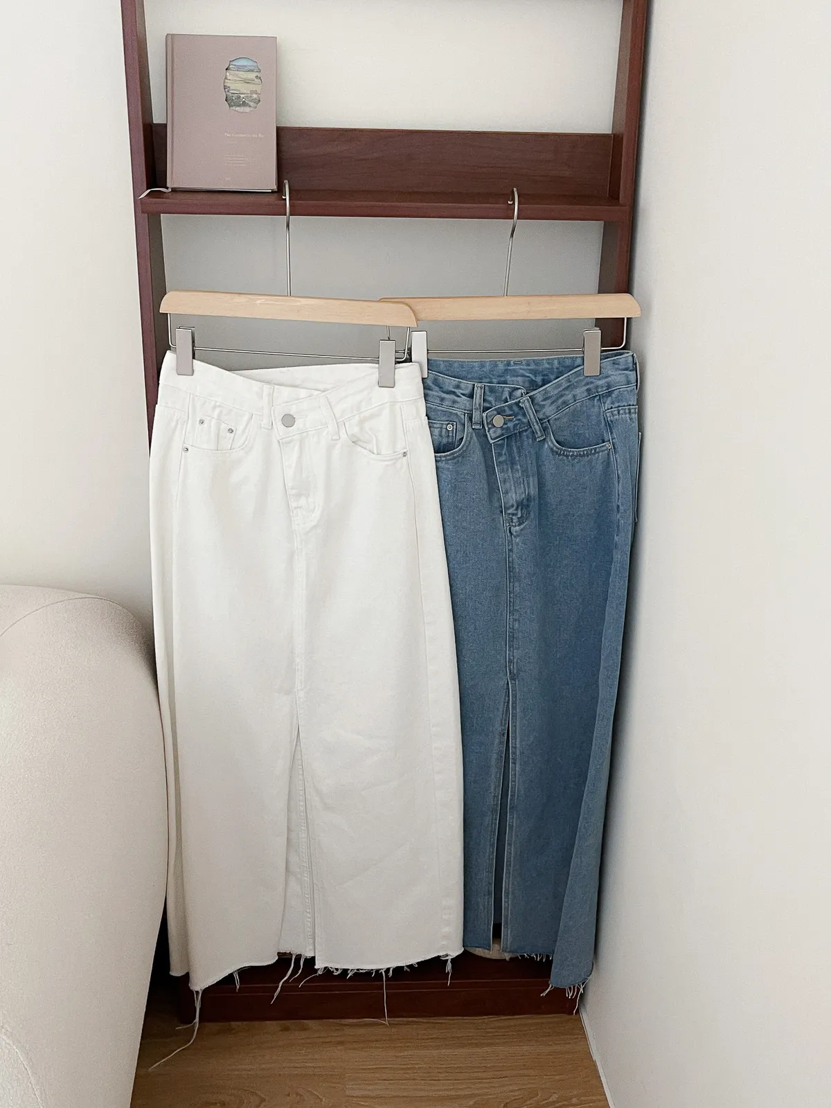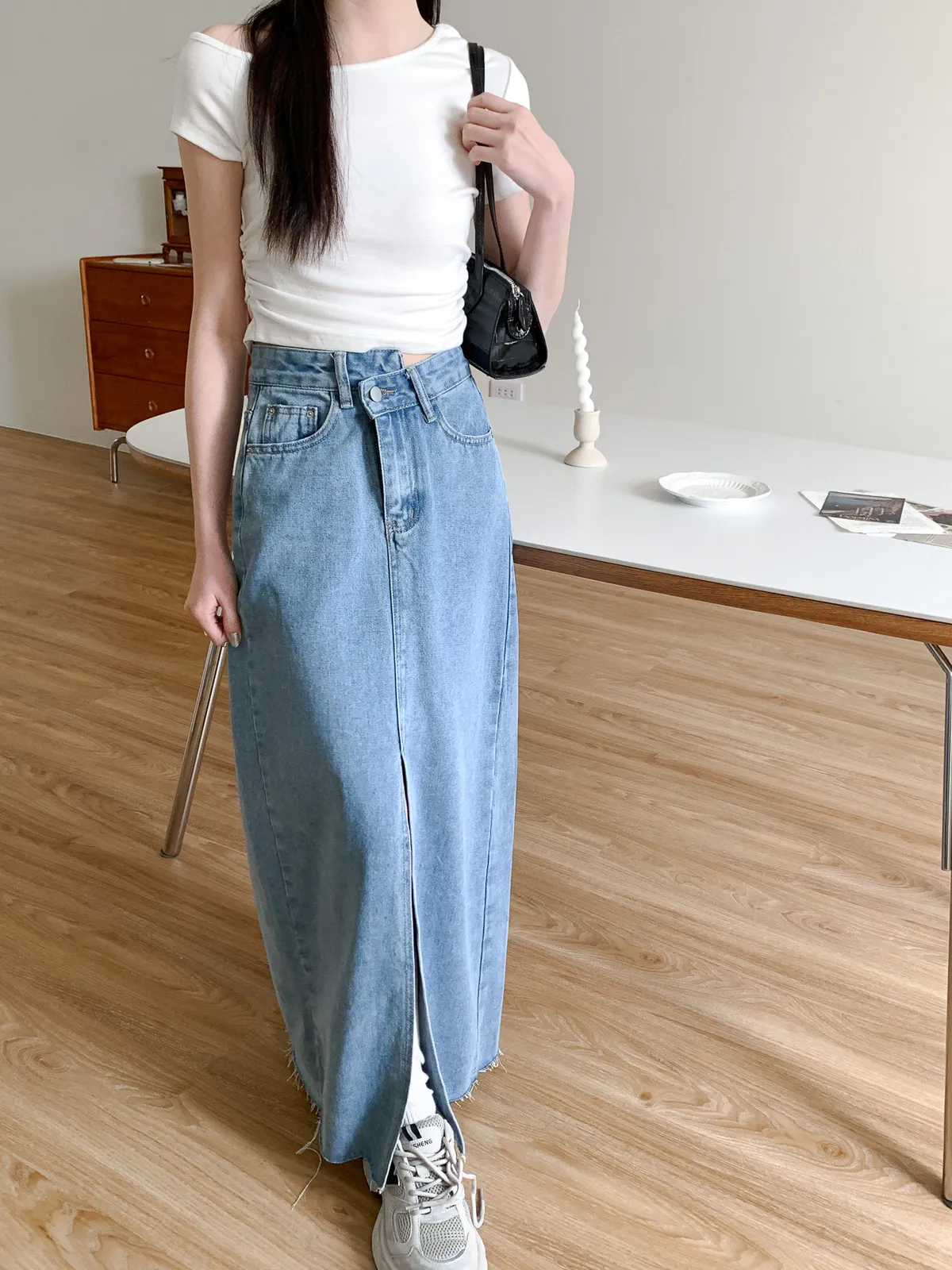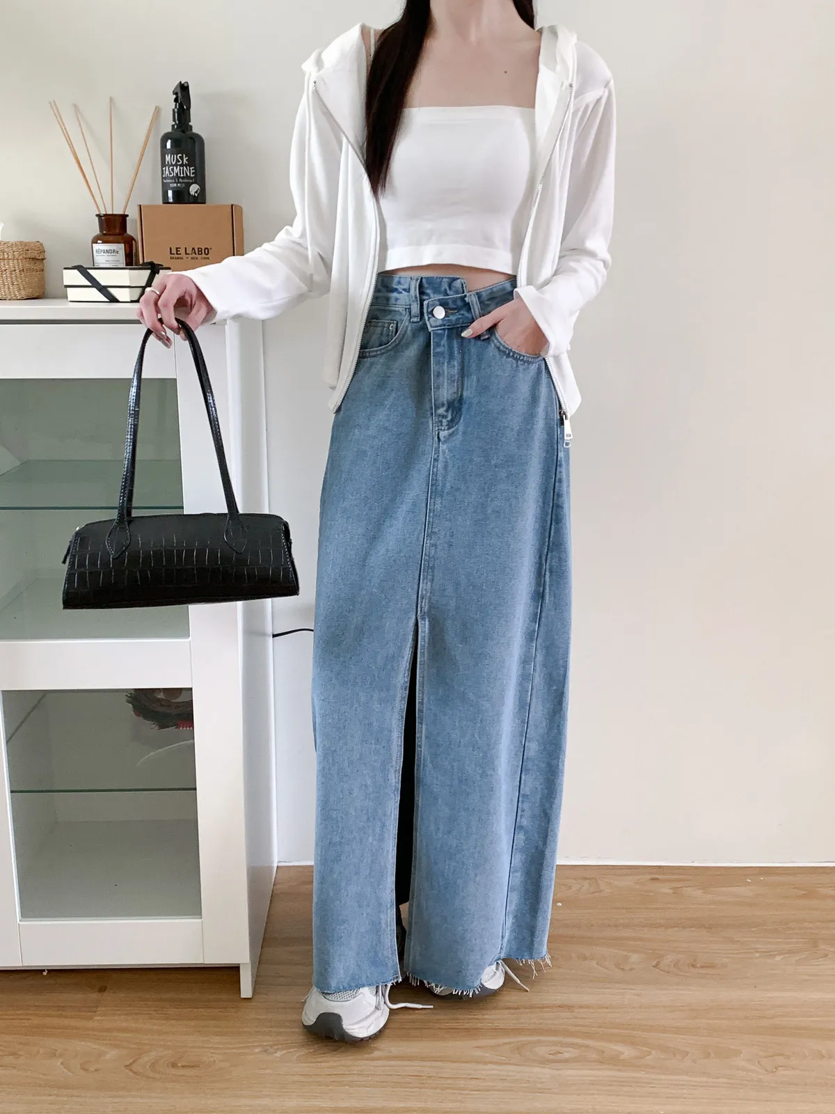 絕美斜釦設計/前開岔抽鬚牛仔長裙