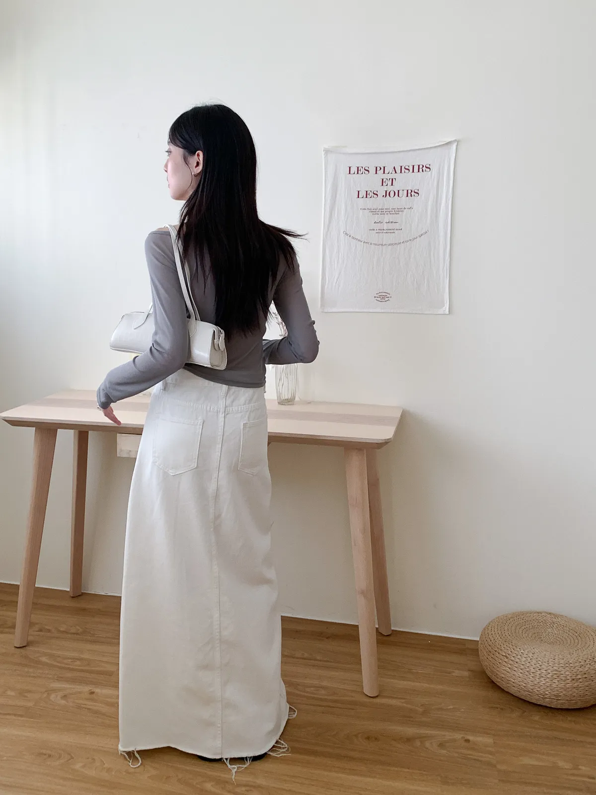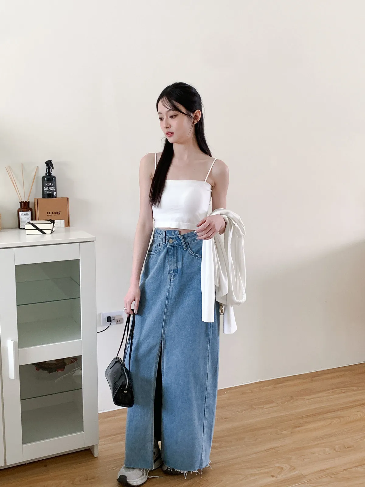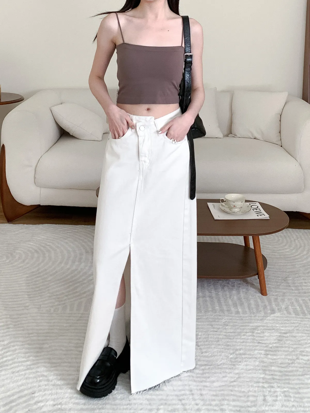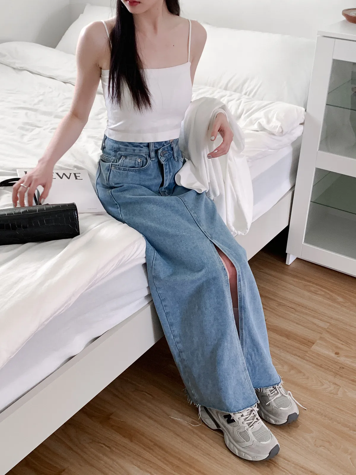 絕美斜釦設計/前開岔抽鬚牛仔長裙