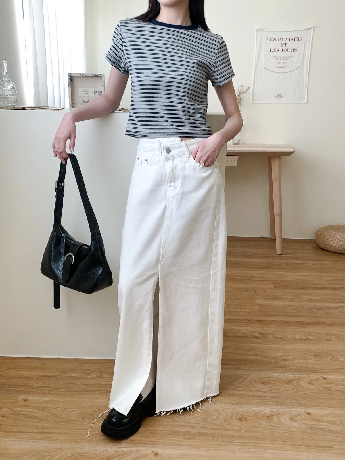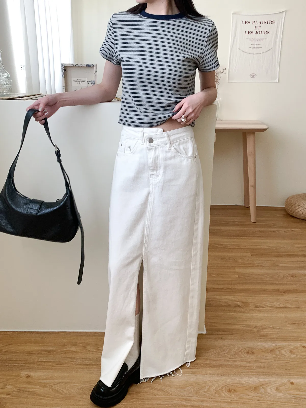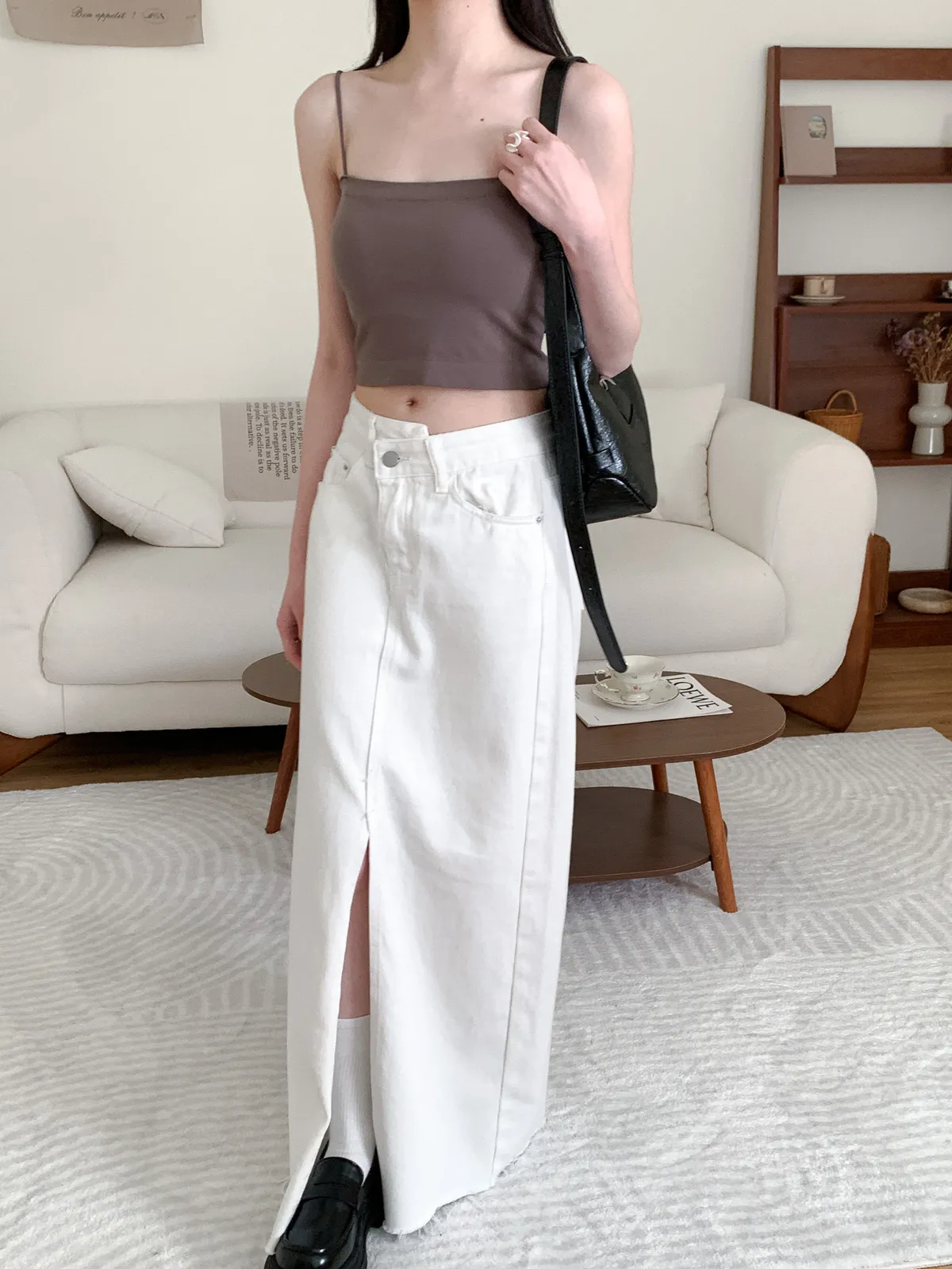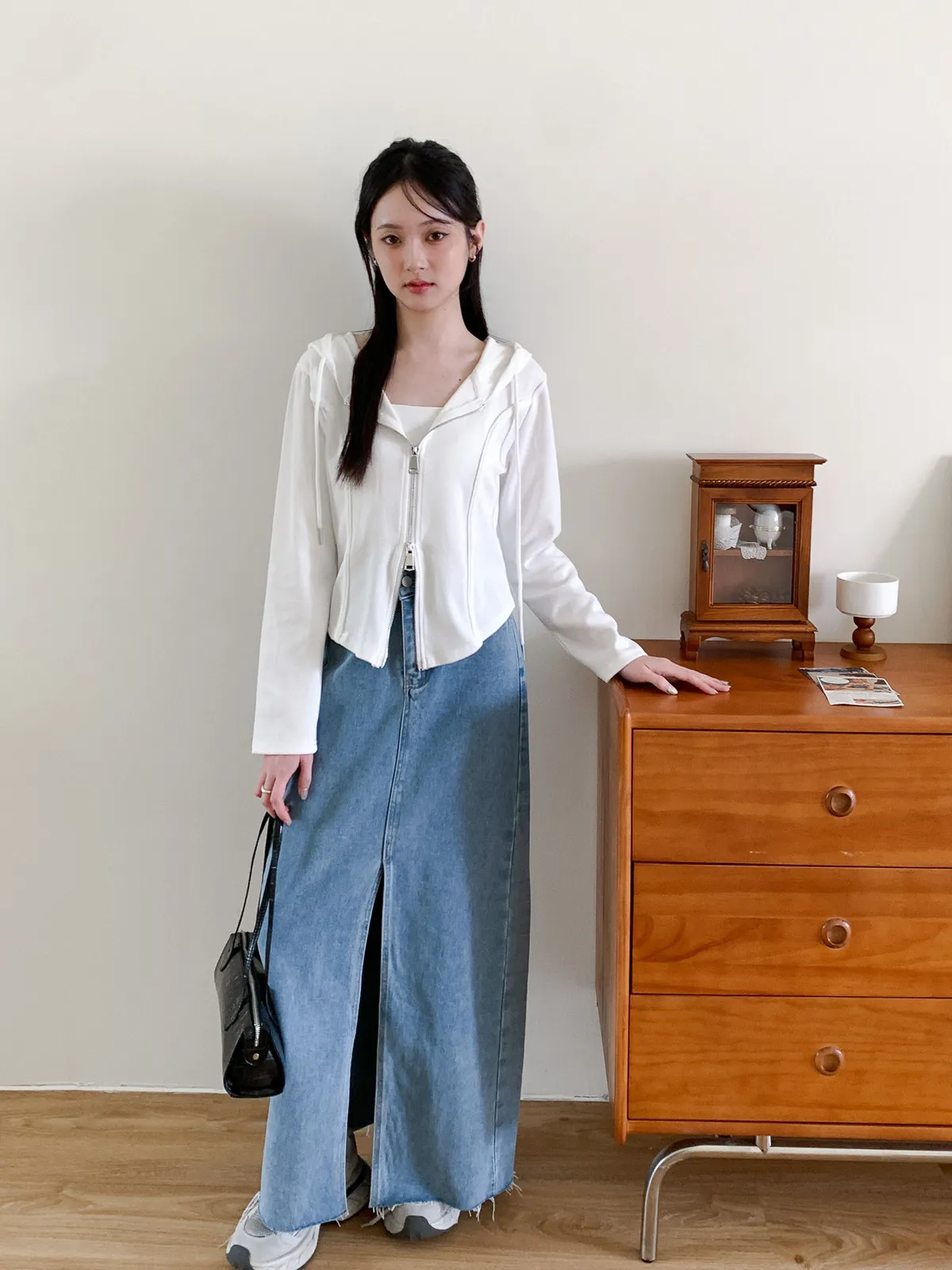 絕美斜釦設計/前開岔抽鬚牛仔長裙
