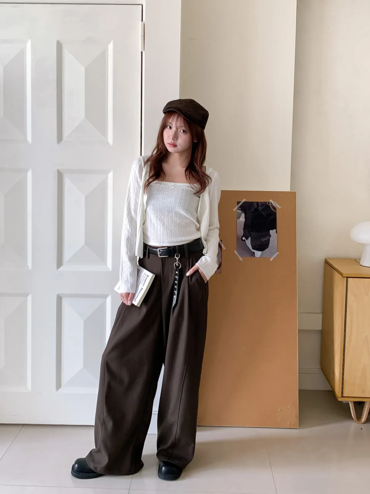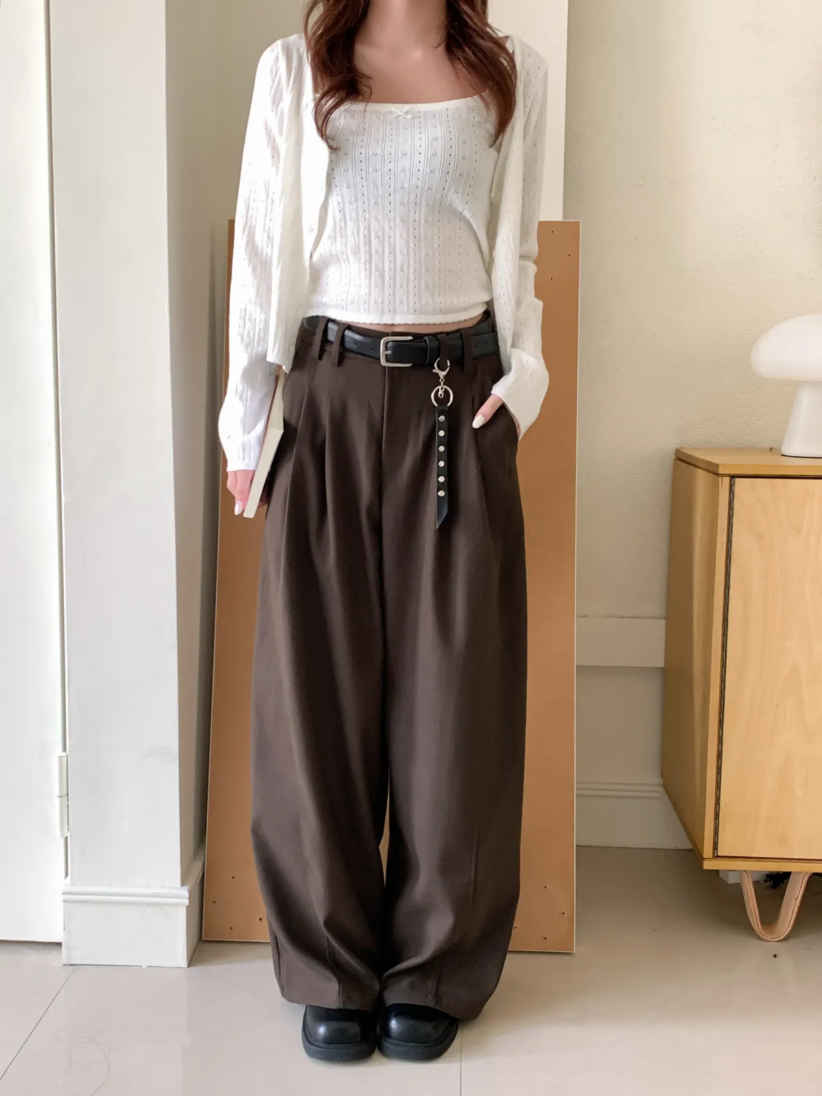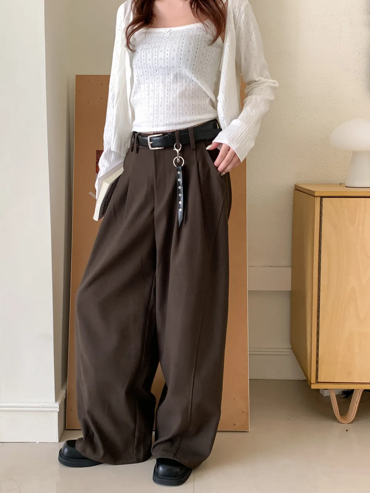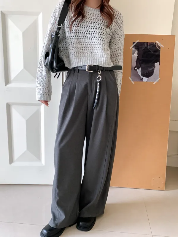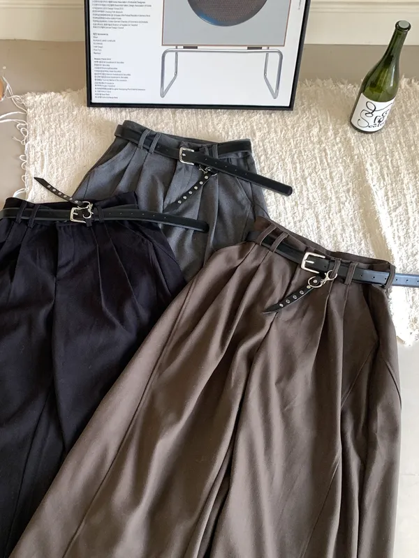 秋天氛圍/毛呢打褶直筒寬褲(附皮帶)