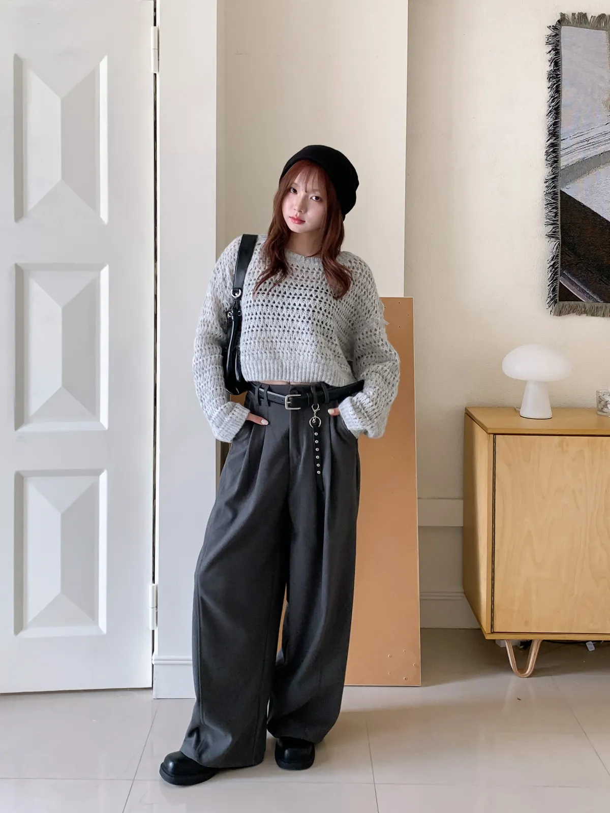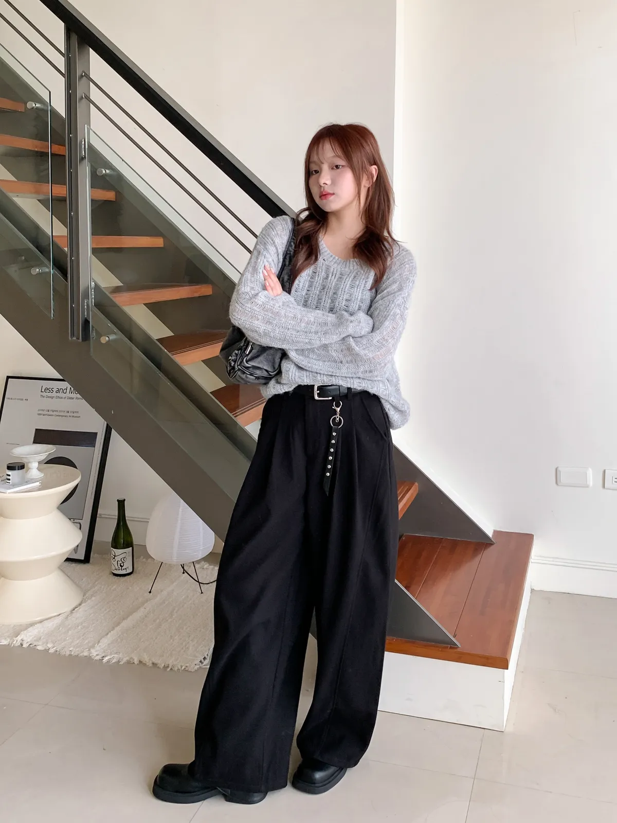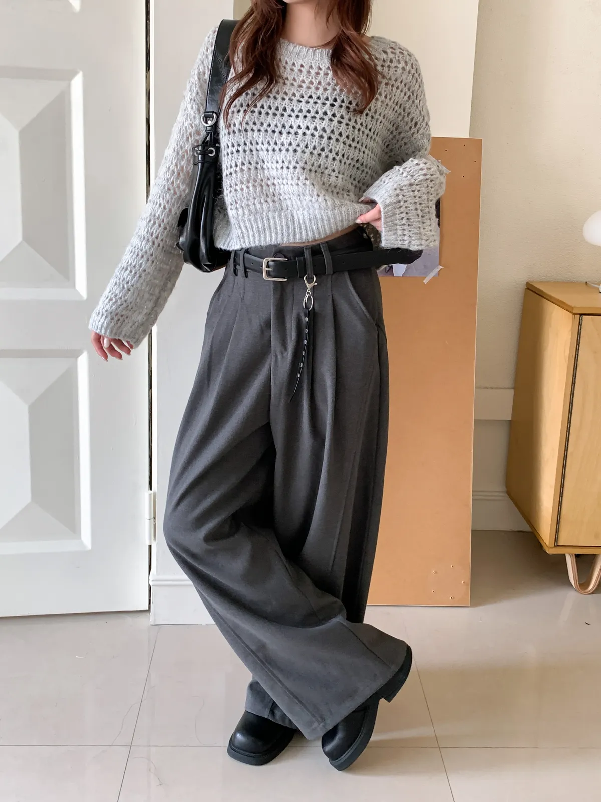 秋天氛圍/毛呢打褶直筒寬褲(附皮帶)