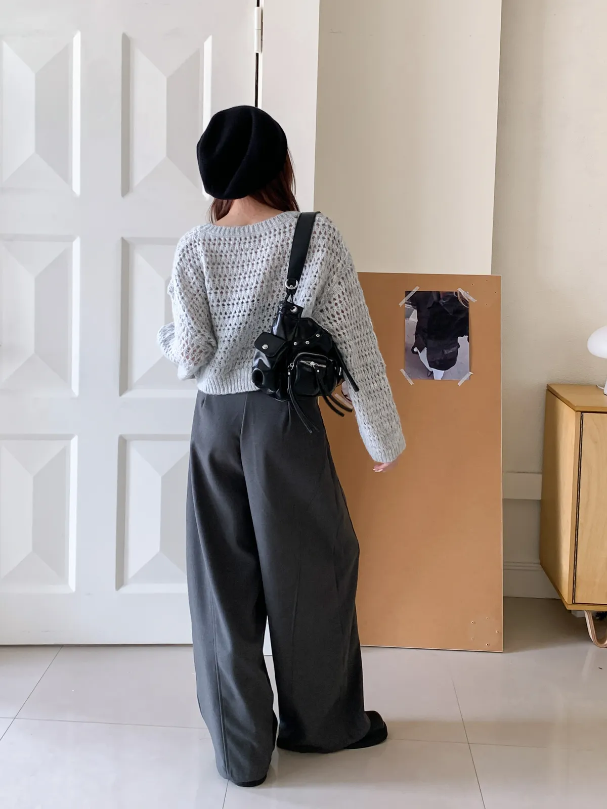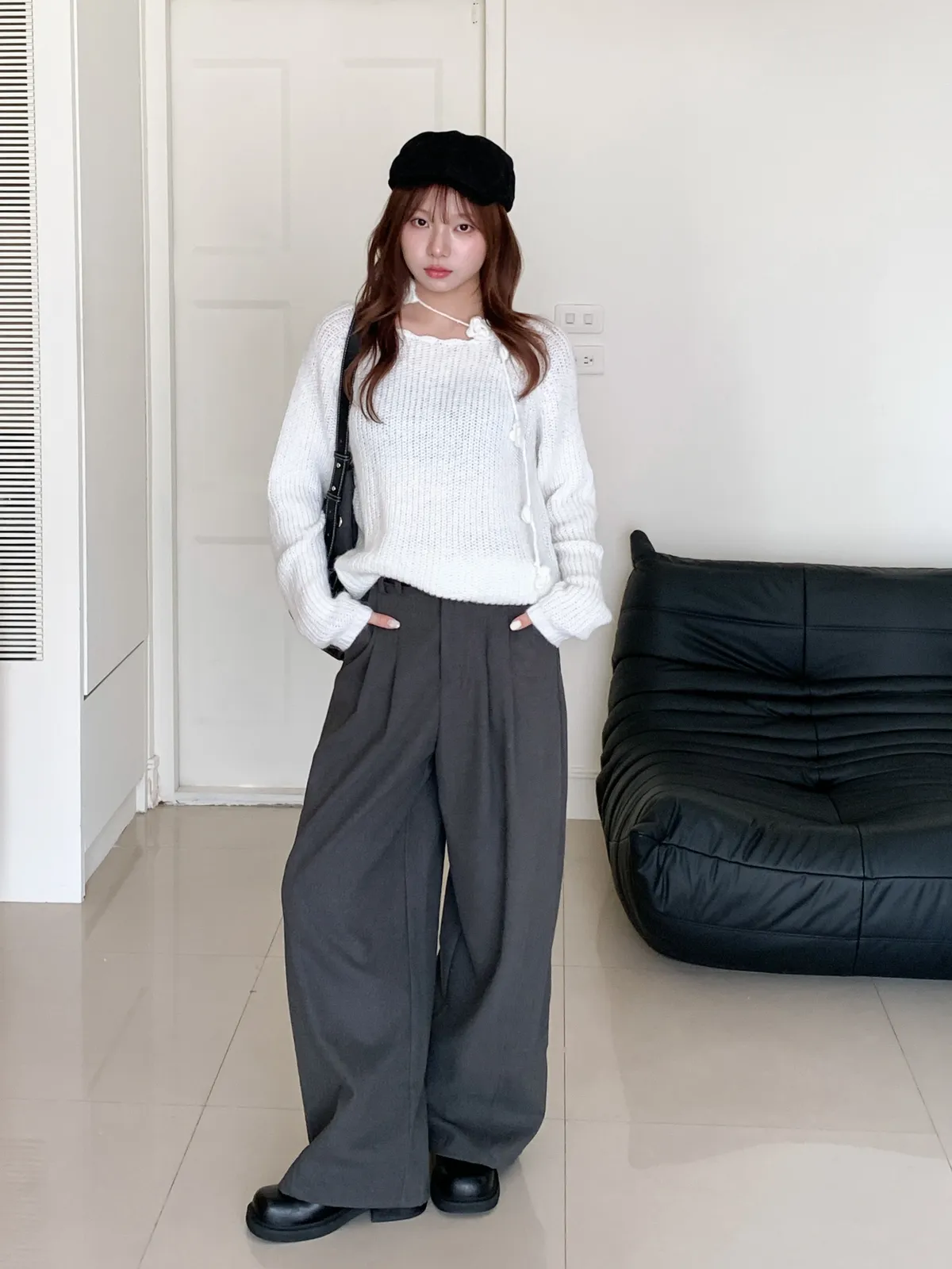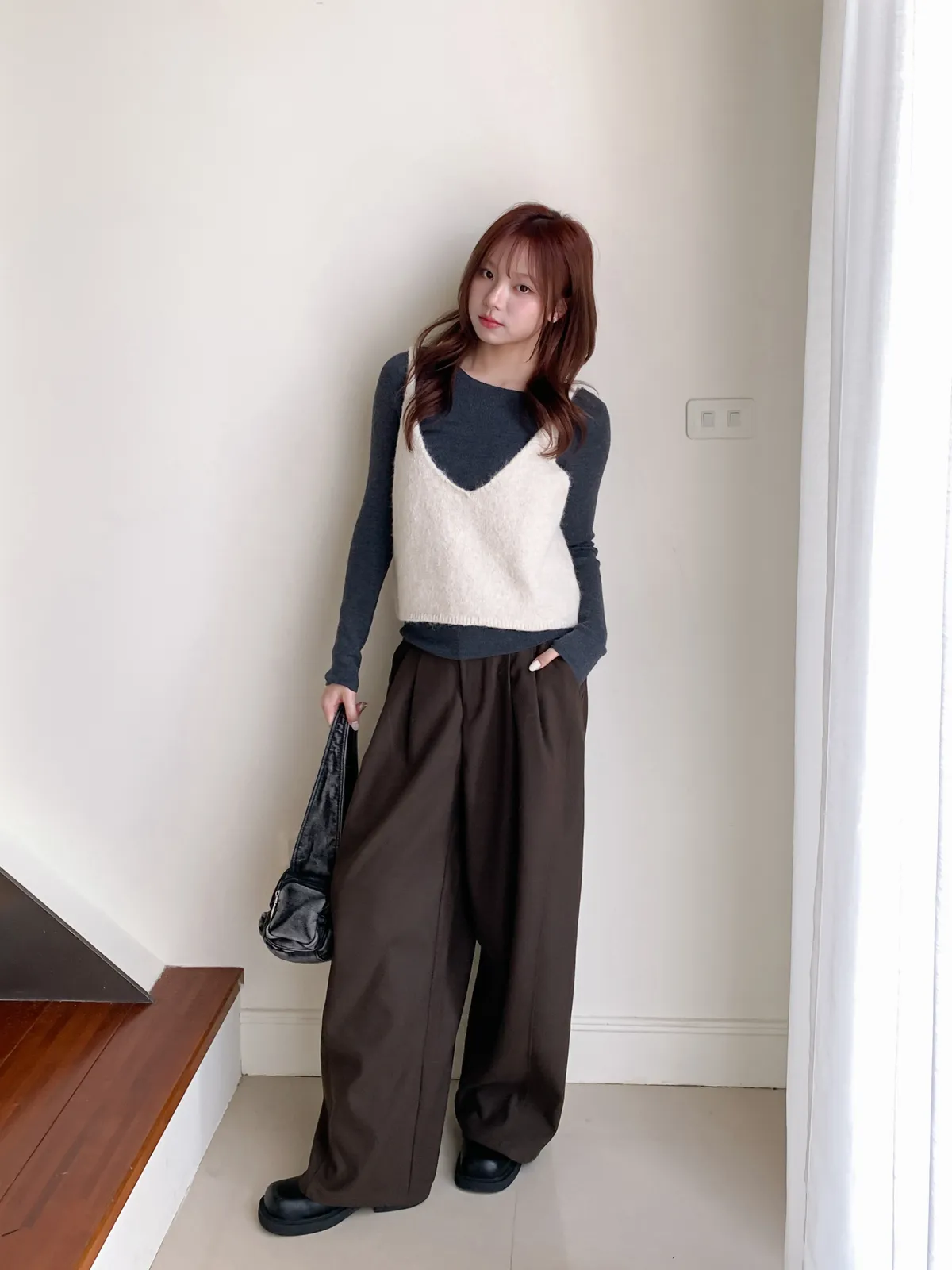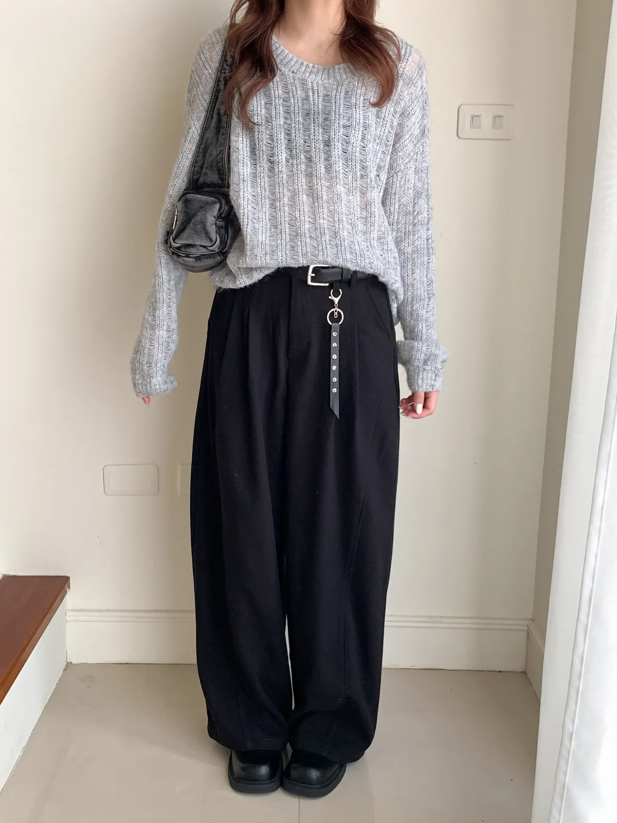 秋天氛圍/毛呢打褶直筒寬褲(附皮帶)