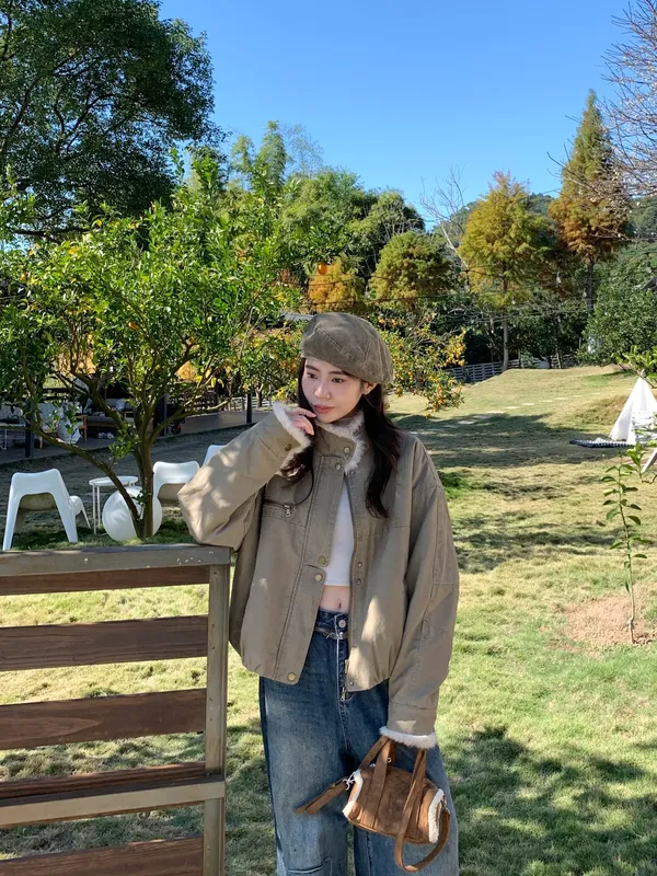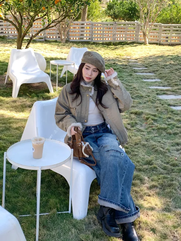 率性毛絨領片斜紋騎士外套(內鋪羔羊毛毛)