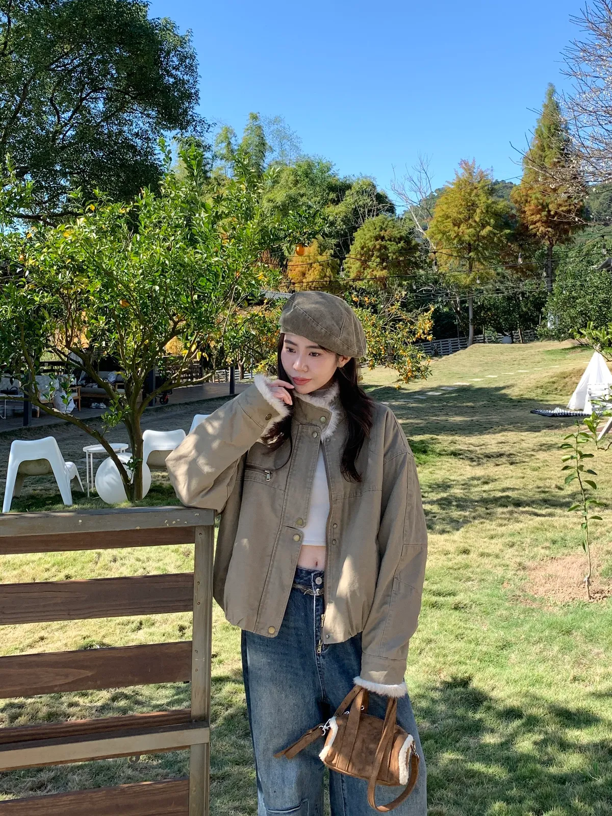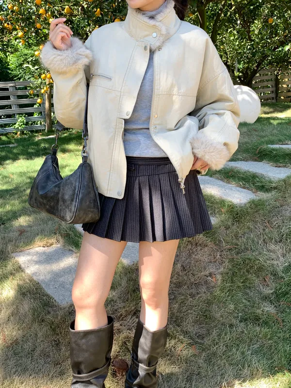 率性毛絨領片斜紋騎士外套