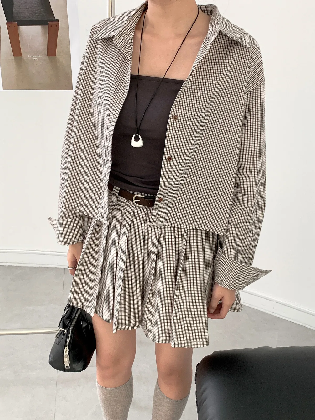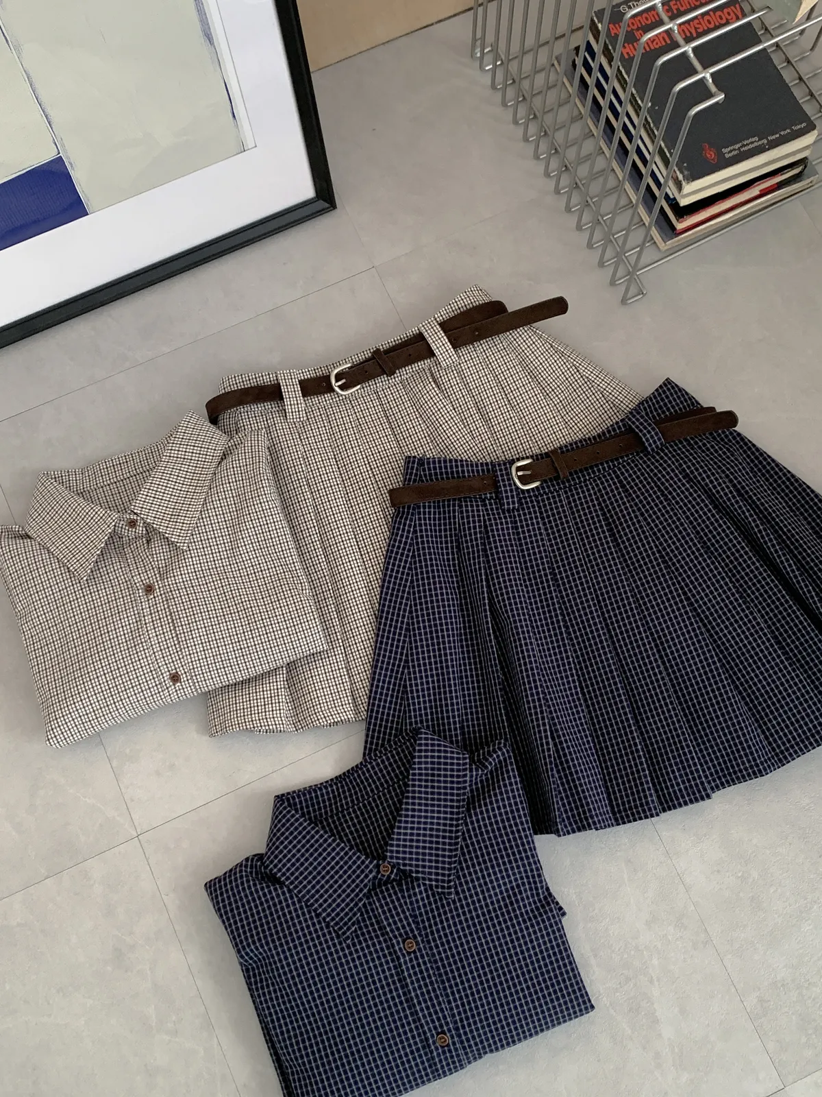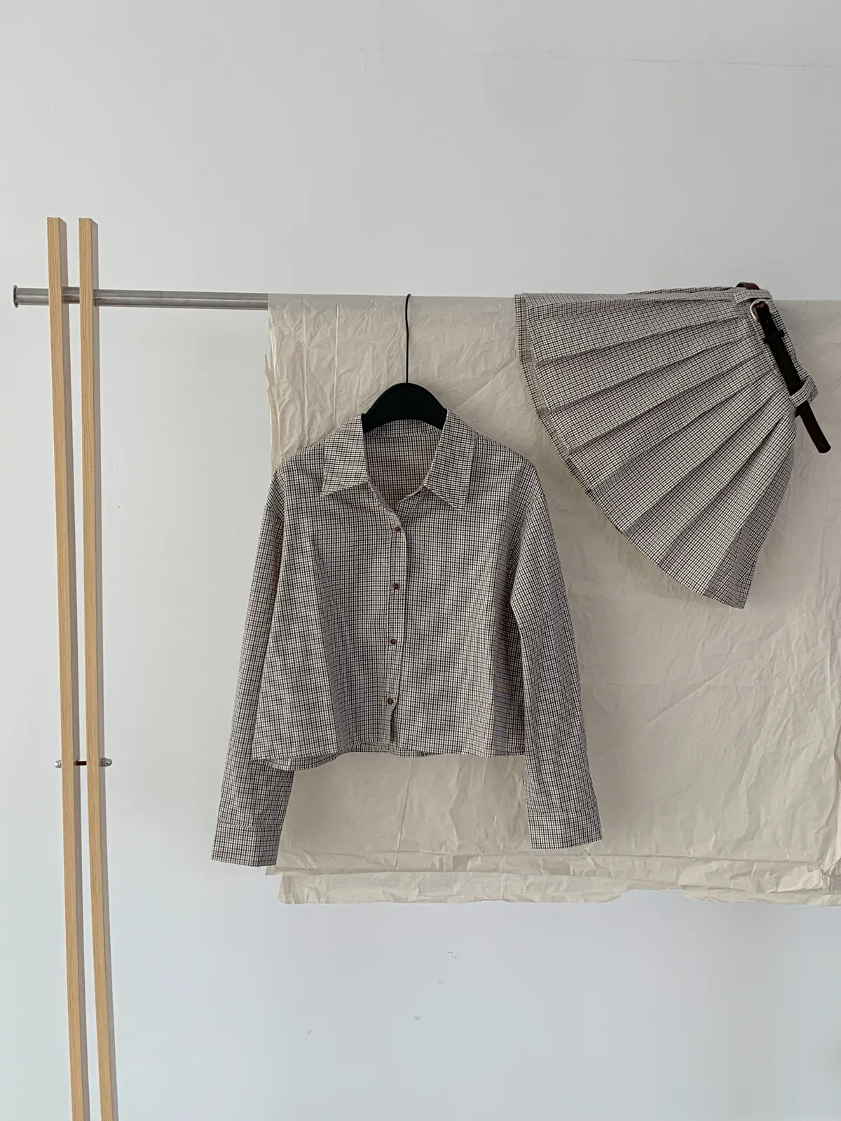 浪漫倫敦|復古感細格紋短版襯衫套裝