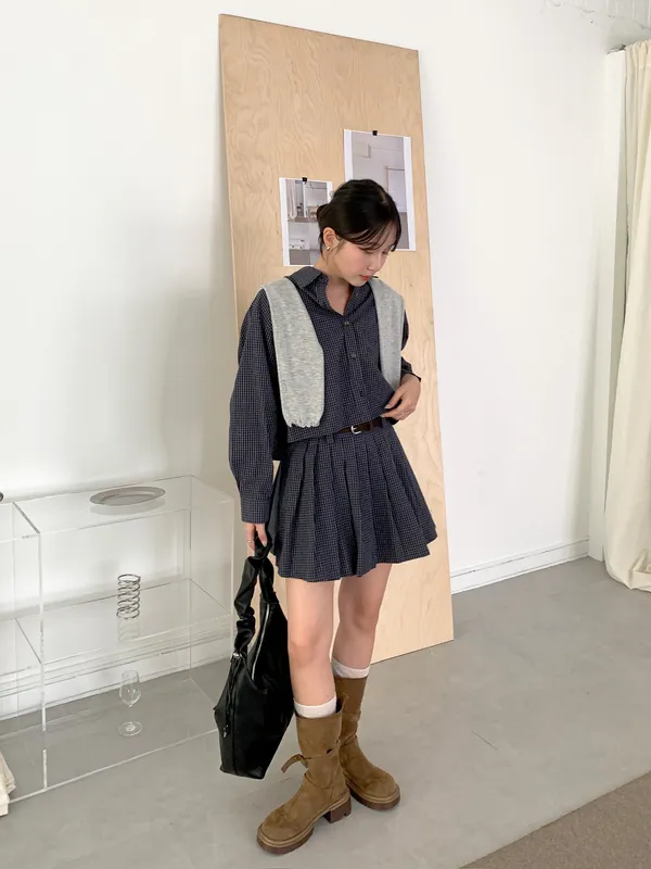 小格紋設計 裙子做百摺款式帶點學院感 附皮帶超加分!