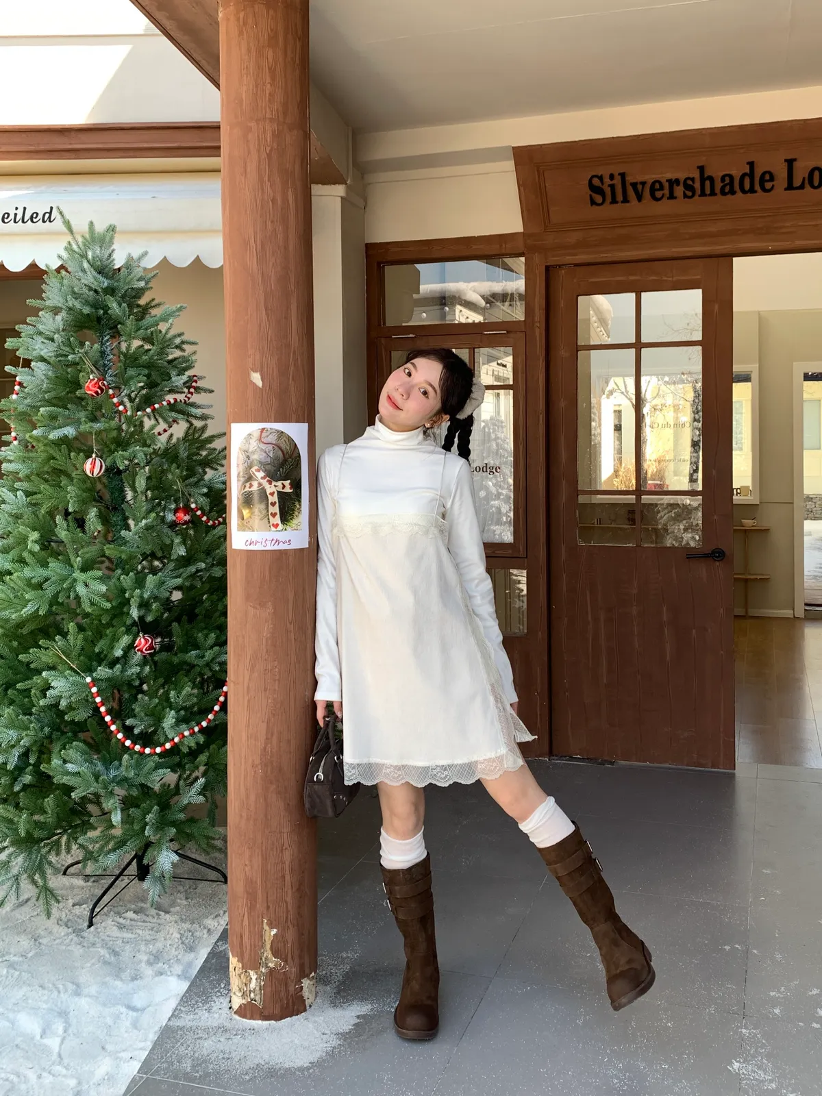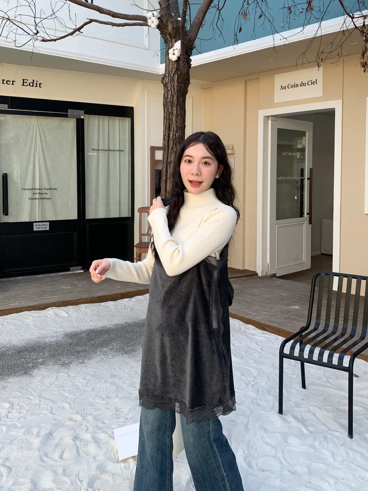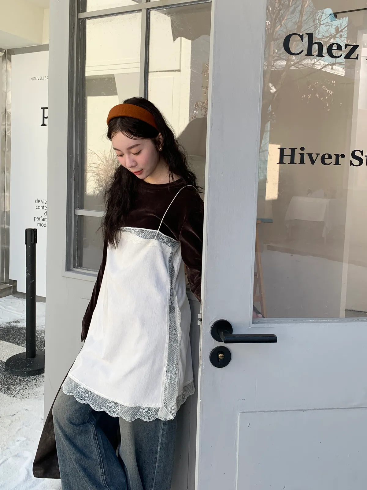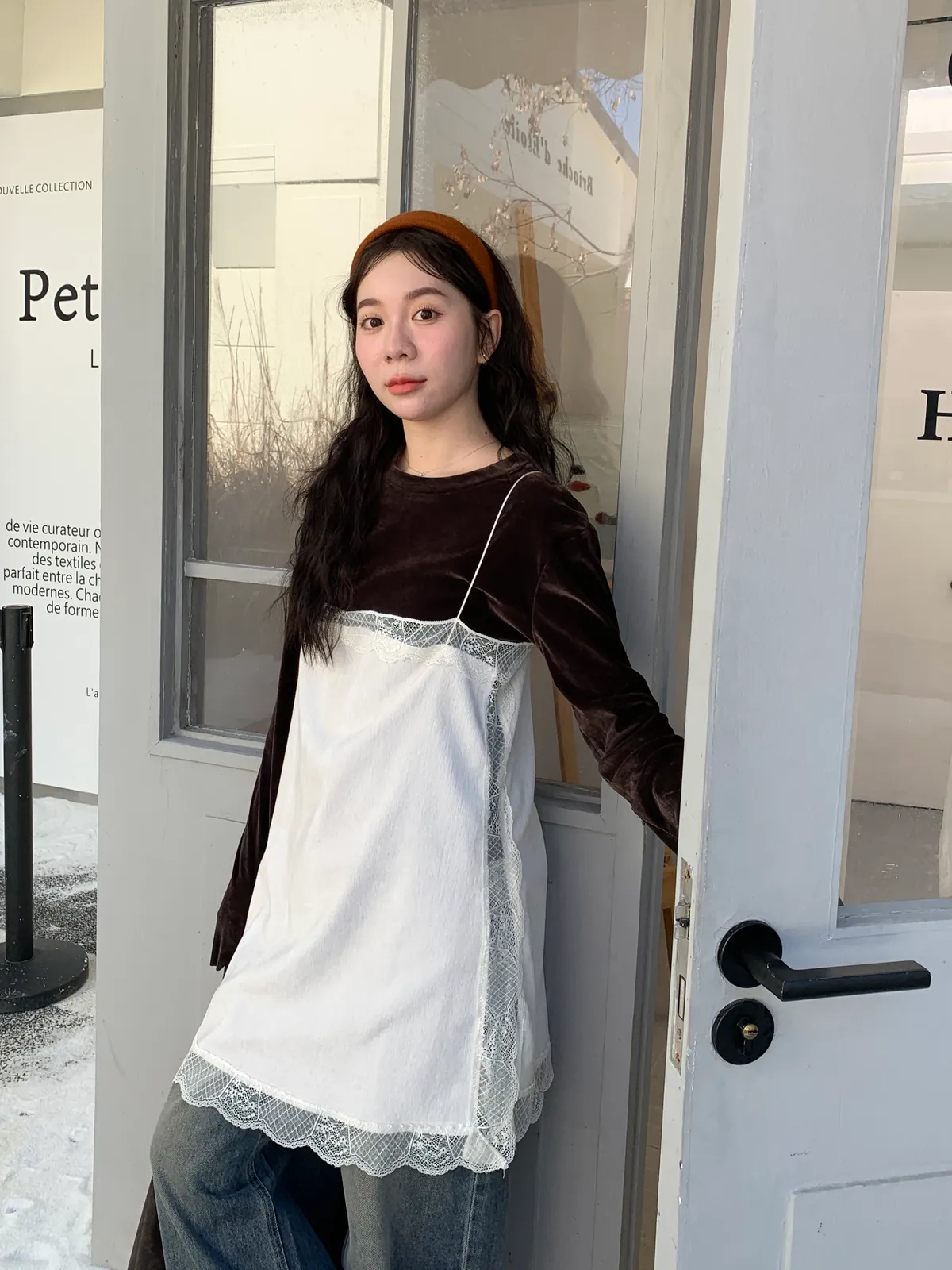 怦然心動|蕾絲拼接絲絨感細肩短洋裝